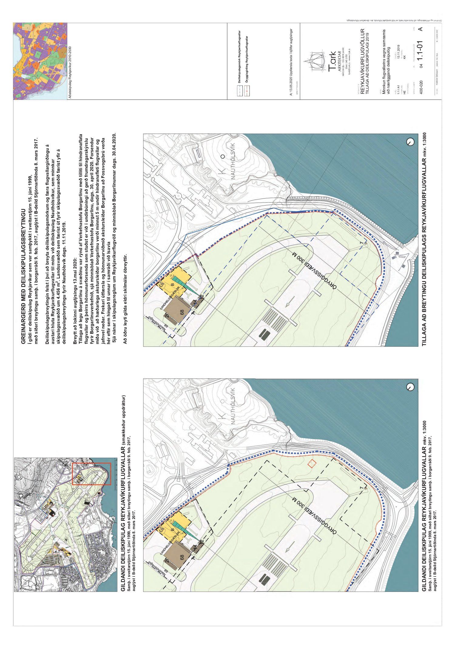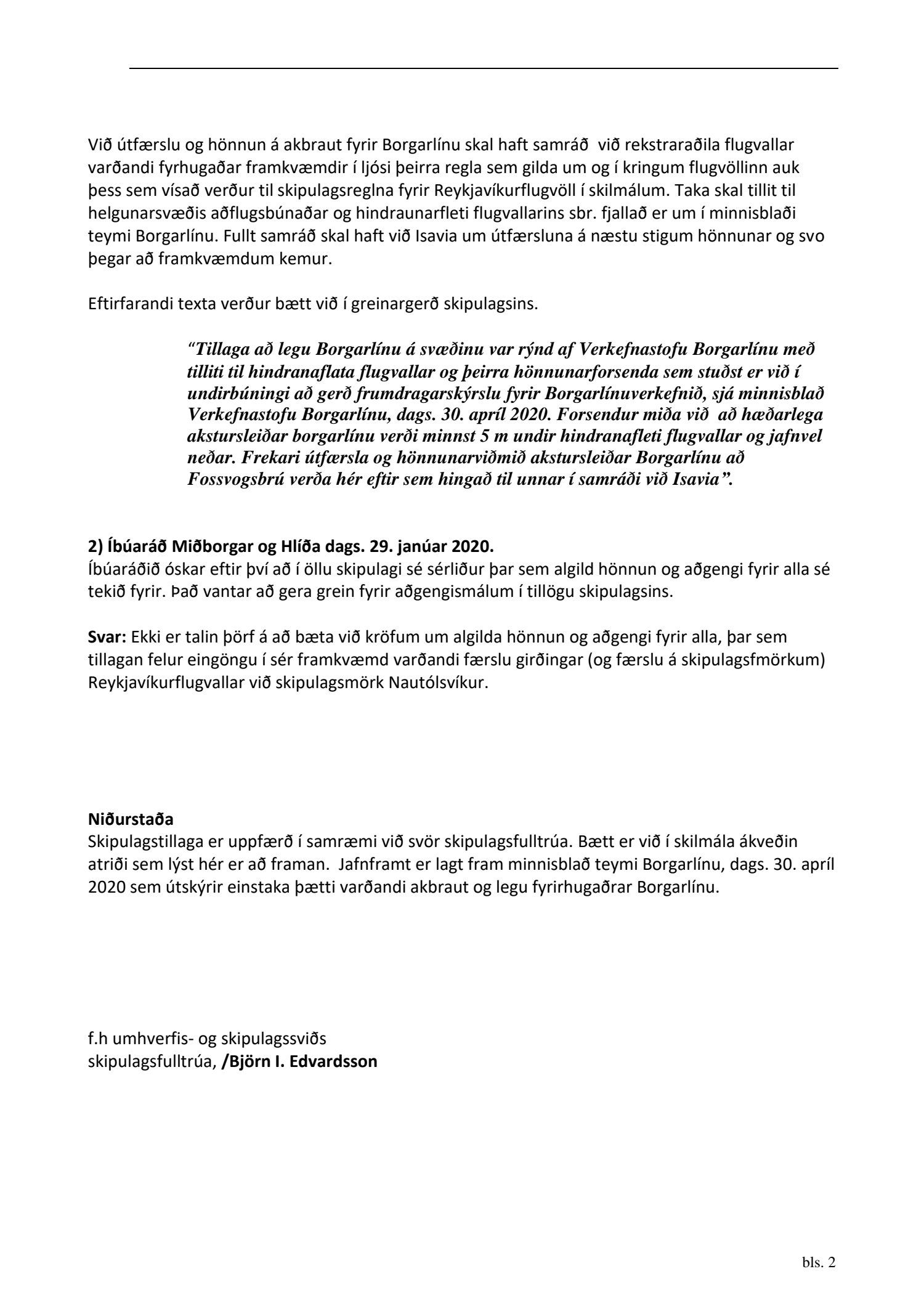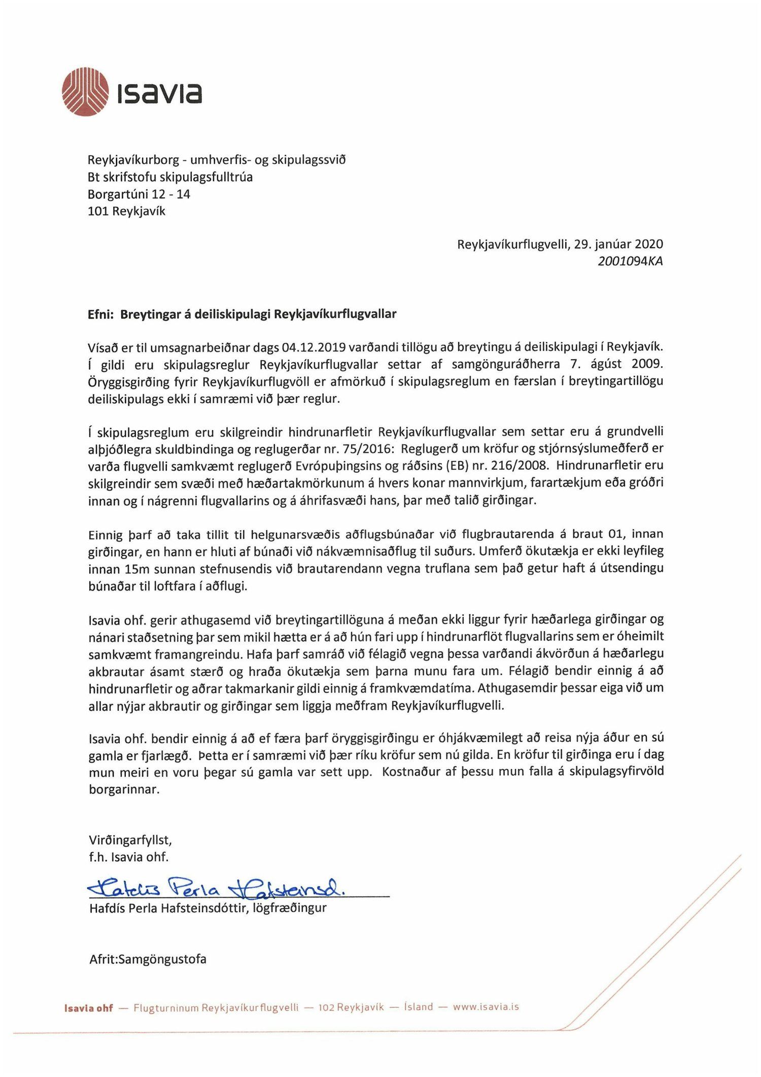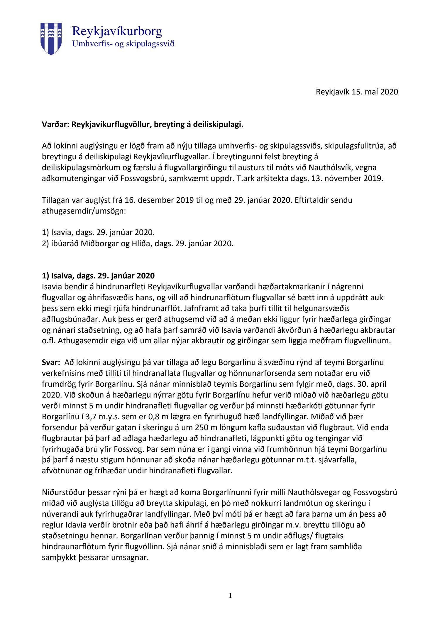 Lögð fram að nýju tillaga umhverfis- og skipulagssviðs, skipulagsfulltrúa, að breytingu á deiliskipulagi Reykjavíkurflugvallar. Í breytingunni felst breyting á deiliskipulagsmörkum og færslu á flugvallargirðingu til austurs til móts við Nauthólsvík, vegna aðkomutengingar við Fossvogsbrú, samkvæmt uppdr. T.ark arkitekta dags. 13. nóvember 2019 br. 13. maí 2020. Tillagan var auglýst frá 16. desember 2019 til og með 29. janúar 2020. Eftirtaldir sendu athugasemdir/umsögn: Isavia dags. 29. janúar 2020 og