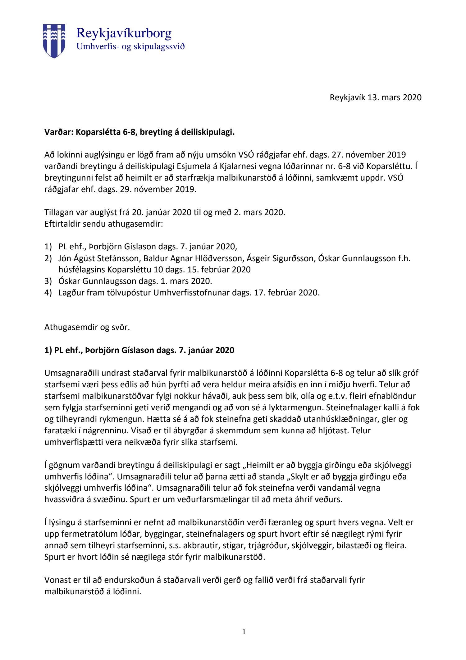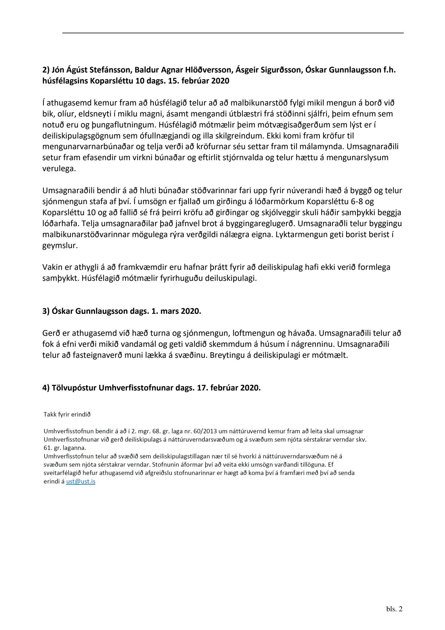 , Þorbjörn Gíslason dags. 7. febrúar 2020, Jón Ágúst Stefánsson, Baldur Agnar Hlöðversson, Ásgeir Sigurðsson, Óskar Gunnlaugsson f.h. húsfélagsins Koparsléttu 10 dags. 15. febrúar 2020 og Óskar Gunnlaugsson dags. 1. mars 2020. Einnig er lagður fram tölvupóstur Umhverfisstofnunar dags. 17. febrúar 2020 og umsögn skipulagsfulltrúa dags. 13. mars 2020.