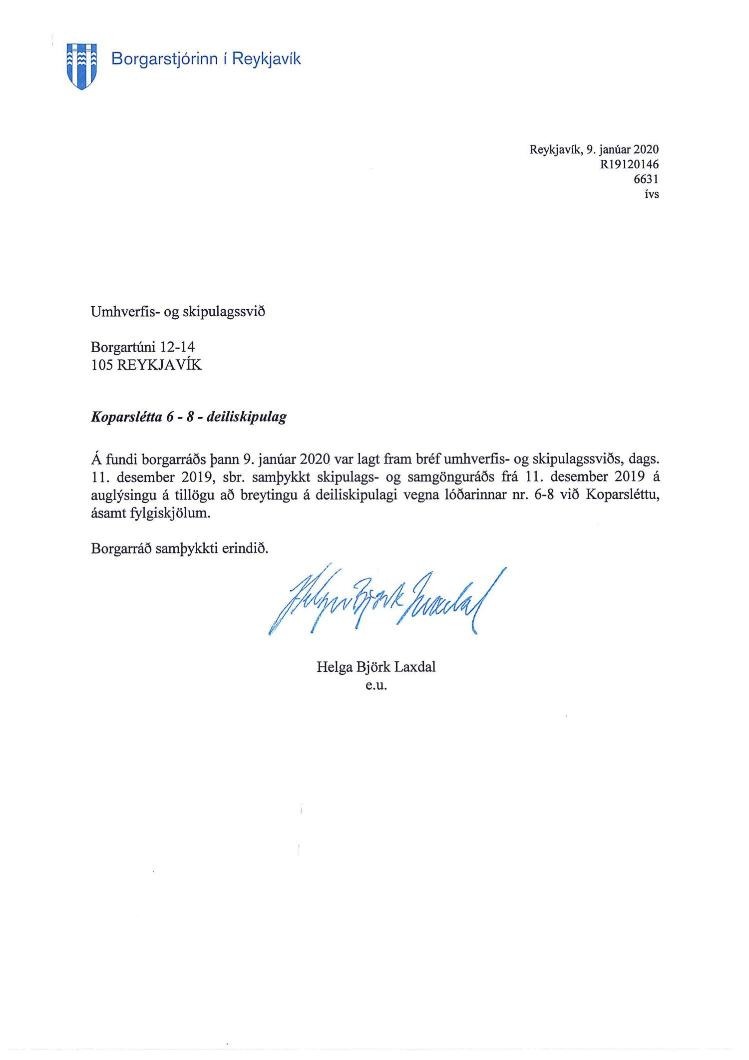 Lagt fram bréf borgarstjóra dags. 9. janúar 2020 vegna samþykktar borgarráðs s.d. á auglýsingu á tillögu að breytingu á deiliskipulagi vegna lóðarinnar nr. 6-8 við Koparsléttu.