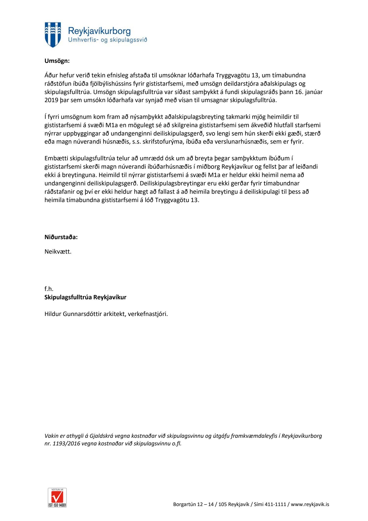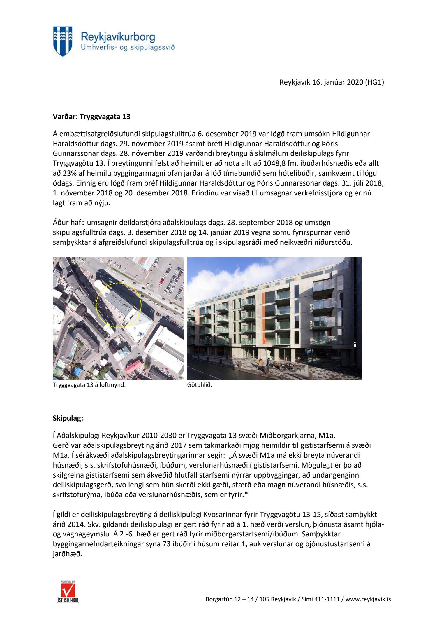 Lögð er fram umsókn Hildigunnar Haraldsdóttur dags. 29. nóvember 2019 ásamt bréfi Hildigunnar Haraldsdóttur og Þóris Gunnarssonar dags. 28. nóvember 2019 varðandi breytingu á skilmálum deiliskipulags fyrir Tryggvagötu 13. Í breytingunni felst að heimilt er að nota allt að 1048,8 fm. íbúðarhúsnæðis eða allt að 23% af heimilu byggingarmagni ofan jarðar á lóð tímabundið sem hótelíbúðir, samkvæmt tillögu ódags. Einnig eru lögð fram bréf Hildigunnar Haraldsdóttur og Þóris Gunnarssonar dags. 31. júlí 2018, 1. nóvember 2018 og 20. desember 2018. Einnig er lögð fram umsögn skipulagsfulltrúa dags. 16. janúar 2020.