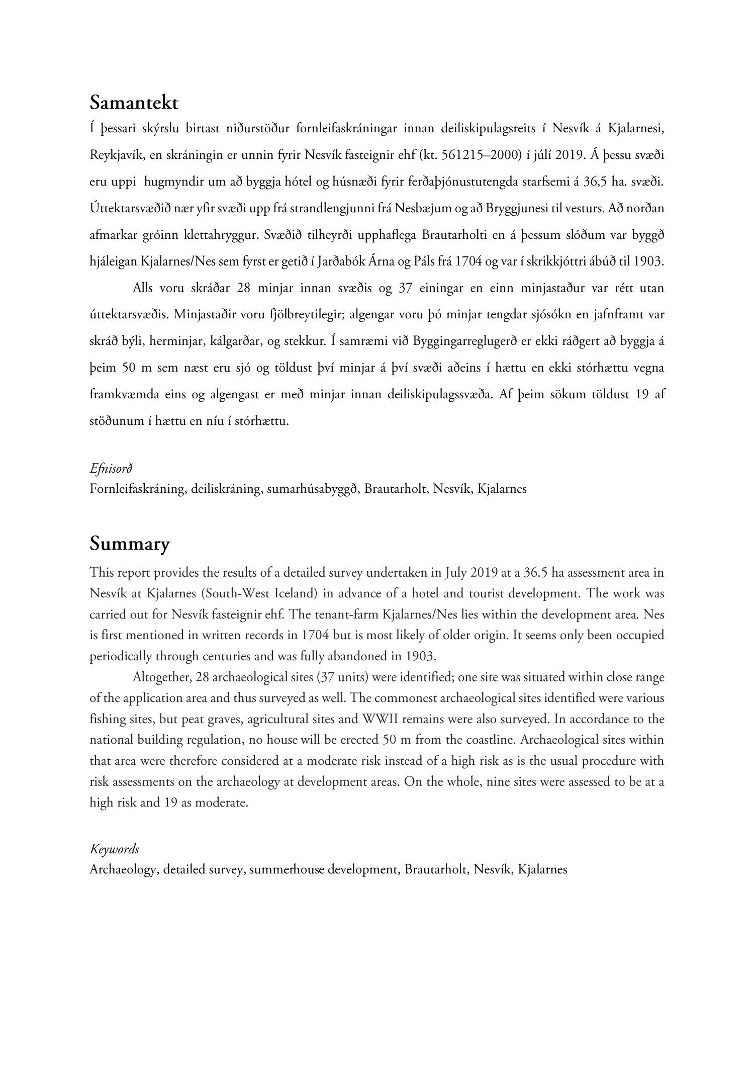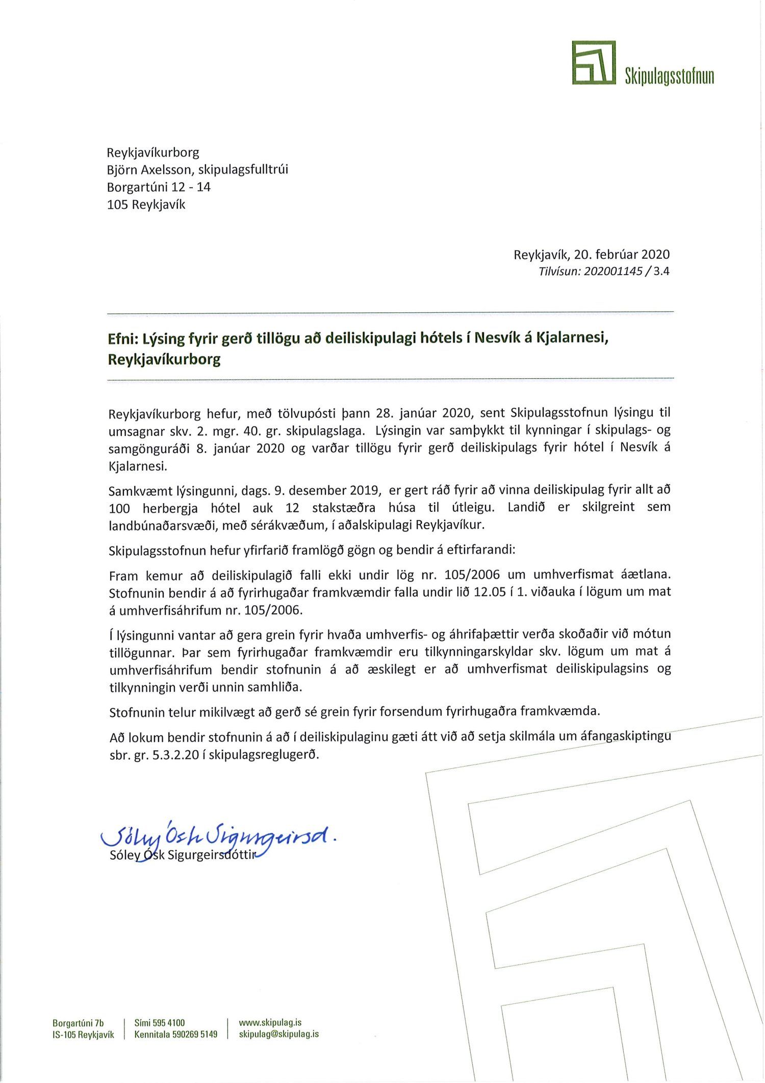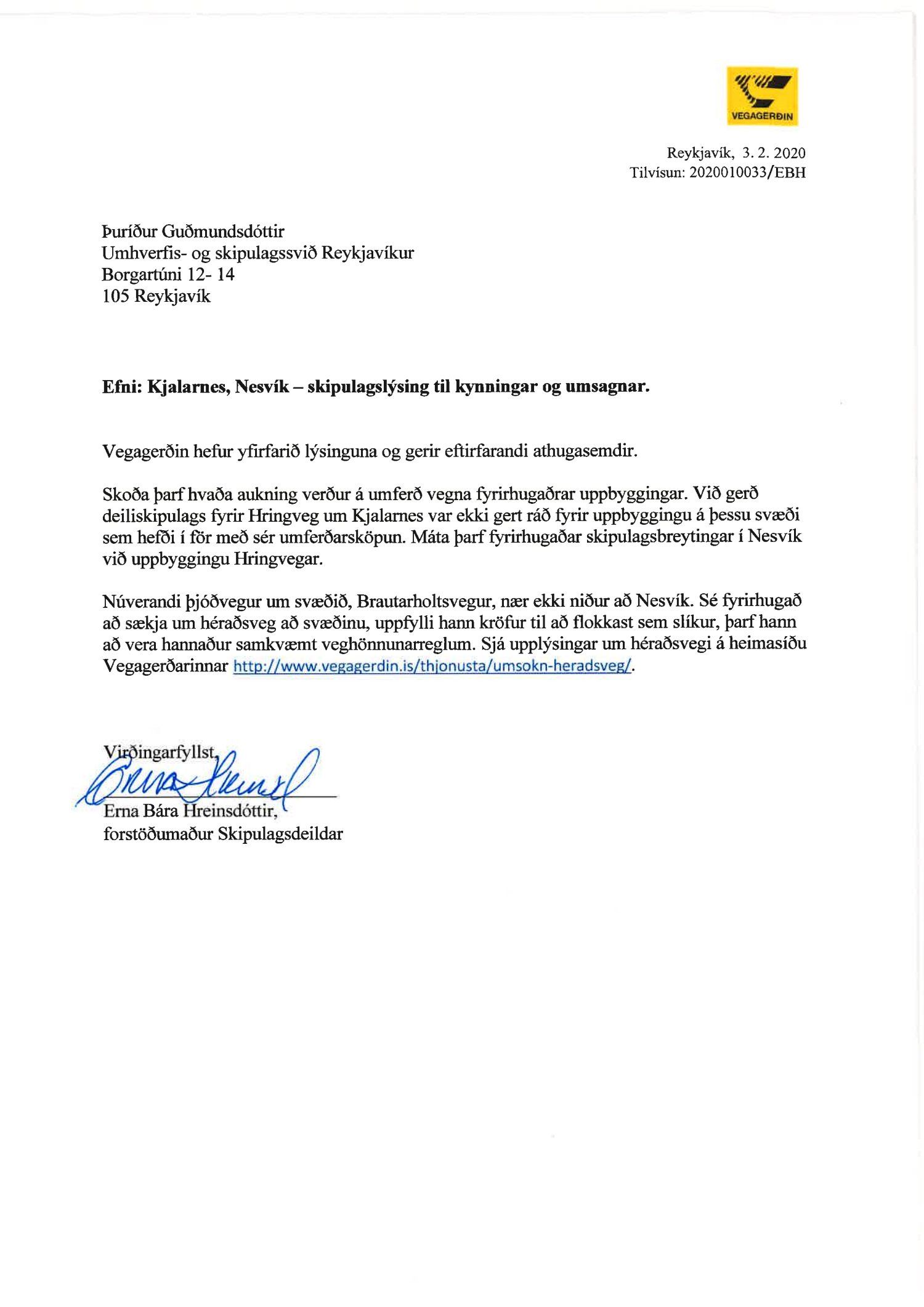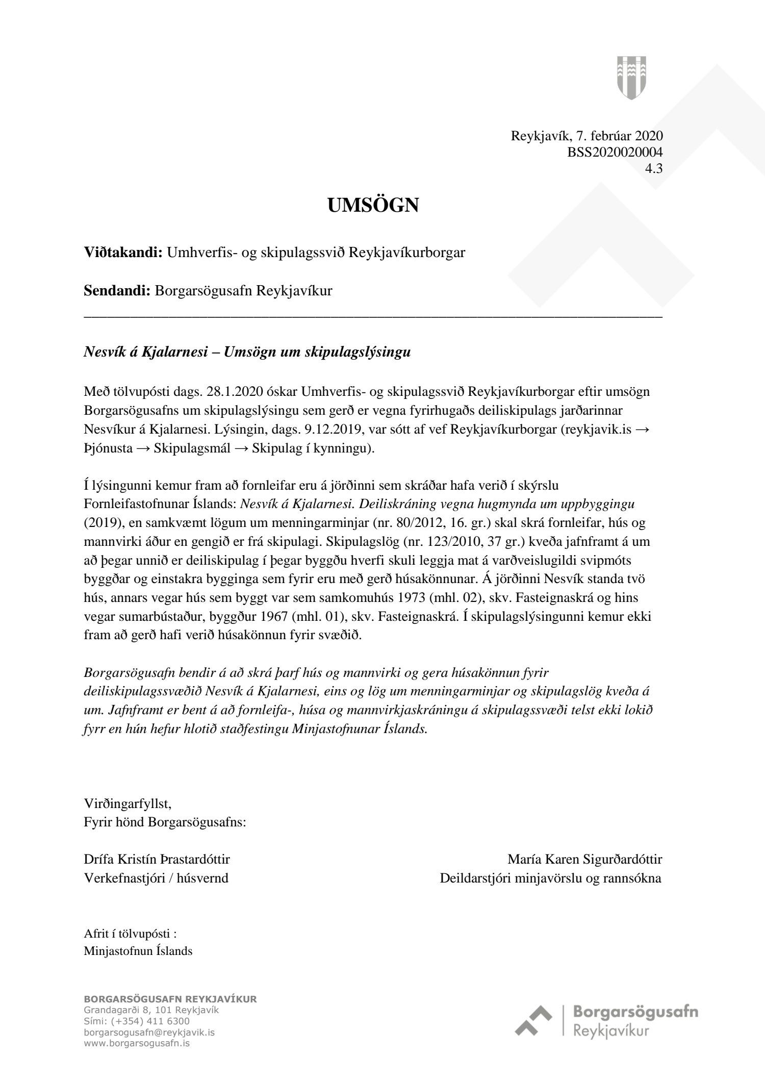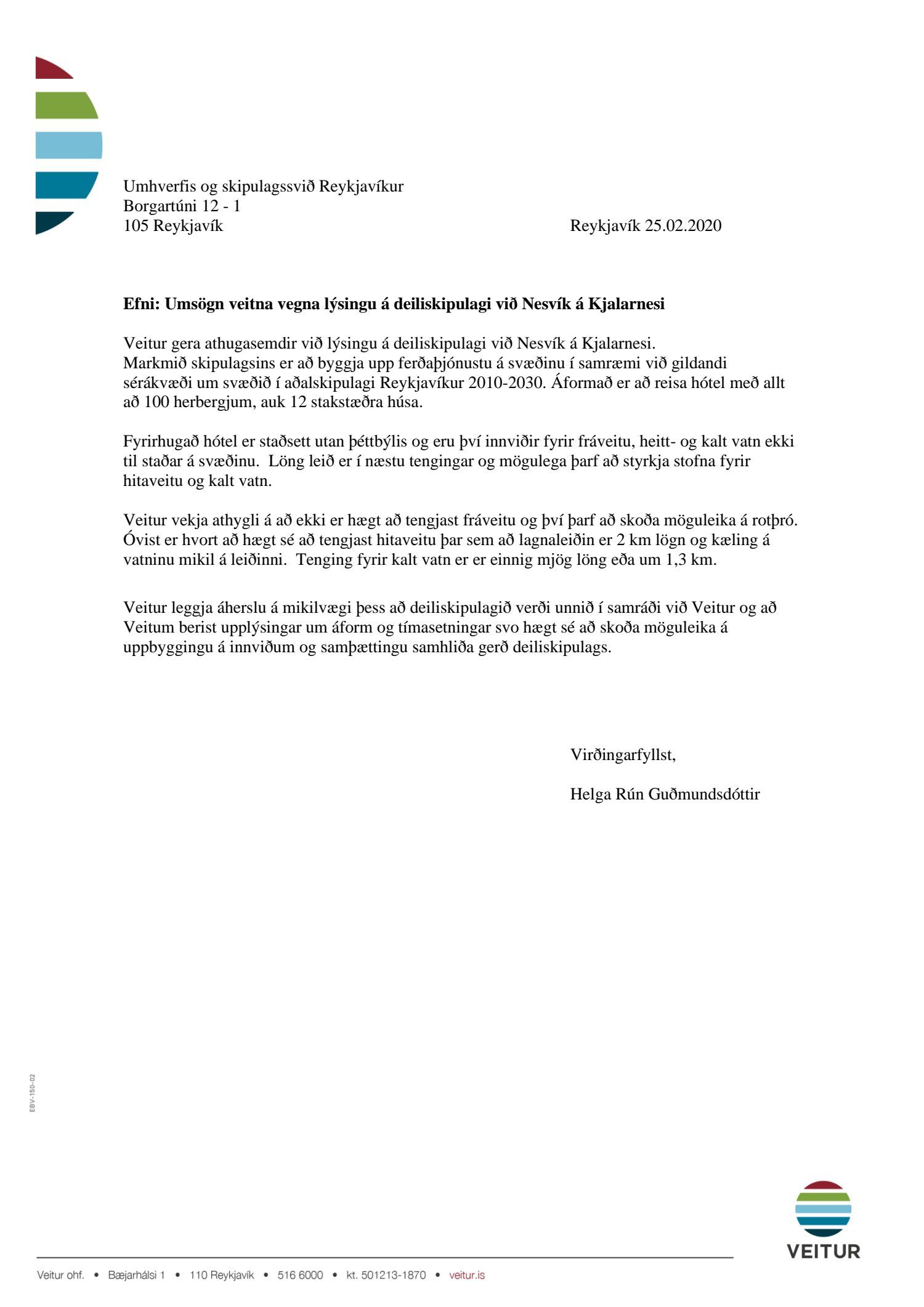 dags. 11. desember 2019 ásamt skipulagslýsingu dags. 9. desember 2019 vegna gerð nýs deiliskipulags fyrir Nesvík á Kjalarnesi sem felst í uppbyggingu allt að 100 herbergja hótels auk 12 stakstæðra húsa sem leigð verða út sem gistirými og þjónustuð af hótelinu. Einnig er lögð fram skýrsla Fornleifastofnunar Íslands dags. 2019. Tillagan var kynnt frá 29. janúar 2020 til og með 19. febrúar 2020. Eftirtaldir sendu athugasemdir/umsögn: Vegagerðin dags. 3. febrúar 2020, Borgarsögusafn Reykjavíkur dags. 7. febrúar 2020, íbúaráð Kjalarness dags. 17. febrúar 2020, Skipulagsstofnun dags. 20. febrúar 2020, Veðurstofa Íslands dags. 20. febrúar 2020, Náttúrufræðistofnun Íslands dags. 21. febrúar 2020 og Veitur dags. 25. febrúar 2020. Einnig er lagður fram tölvupóstur Umhverfisstofnunar dags. 17. febrúar 2020.