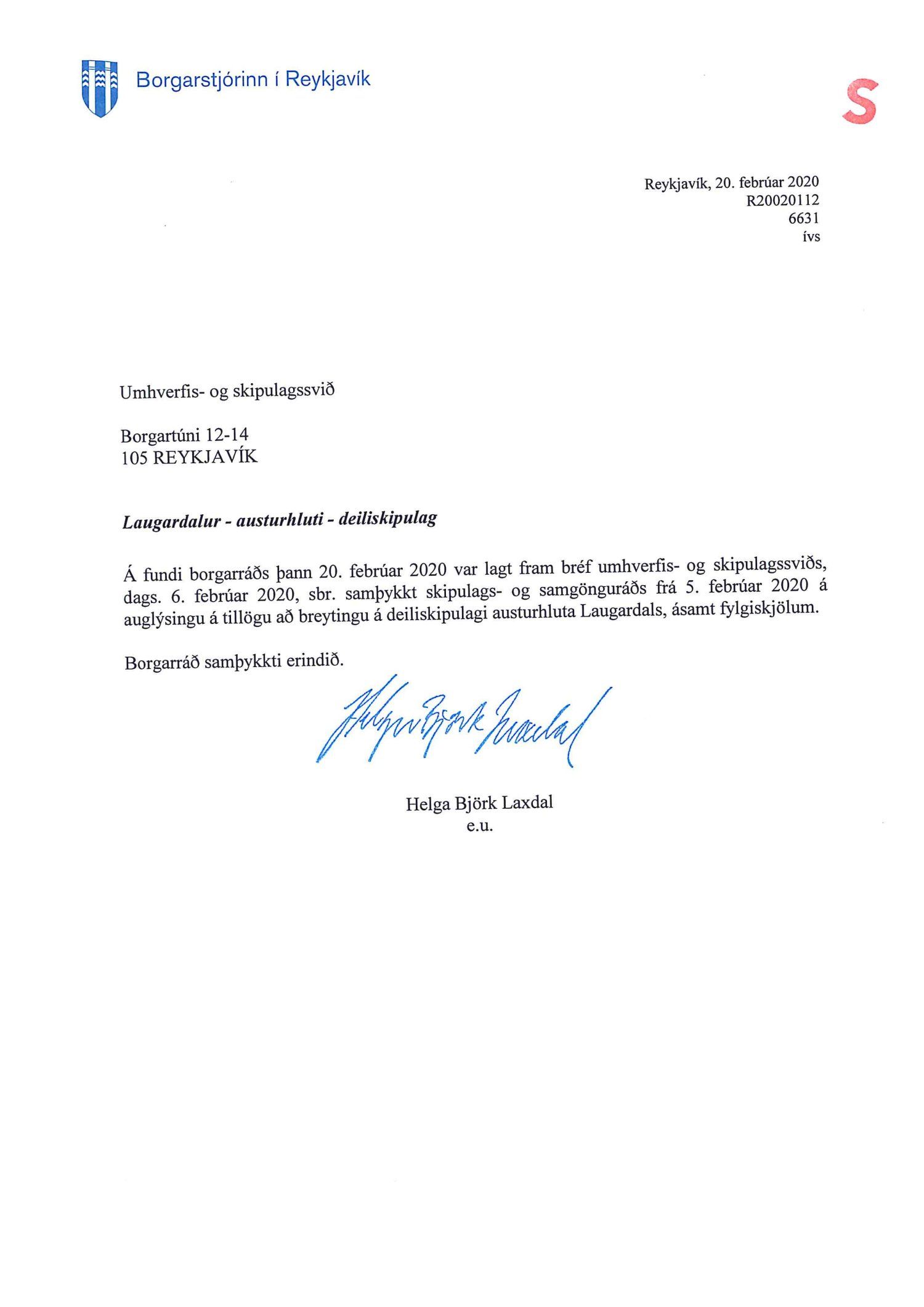 Lagt fram bréf borgarstjóra dags. 20. febrúar 2020 vegna samþykktar borgarráðs s.d. á auglýsingu á tillögu að breytingu á deiliskipulagi austurhluta Laugardals.