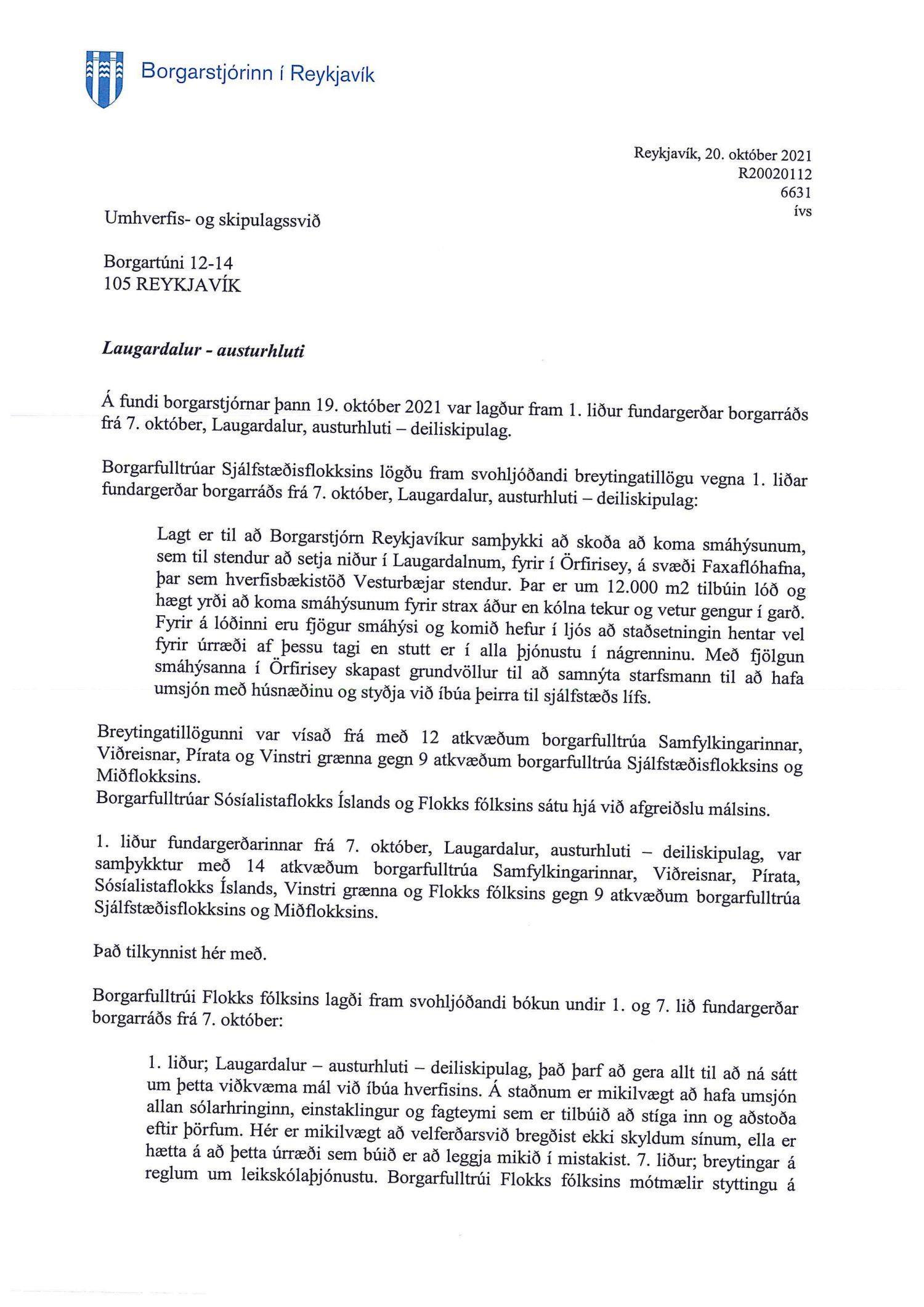 Lagt fram bréf borgarstjóra dags. 20. október 2021 vegna samþykktar borgarstjórnar frá 19. október 2021 á tillögu að breytingu á deiliskipulagi austurhluta Laugardals vegna afmörkunar nýrrar lóðar fyrir smáhýsi.