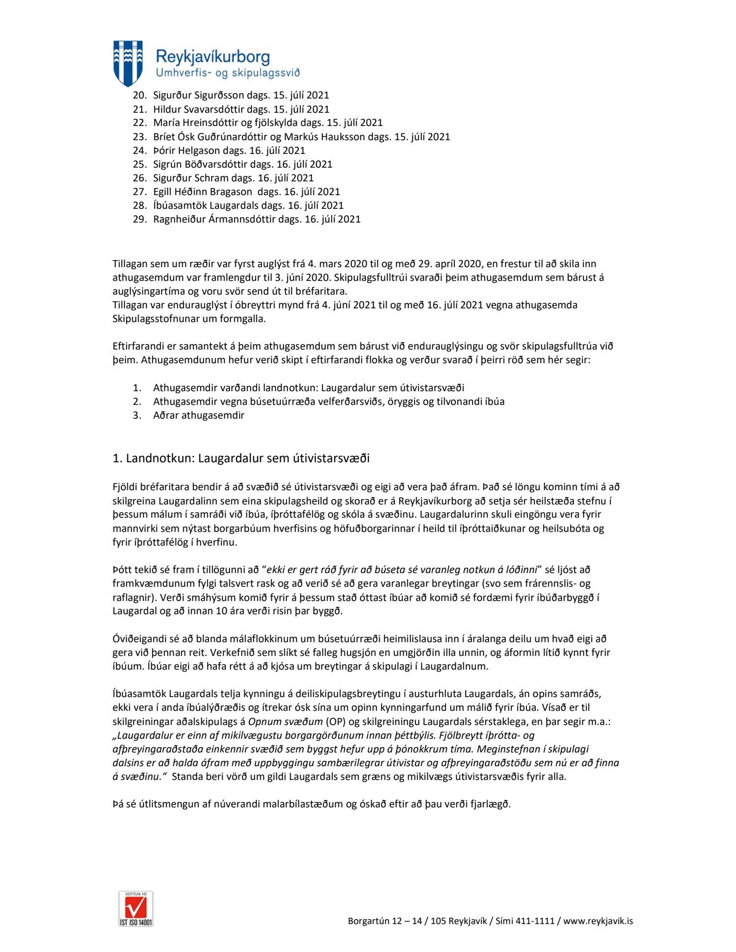dags. 5. júlí 2021, Frímann Ari Ferdinandsson f.h. stjórnar ÍBR, dags, 13. júlí 2021, Katrín Þóra Jónsdóttir dags. 15. júlí. 2021, Ásta Lovísa Jónsdóttir dags. 15. júlí 2021, Sigurjón Geirsson Arnarson dags. 15. júlí 2021, Agnes Ársælsdóttir og Brynjar Jóhannesson stuðningsyfirlýsing dags. 15. júlí 2021, Lára Óskarsdóttir dags. 15. júlí 2021, Guðmundur Páll Ólafsson dags. 15. júlí 2021, Jón Ágúst Eiríksson dags. 15. júlí 2021, Elísabet Magnúsdóttir dags. 15. júlí 2021, Nína Björk Oddsdóttir dags. 15. júlí 2021, Kolbrún Ýr Sigurðardóttir dags. 15. júlí 2021, Jón Hafsteinn Jóhannsson dags. 15. júlí 2021, Unnur Lárusdóttir dags. 15. júlí 2021, Oddný Tracey Pétursdóttir dags. 15. júlí 2021, Benedikt Þór Jóhannsson dags. 15. júlí 2021, Sigurður Sigurðsson dags. 15. júlí 2021, Hildur Svavarsdóttir dags. 15. júlí 2021, María Hreinsdóttir og fjölskylda dags. 15. júlí 2021, Bríet Ósk Guðrúnardóttir og Markús Hauksson dags. 15. júlí 2021, Þórir Helgason dags. 16. júlí 2021 og Sigrún Böðvarsdóttir dags. 16. júlí 2021, Sigurður Schram dags. 16. júlí 2021, Egill Héðinn Bragason dags. 16. júlí 2021, Íbúasamtök Laugardals dags. 16. júlí 2021, Ragnheiður Ármannsdóttir dags. 16. júlí 2021. Einnig er lögð fram umsögn skipulagsfulltrúa dags. 22. september 2021.