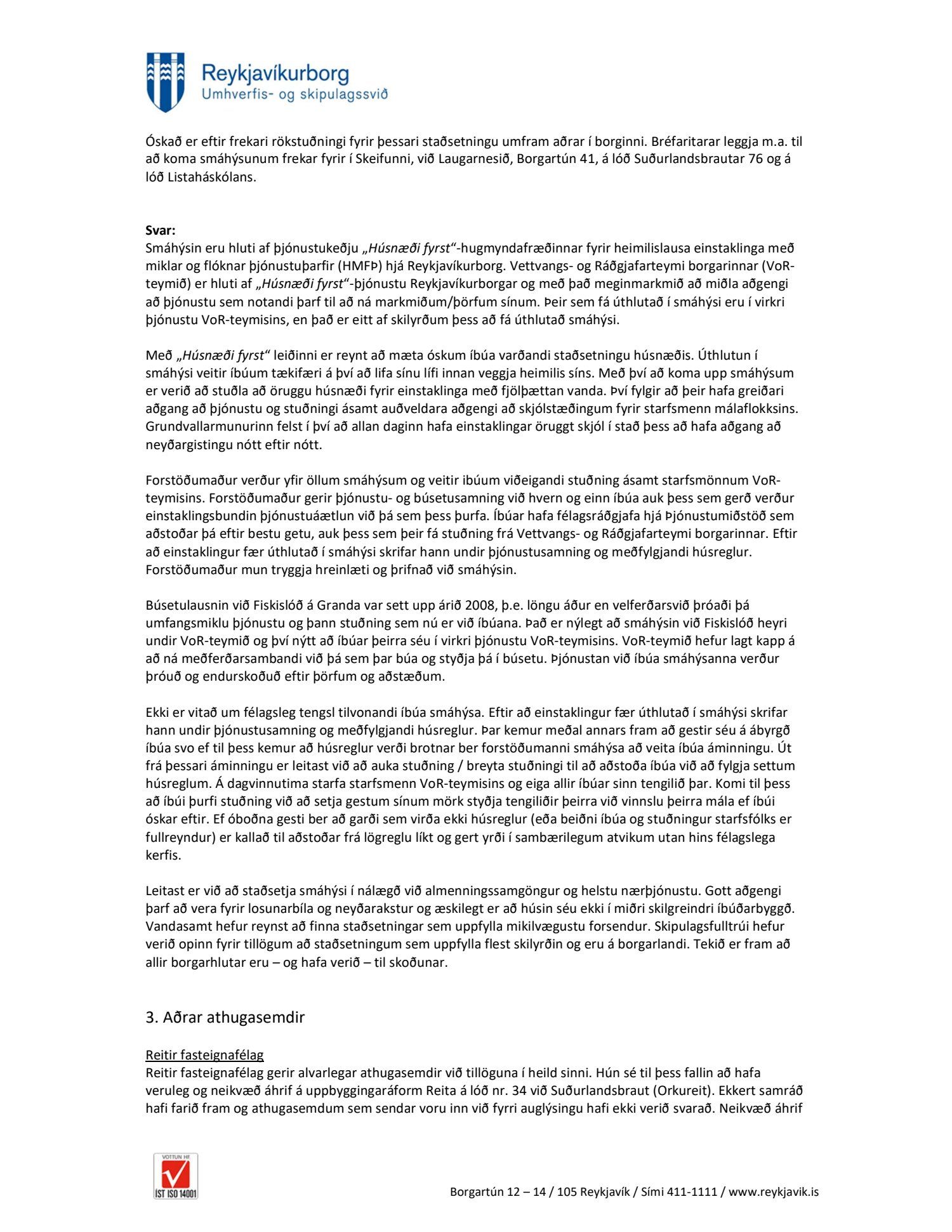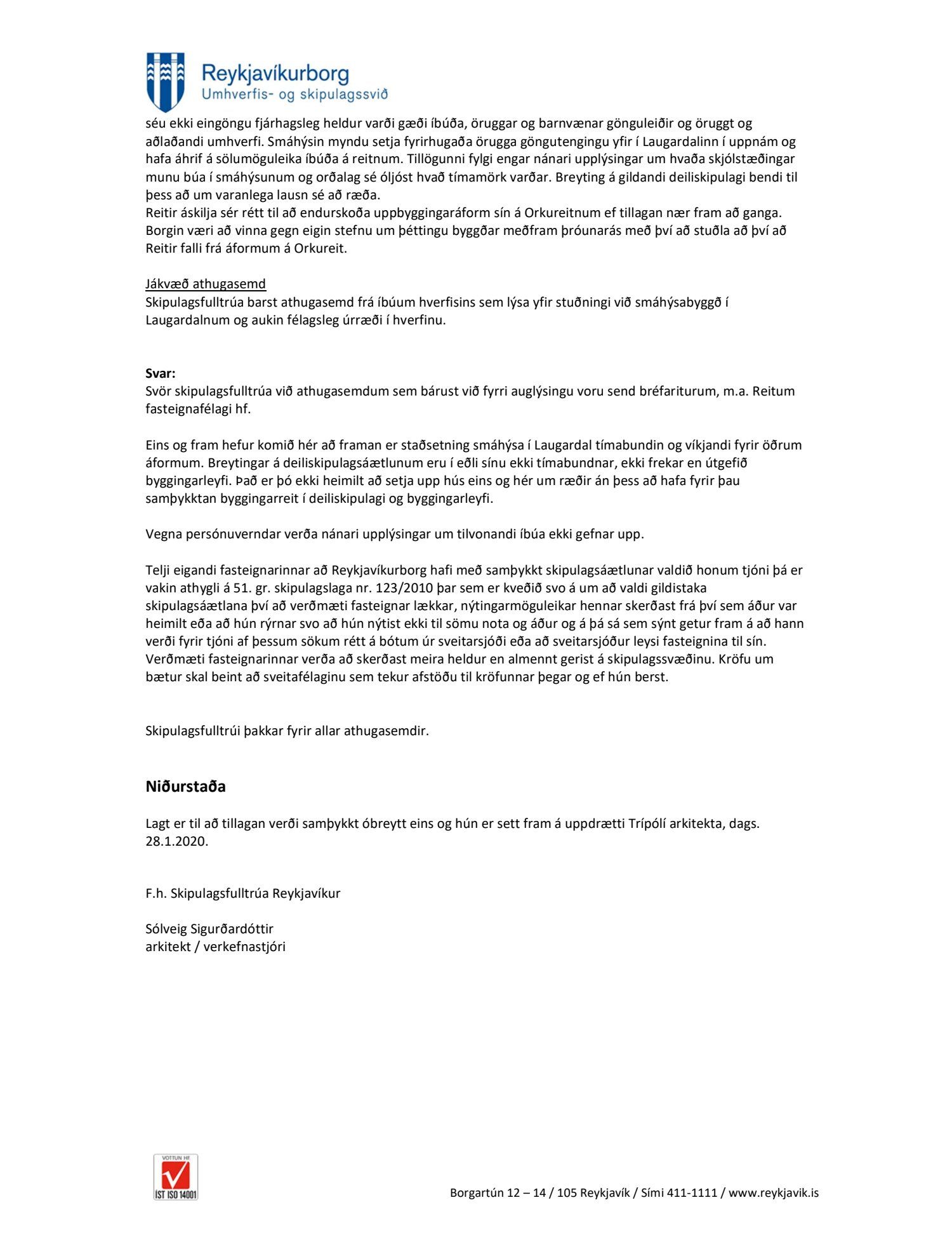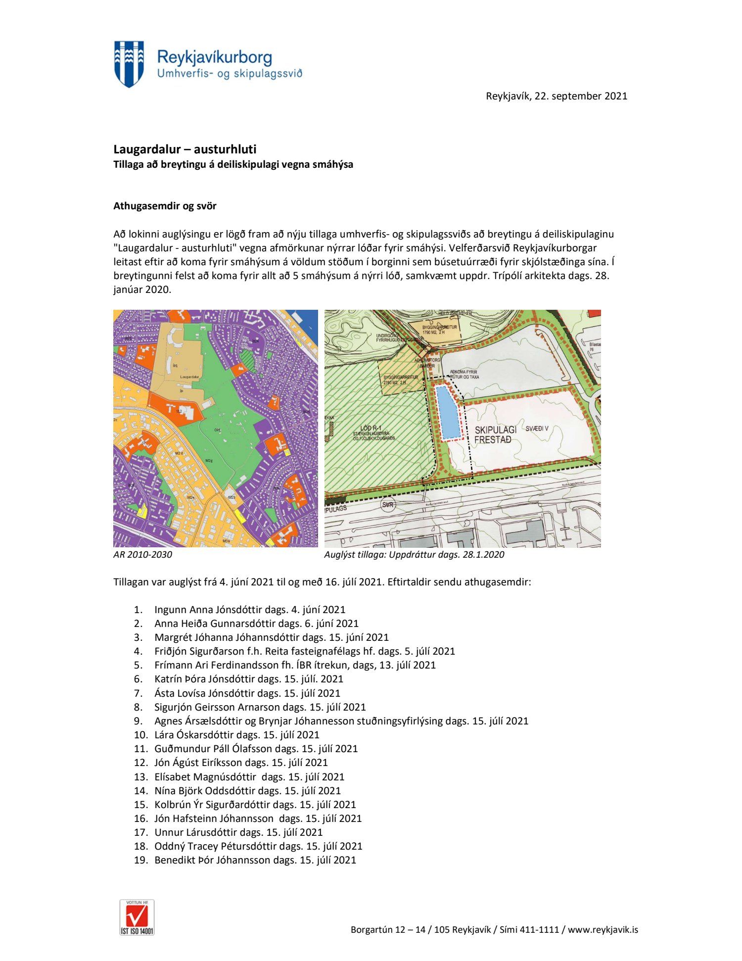 Að lokinni auglýsingu er lögð fram að nýju tillaga umhverfis- og skipulagssviðs að breytingu á deiliskipulaginu "Laugardalur - austurhluti" vegna afmörkunar nýrrar lóðar fyrir smáhýsi. Velferðarsvið Reykjavíkurborgar leitast eftir að koma fyrir smáhýsum á völdum stöðum í borginni sem búsetuúrræði fyrir skjólstæðinga sína. Í breytingunni felst að koma fyrir allt að 5 smáhýsum á nýrri lóð, samkvæmt uppdr. Trípólí arkitekta dags. 28. janúar 2020. Tillagan var auglýst frá 4. júní 2021 til og með 16. júlí 2021. Eftirtaldir sendu athugasemdir: Ingunn Anna Jónsdóttir dags. 4. júní 2021, Anna Heiða Gunnarsdóttir dags. 6. júní 2021, Margrét Jóhanna Jóhannsdóttir dags. 15. júní 2021, Friðjón Sigurðarson f.h.