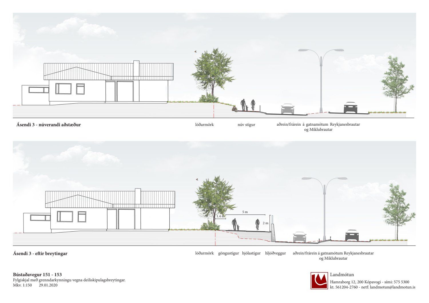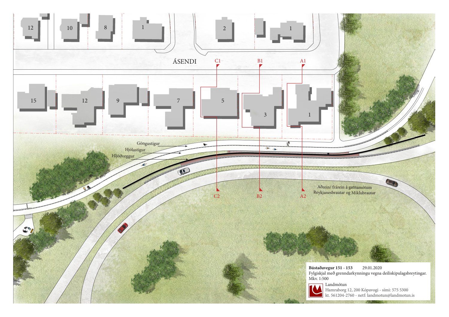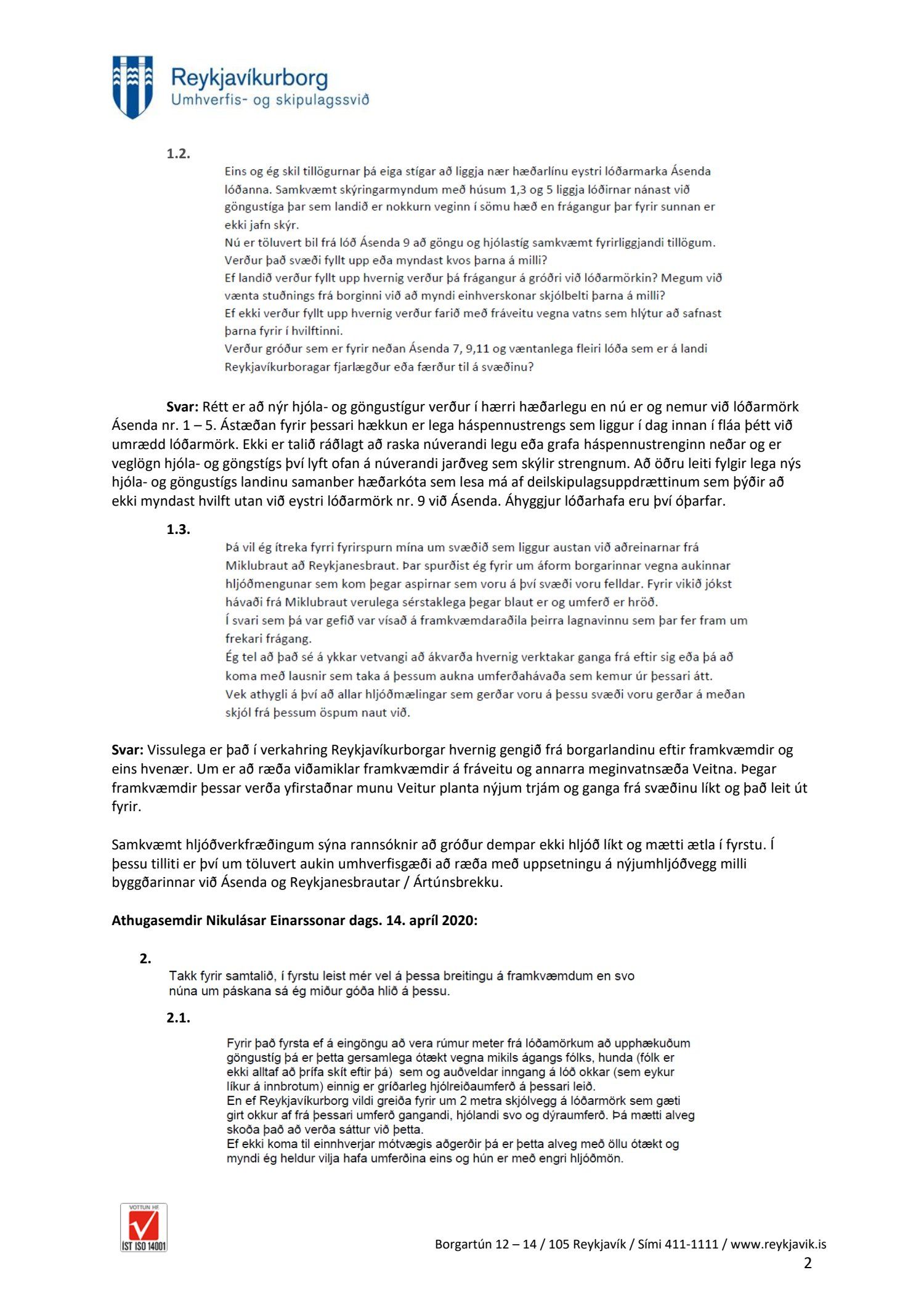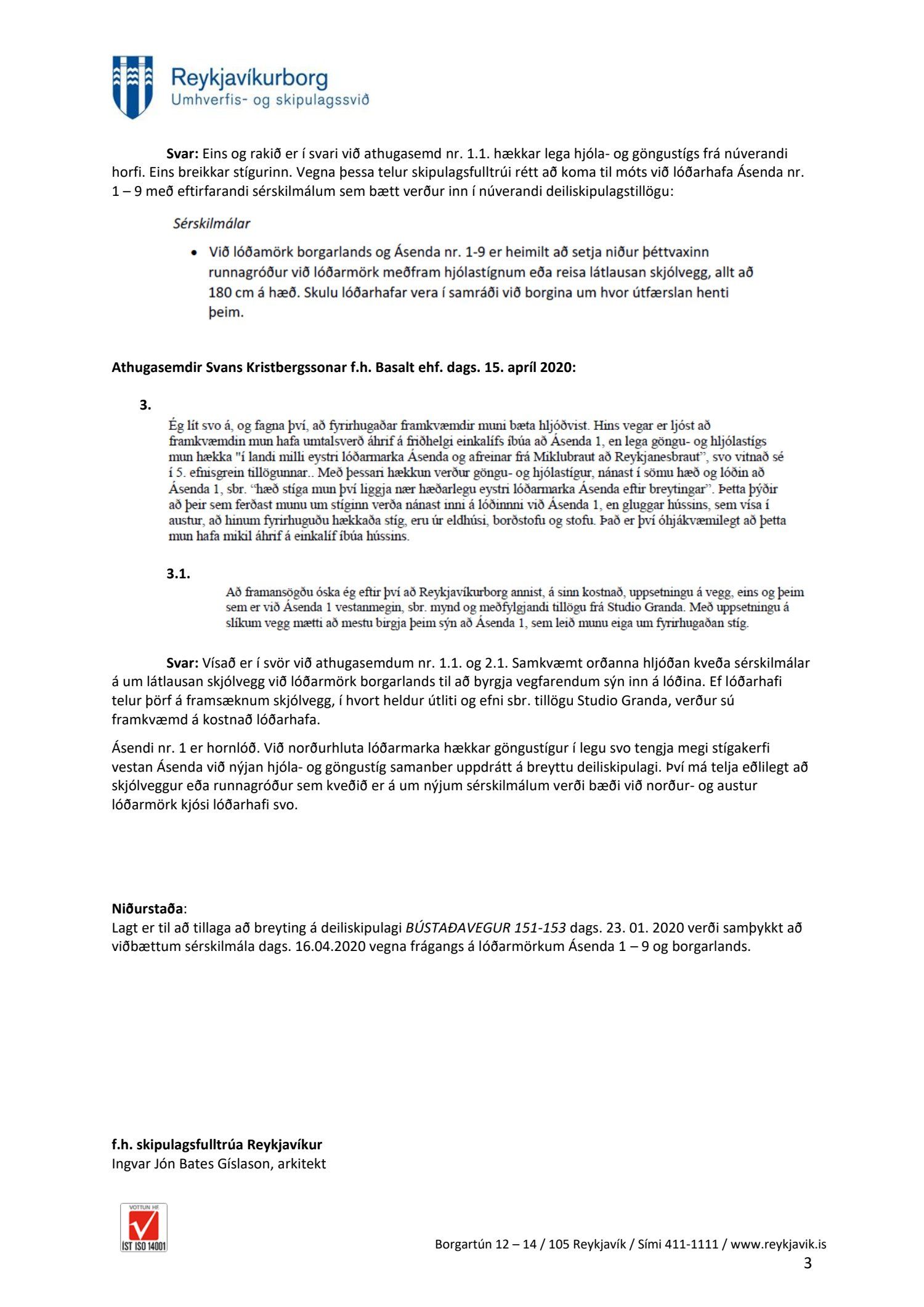 Að lokinni auglýsingu er lögð fram að nýju tillaga umhverfis- og skipulagssviðs að breytingu á deiliskipulagi Bústaðavegar 151-153. Í breytingunni felst m.a. að skipulagssvæðið stækkar til norðurs inn á svæði við lóðarmörk Ásenda og afreinar frá Miklubraut að Reykjanesbraut, uppsetningu hljóðveggs meðfram afrein/aðrein akandi umferðar við gatnamót Miklubrautar og Reykjanesbrautar, lega göngu- og hjólastígs norðan hitaveitustokks og vestan lóðar við Bústaðaveg 151D breytist og lega göngu- og hjólastígs breikkar og hækkar í landi milli eystri lóðarmarka Ásenda og afreinar/aðreinar milli Miklubrautar og Reykjanesbrautar vegna háspennurafstrengs sem liggur í jörðu undir núverandi stíg, samkvæmt uppdr. Arkís arkitekta og Landslags dags. 23. janúar 2020 br. 16. apríl 2020. Einnig eru felldar burt tvær settjarnir (settjörn 1 og settjörn 2) vegna óhentugrar hæðarlegu lands og skerpt á skilmálum vegna blágrænna ofanvatnslausna innan lóða í formi regnbeða. Jafnframt er lagt fram fylgiskjal með þremur sneiðmyndum í hljóðvegg og lóðir Ásenda nr. 1, 3 og 5 dags. 29. janúar 2020, hljóðvistarskýrsla
