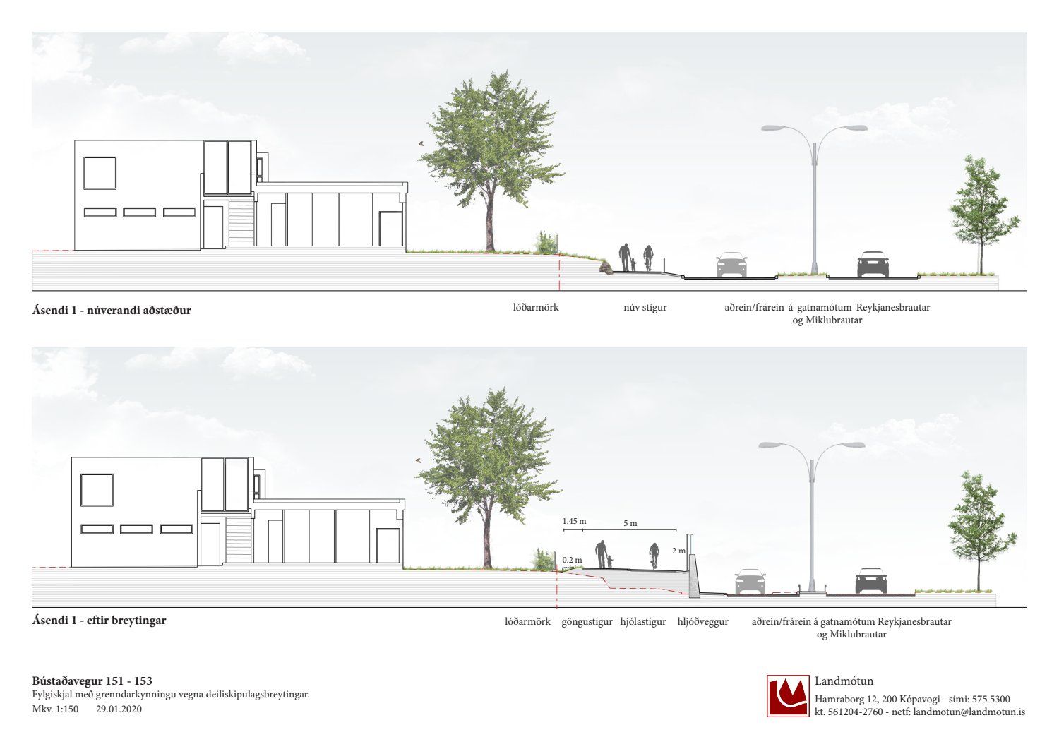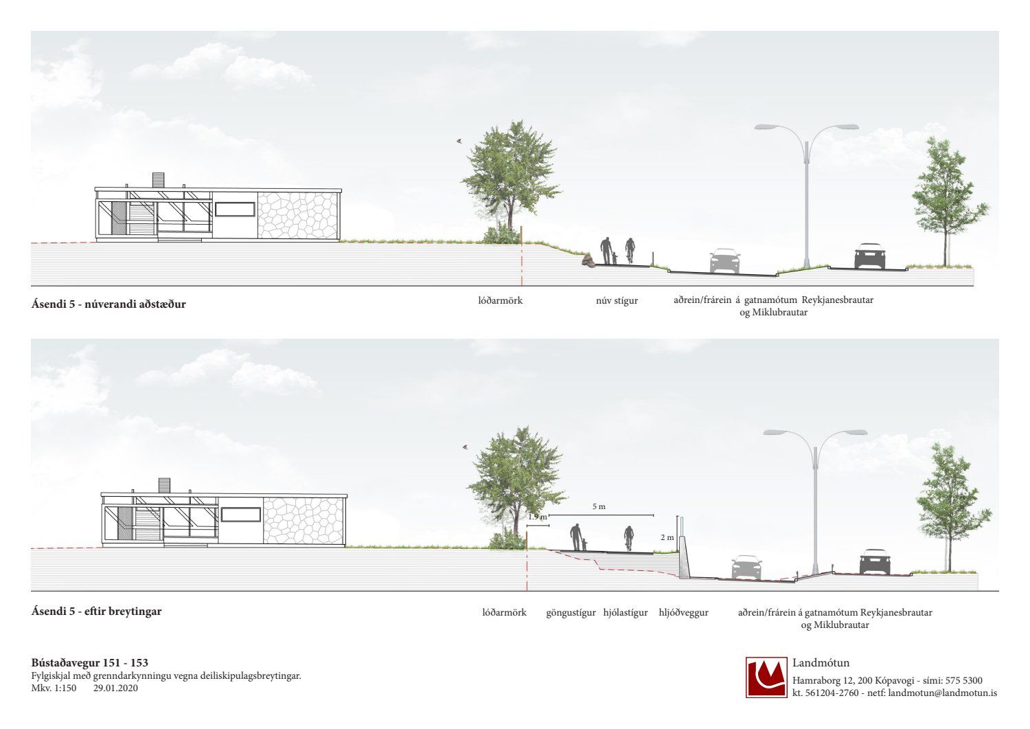 Lögð fram tillaga umhverfis- og skipulagssviðs að breytingu á deiliskipulagi Bústaðavegar 151-153. Í breytingunni felst m.a. að skipulagssvæðið stækkar til norðurs inn á svæði við lóðarmörk Ásenda og afreinar frá Miklubraut að Reykjanesbraut, uppsetningu hljóðveggs meðfram afrein/aðrein akandi umferðar við gatnamót Miklubrautar og Reykjanesbrautar, lega göngu- og hjólastígs norðan hitaveitustokks og vestan lóðar við Bústaðaveg 151D breytist og lega göngu- og hjólastígs breikkar og hækkar í landi milli eystri lóðarmarka Ásenda og afreinar/aðreinar milli Miklubrautar og Reykjanesbrautar vegna háspennurafstrengs sem liggur í jörðu undir núverandi stíg, samkvæmt uppdr. Arkís arkitekta og Landslags dags. 23. janúar 2020. Einnig eru felldar burt tvær settjarnir (settjörn 1 og settjörn 2) vegna óhentugrar hæðarlegu lands og skerpt á skilmálum vegna blágrænna ofanvatnslausna innan lóða í formi regnbeða.