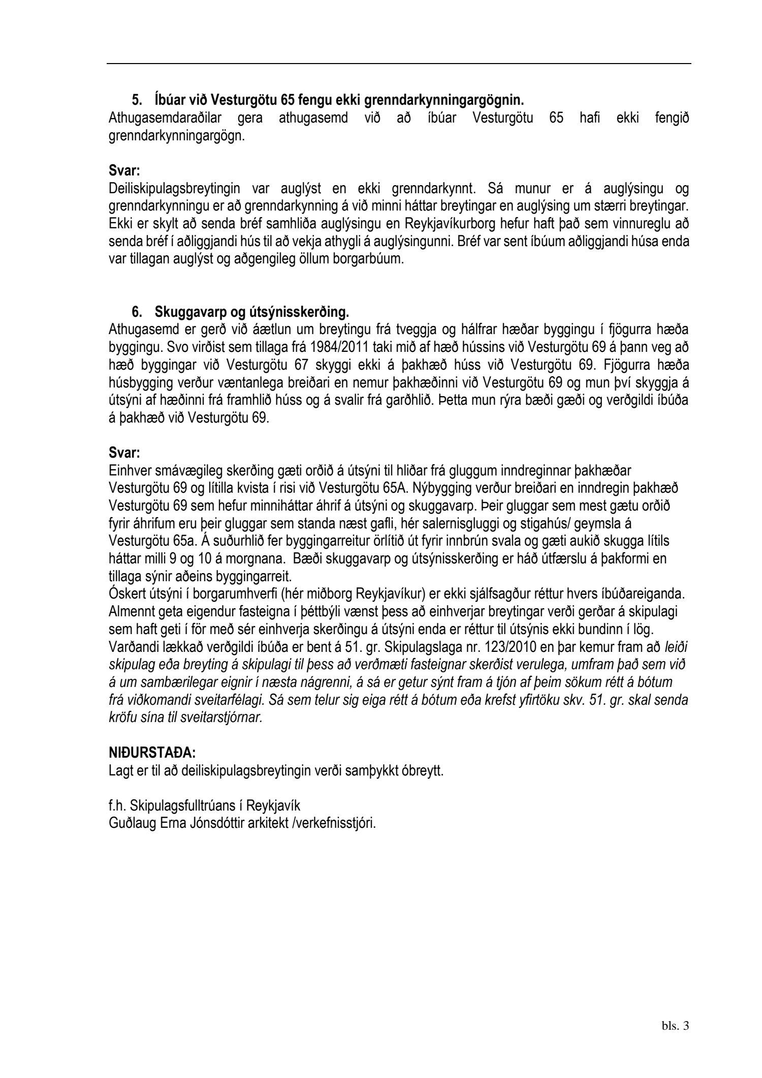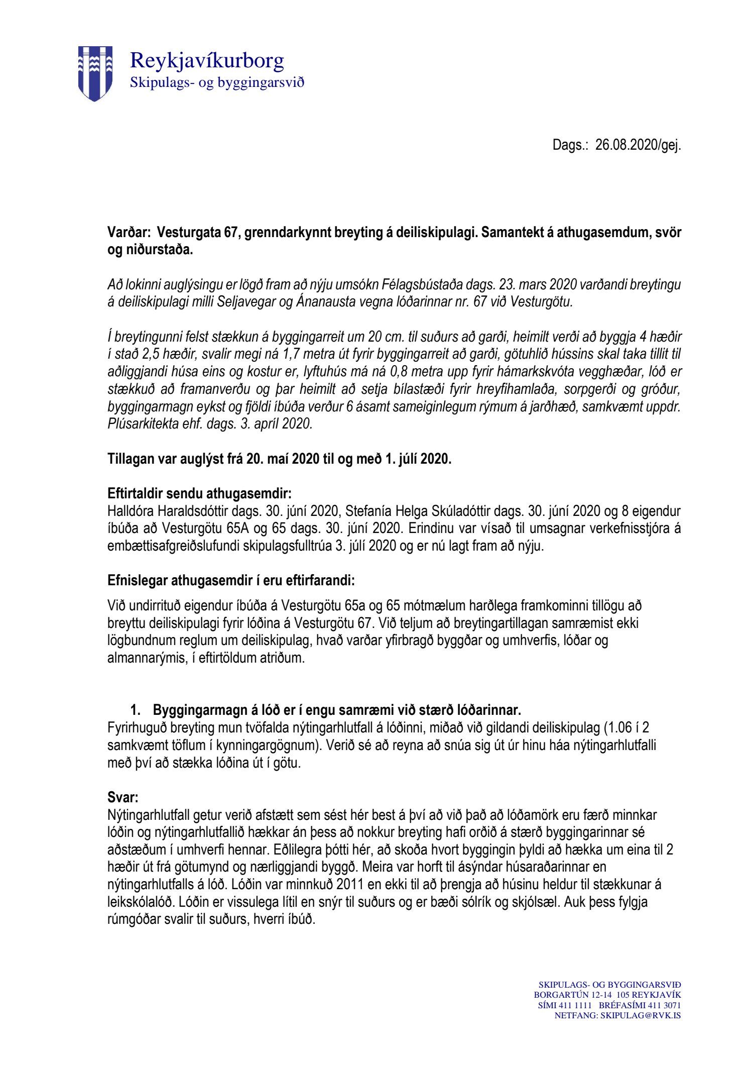dags. 3. apríl 2020. Tillagan var auglýst frá 20. maí 2020 til og með 1. júlí 2020. Eftirtaldir sendu athugasemdir: Halldóra Haraldsdóttir dags. 30. júní 2020, Stefanía Helga Skúladóttir dags. 30. júní 2020 og 8 eigendur íbúða að Vesturgötu 65A og 65 dags. 30. júní 2020. Einnig er lögð fram umsögn skipulagsfulltrúa dags. 26. ágúst 2020.