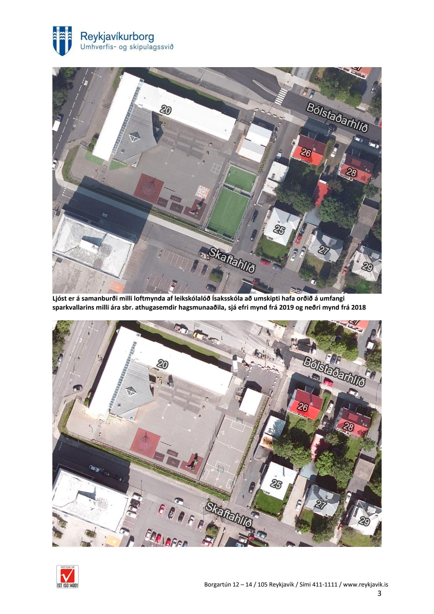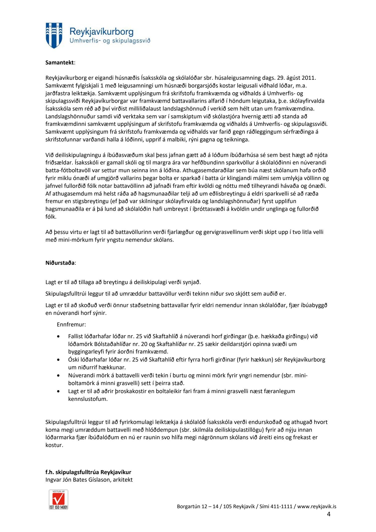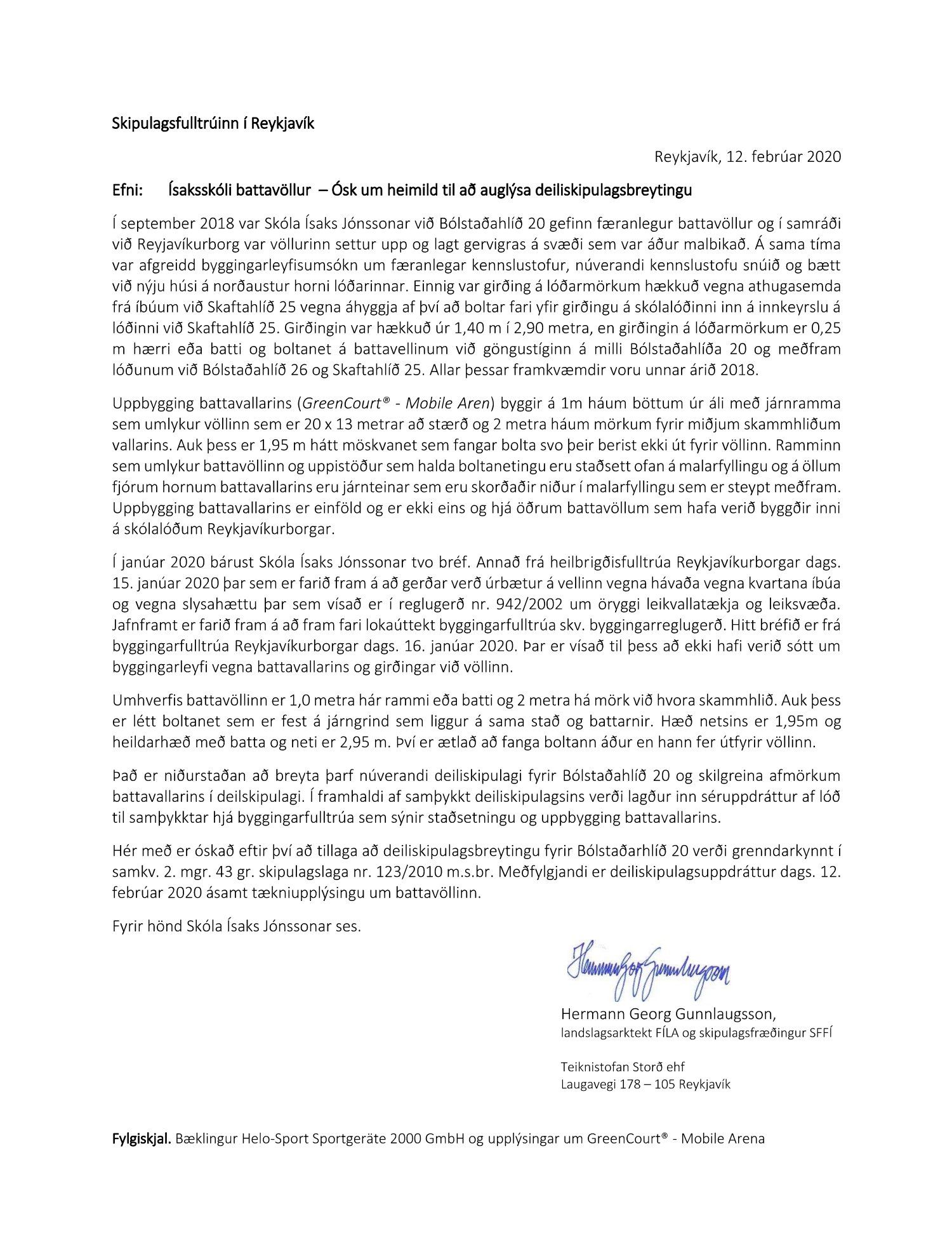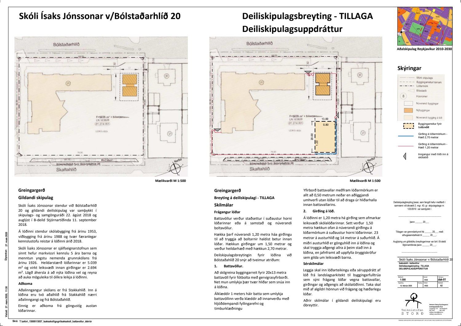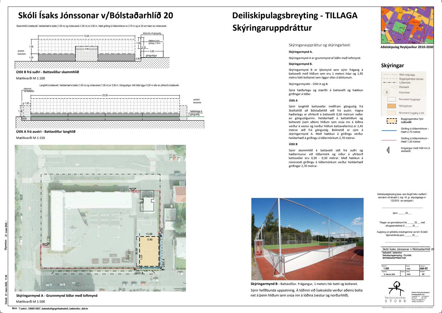 Að lokinni grenndarkynningu er lögð fram umsókn Hermanns Georgs Gunnlaugssonar dags. 12. febrúar 2020 ásamt bréfi dags. 12. febrúar 2020 varðandi breytingu á deiliskipulagi fyrir lóð nr. 20 við Bólstaðarhlíð, Ísaksskóli. Í breytingunni felst að skilgreina byggingarreit fyrir battavöll á lóð sem er 20 x 13 metrar ásamt því að hækka núverandi girðingu á auðausturhorni lóðar, samkvæmt uppdr.