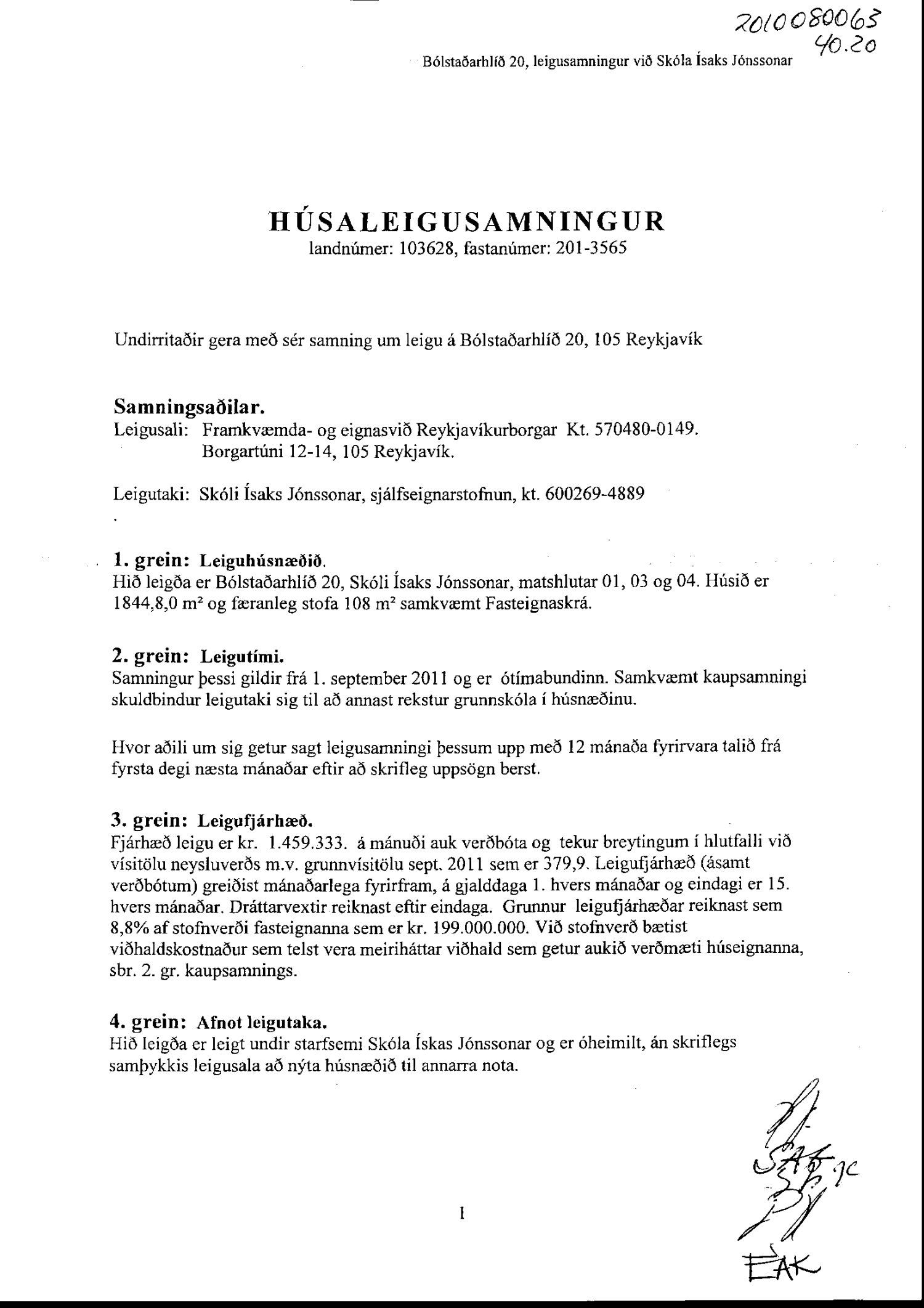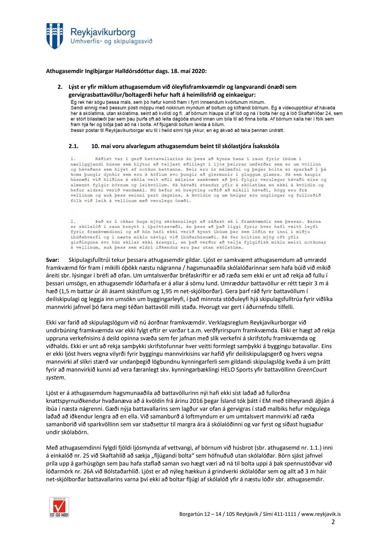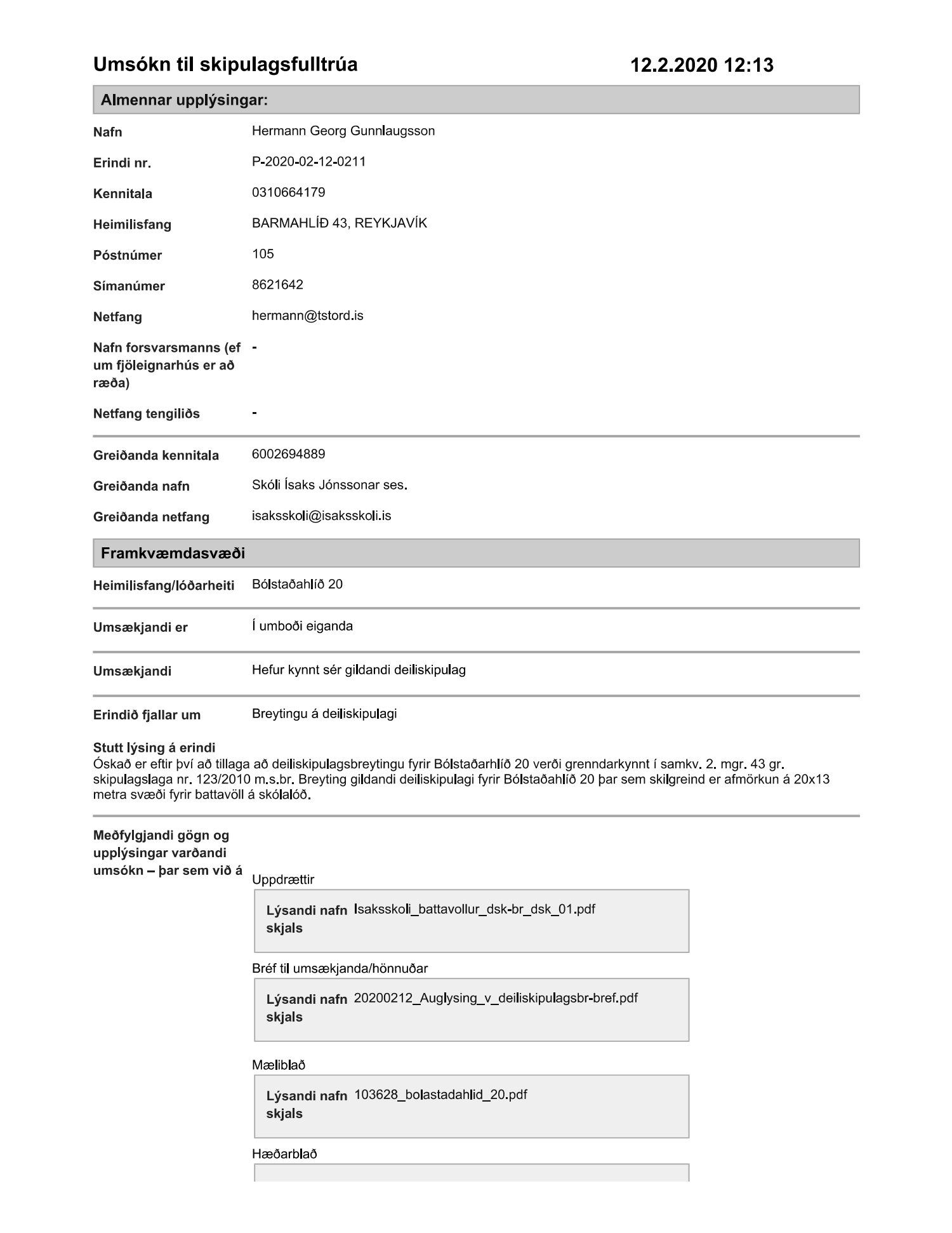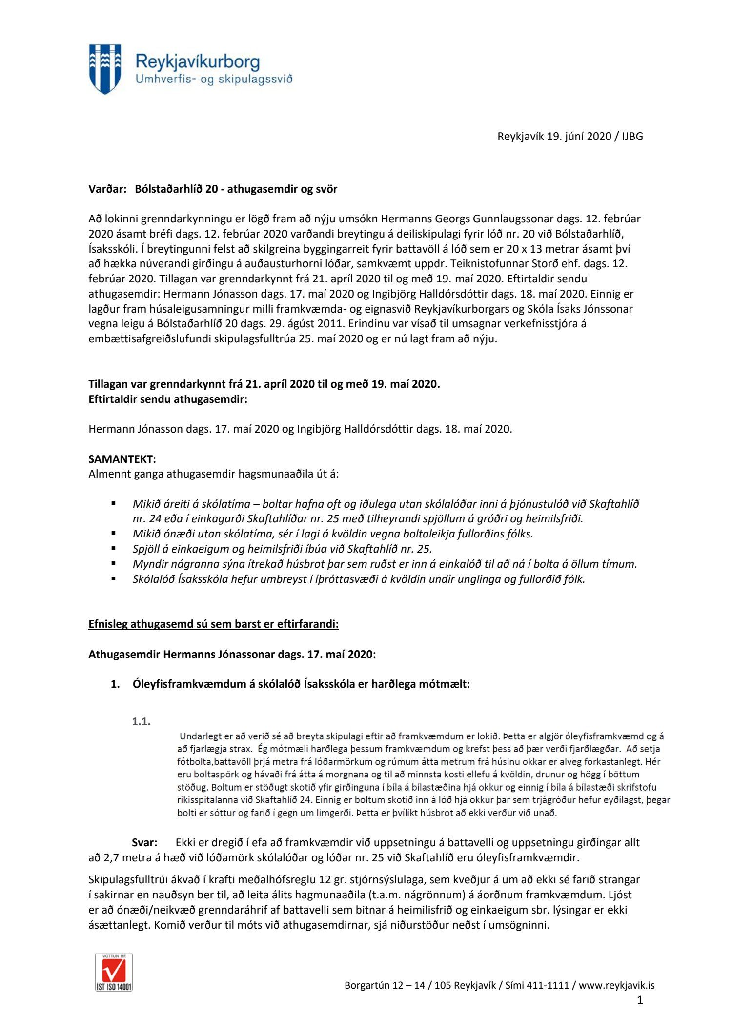 dags. 12. febrúar 2020. Tillagan var grenndarkynnt frá 21. apríl 2020 til og með 19. maí 2020. Eftirtaldir sendu athugasemdir: Hermann Jónasson dags. 17. maí 2020 og Ingibjörg Halldórsdóttir dags. 18. maí 2020. Einnig er lagður fram húsaleigusamningur milli framkvæmda- og eignasvið Reykjavíkurborgars og Skóla Ísaks Jónssonar vegna leigu á Bólstaðarhlíð 20 dags. 29. ágúst 2011. Einnig lögð fram umsögn skipulagsfulltrúa dags. 19. júní 2020.