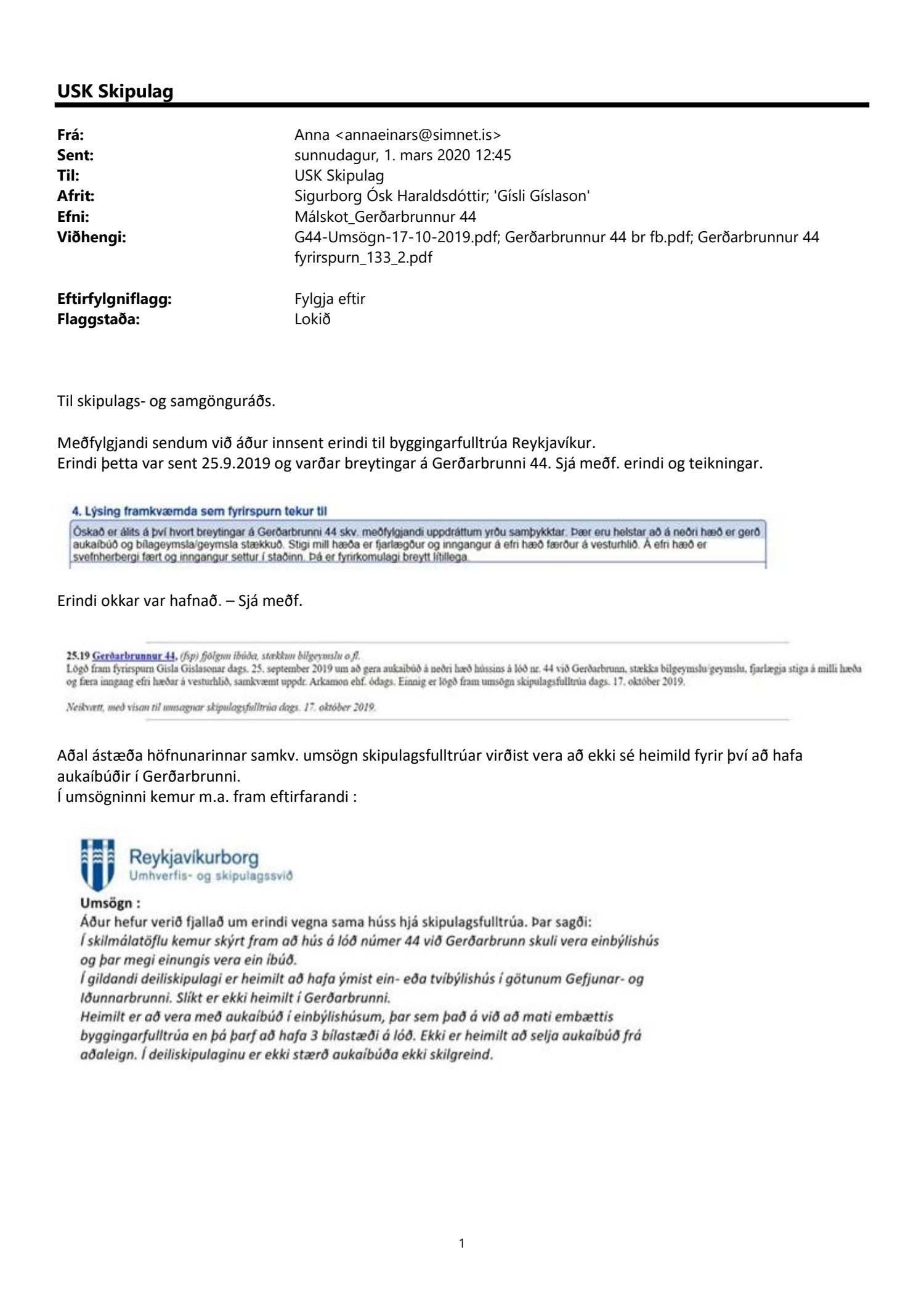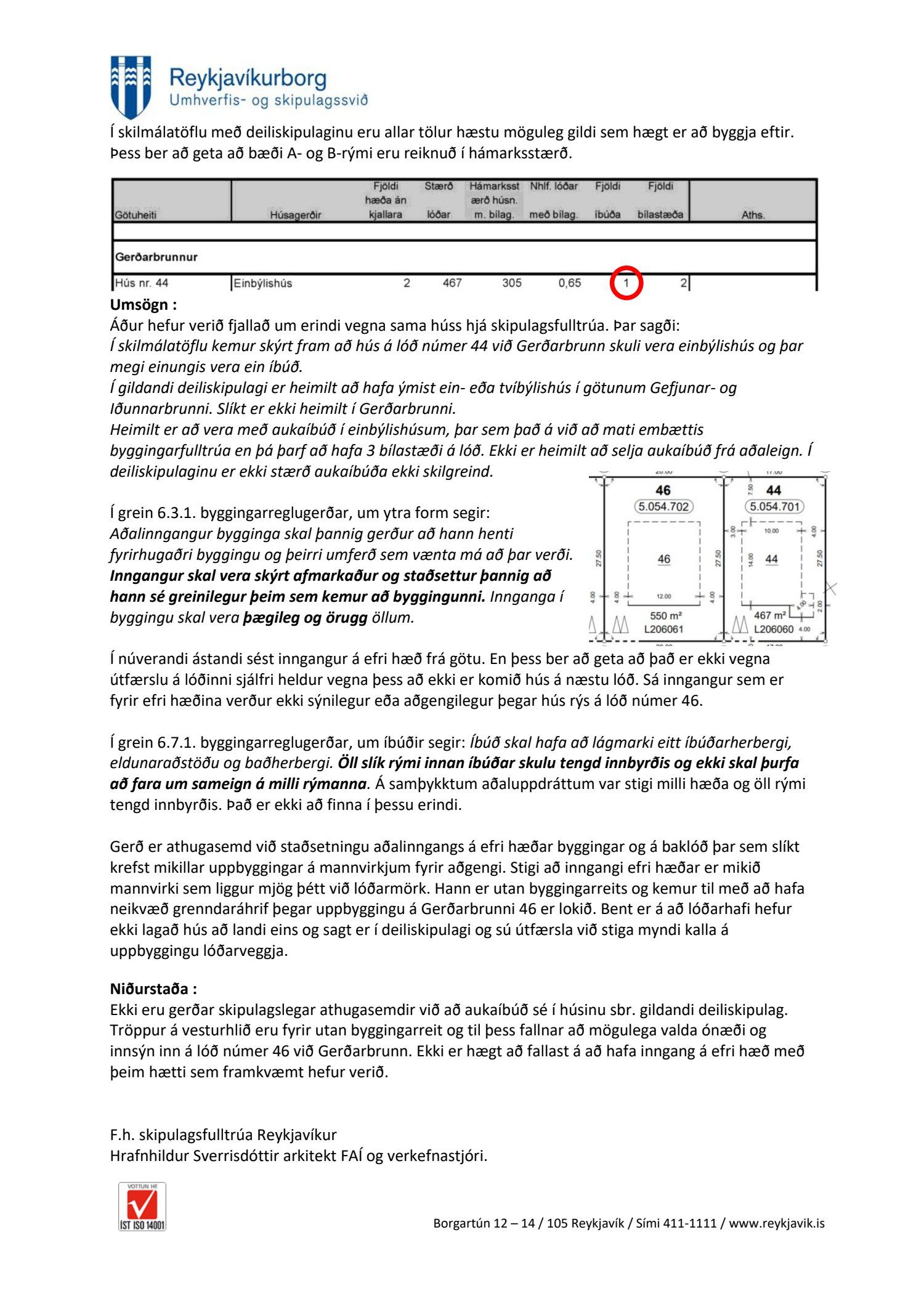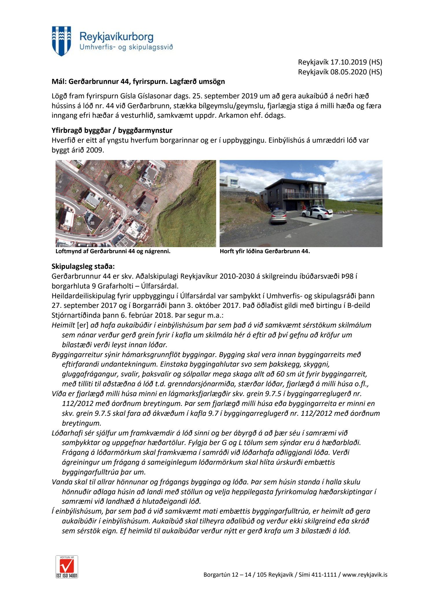Lagt er fram málskot dags. 1. mars 2020 vegna neikvæðrar afgreiðslu skipulagsfulltrúa frá 18. október 2020 um að gera auka íbúð á neðri hæð hússins á lóð nr. 44 við Gerðarbrunn, stækka bílageymslu/geymslu, fjarlægja stiga á milli hæða og færa inngang efri hæðar á vesturhlið, samkvæmt uppdr.