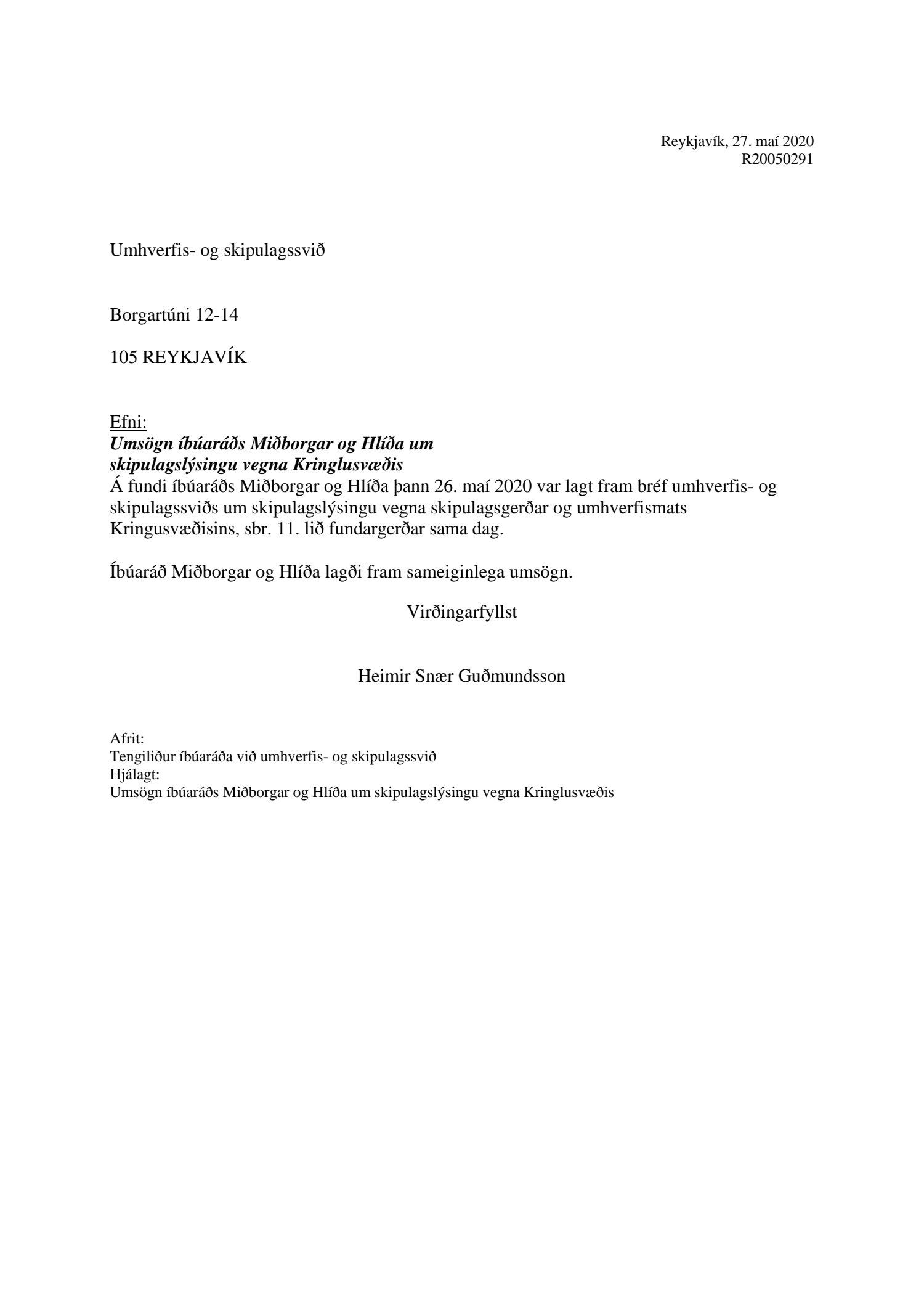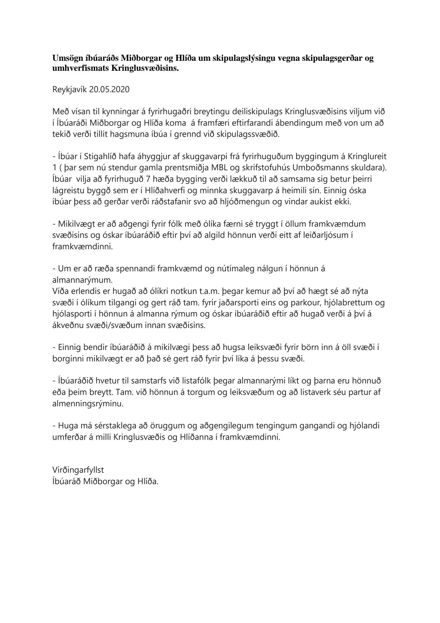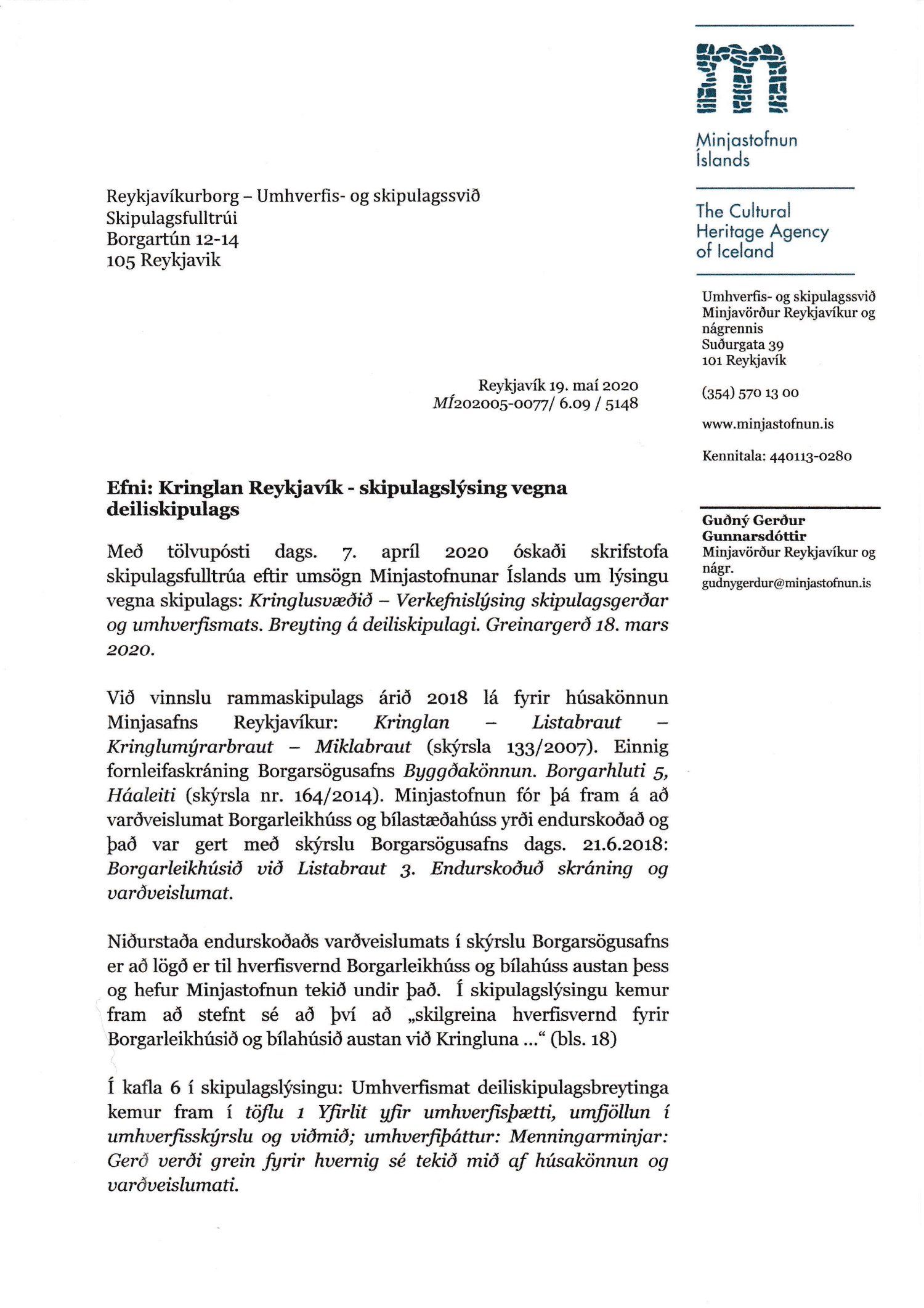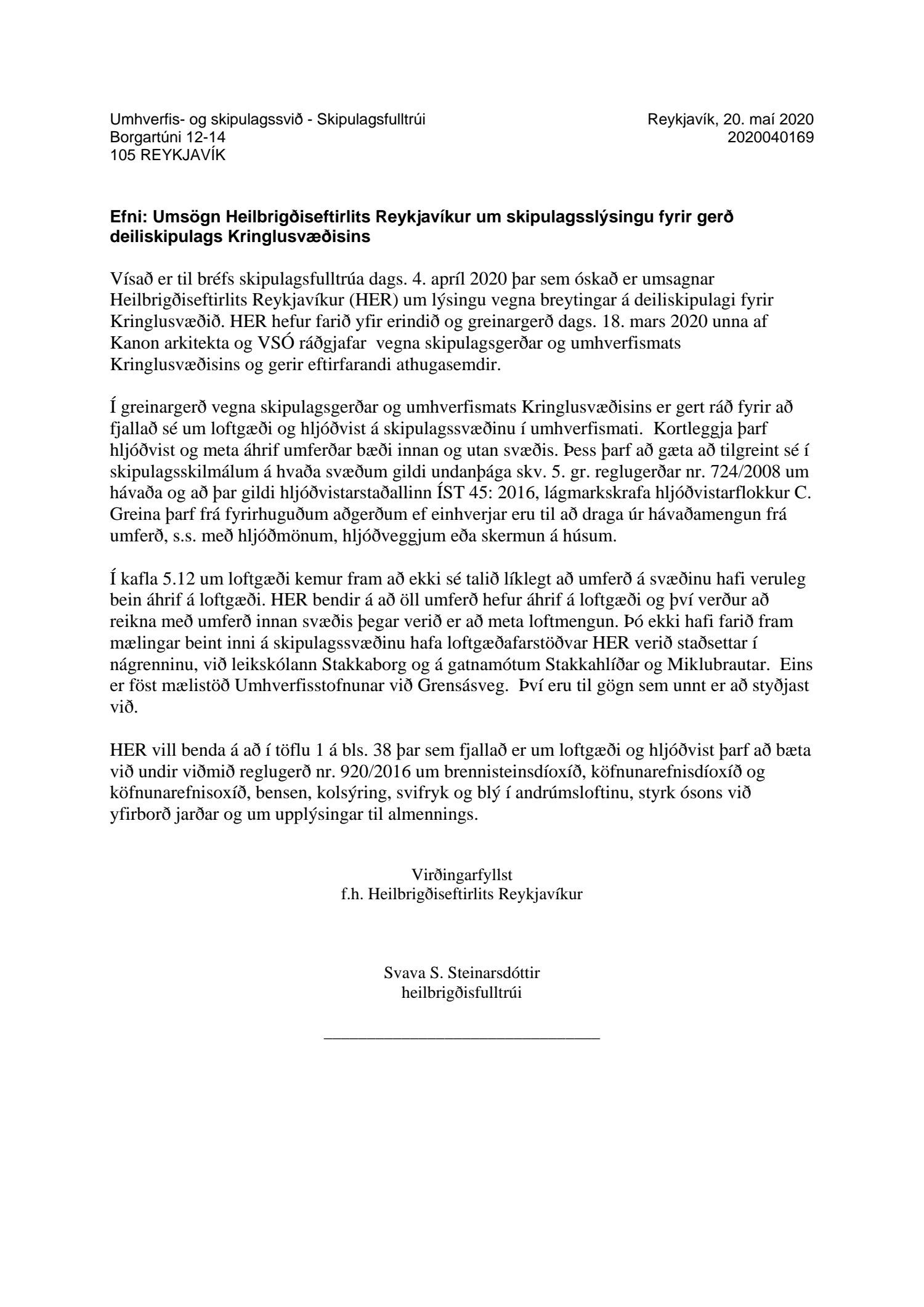 Að lokinni kynningu er lögð fram að nýju skipulagslýsing, Kanon arkitekta og VSÓ ráðgjafar dags 18. mars 2020, vegna skipulagsgerðar og umhverfismats "Kringlusvæðisins". Kynning stóð yfir frá 8. apríl 2020 til og með 20. maí 2020. Eftirtaldir sendu athugasemdir/umsögn: Borgarsögusafn Reykjavíkur dags. 5. maí 2020, Veðurstofa Íslands dags. 12. maí 2020, Minjastofnun Íslands dags. 19. maí 2020, Vegagerðin dags. 19. maí 2020, Finnur Magnússon lögmaður f.h. Hús verslunarinnar sf., Kringlunnar 7 húsfélag og þinglýstra eigendur fasteigna í Kringlunni 7 dags. 19. maí 2020, Jón Ævar Pálmason og Þórhildur Kristinsdóttir dags. 20. maí 2020, íbúaráð Miðborgar og Hlíða dags. 20. maí 2020, María Hjaltalín f.h. íbúasamtaka 3. hverfis dags. 20. maí 2020, Heilbrigðiseftirlit Reykjavíkur dags 20. maí 2020. Veitur dags. 22. maí 2020, íbúaráð Miðborgar og Hlíða dags. 27. maí 2020, íbúaráð Háaleitis- og Bústaðahverfis dags. 29. maí 2020, Svæðisskipulagsnefnd höfuðborgarsvæðisins dags. 3. júní 2020. Einnig er lagður fram tölvupóstur Umhverfisstofnunar dags. 30. apríl 2020. Erindinu var vísað til meðferðar hjá verkefnisstjóra á embættisafgreiðslufundi skipulagsfulltrúa 29. maí 2020 og er nú lagt fram að nýju.