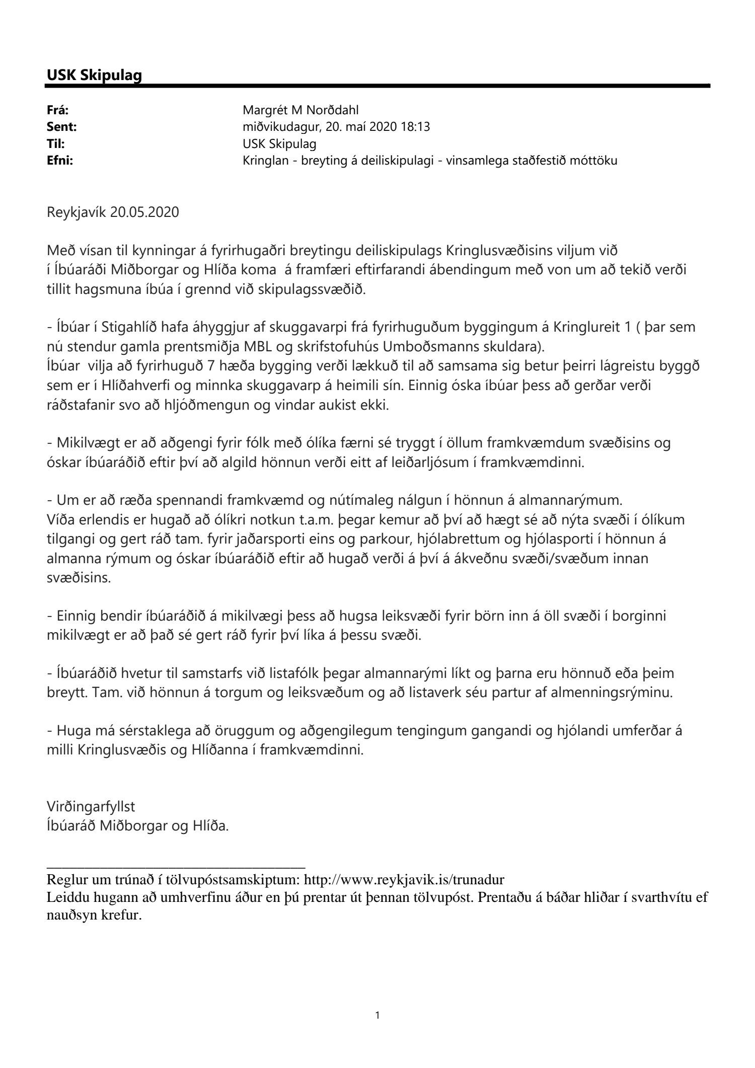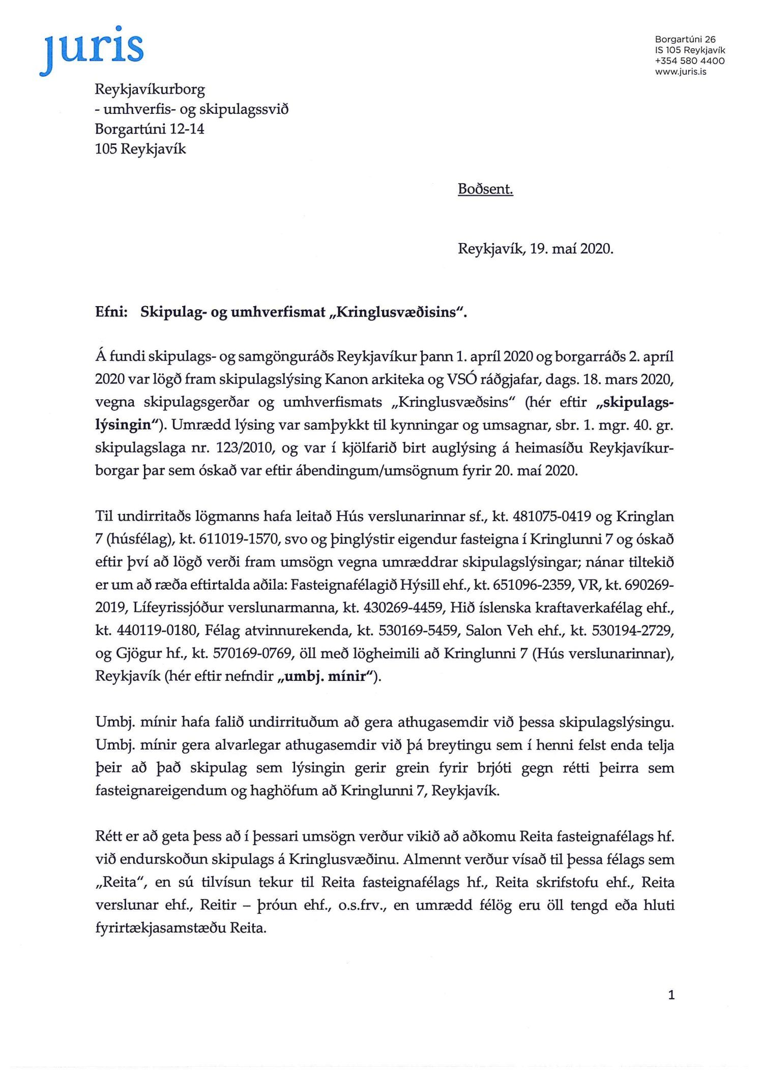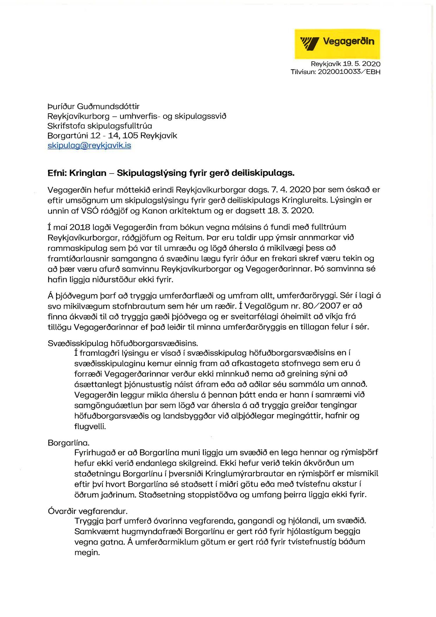 Að lokinni kynningu er lögð fram að nýju skipulagslýsing, Kanon arkitekta og VSÓ ráðgjafar dags 18. mars 2020, vegna skipulagsgerðar og umhverfismats "Kringlusvæðisins". Kynning stóð yfir frá 8. apríl 2020 til og með 20. maí 2020. Eftirtaldir sendu athugasemdir/umsögn: Borgarsögusafn Reykjavíkur dags. 5. maí 2020, Veðurstofa Íslands dags. 12. maí 2020, Minjastofnun Íslands dags. 19. maí 2020, Vegagerðin dags. 19. maí 2020, Finnur Magnússon lögmaður f.h. Hús verslunarinnar sf., Kringlunnar 7 húsfélag og þinglýstra eigendur fasteigna í Kringlunni 7 dags. 19. maí 2020, Jón Ævar Pálmason og Þórhildur Kristinsdóttir dags. 20. maí 2020, íbúaráð Miðborgar og Hlíða dags. 20. maí 2020, María Hjaltalín f.h. íbúasamtaka 3. hverfis dags. 20. maí 2020, Heilbrigðiseftirlit Reykjavíkur dags 20. maí 2020. Veitur dags. 22. maí 2020, íbúaráð Miðborgar og Hlíða dags. 27. maí 2020, íbúaráð Háaleitis- og Bústaðahverfis dags. 29. maí 2020, Svæðisskipulagsnefnd höfuðborgarsvæðisins dags. 3. júní 2020. Einnig er lagður fram tölvupóstur Umhverfisstofnunar dags. 30. apríl 2020. Erindinu var vísað til meðferðar hjá verkefnisstjóra á embættisafgreiðslufundi skipulagsfulltrúa 29. maí 2020 og er nú lagt fram að nýju.