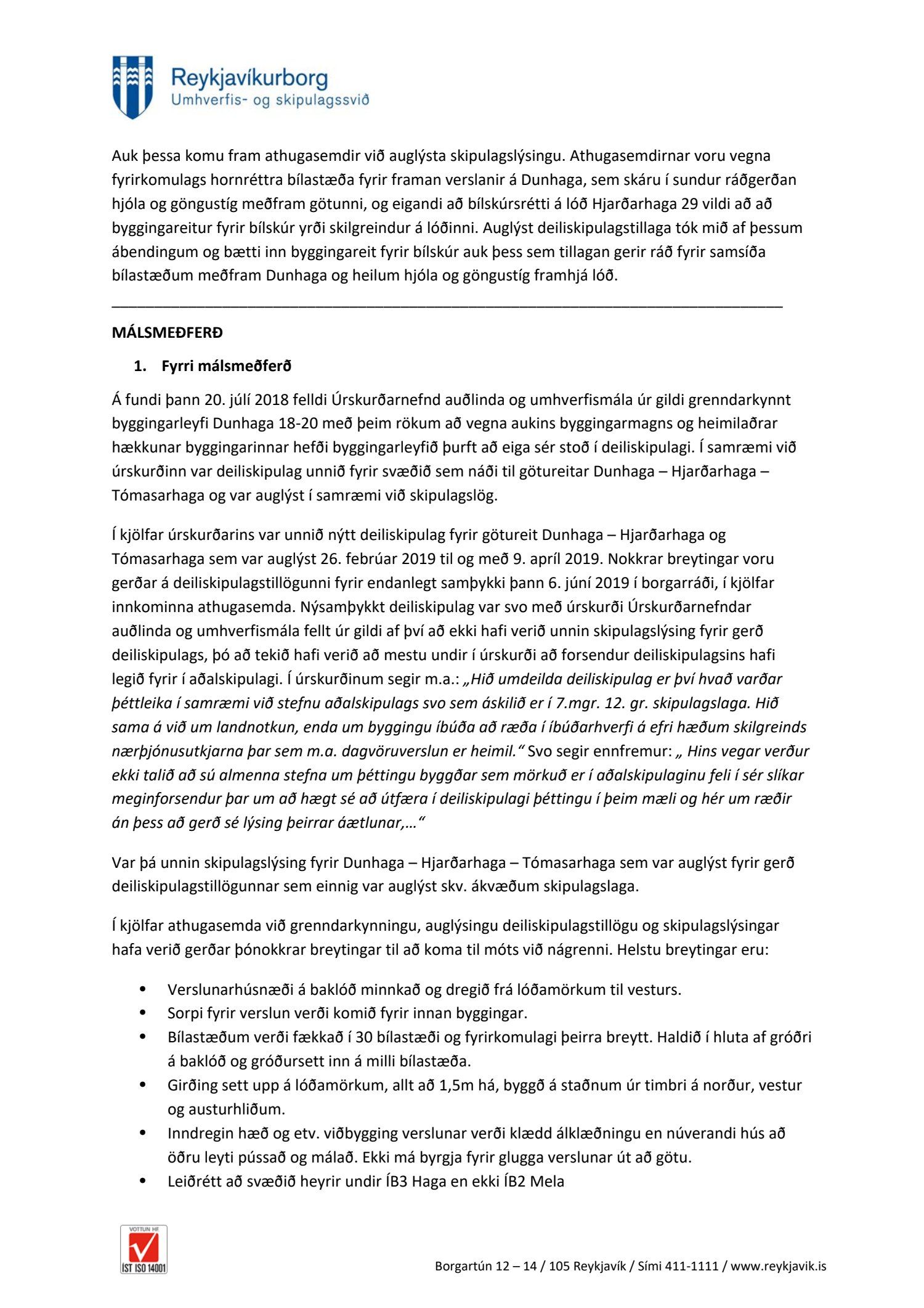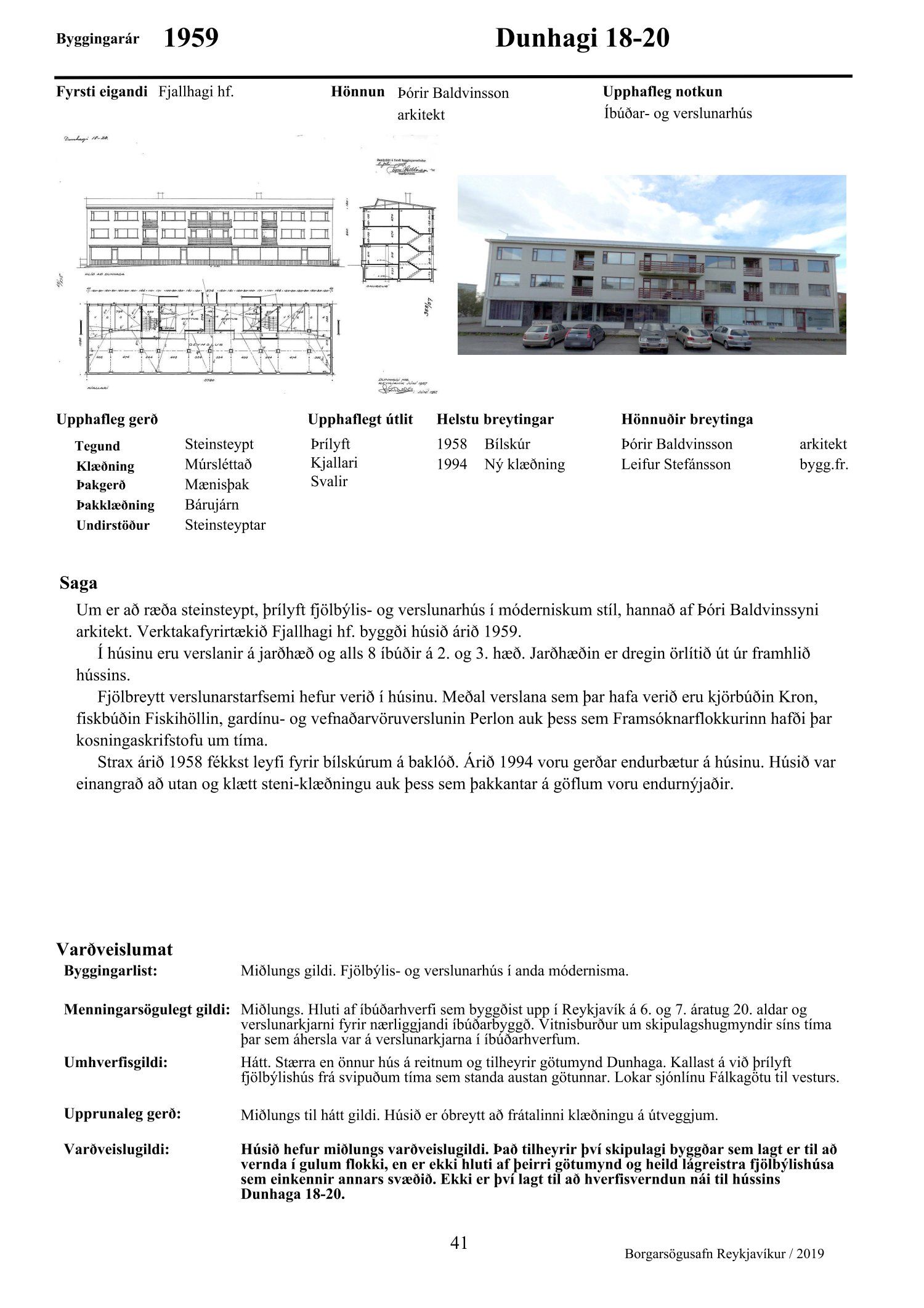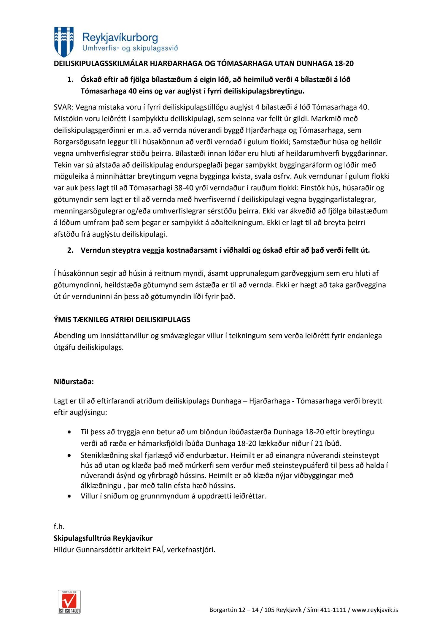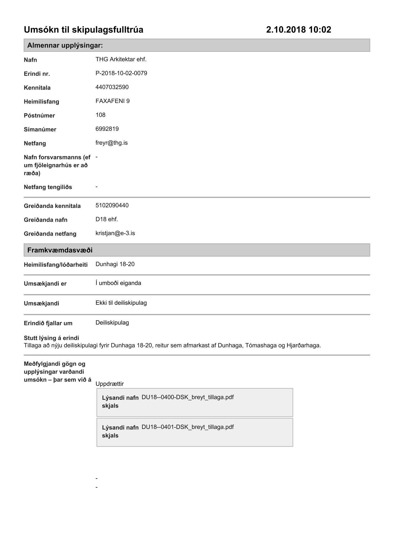 dags. 2. október 2018 um nýtt deiliskipulag fyrir svæði sem afmarkast af Dunhaga 18-20, Hjarðarhaga 27-33 og Tómasarhaga 32-46. Í tillögunni felst m.a. niðurrif og uppbygging á lóð nr. 18-20 við Dunhaga auk bílskúrsheimilda á þremur lóðum, samkvæmt deiliskipulags- og skuggavarpsuppdr.