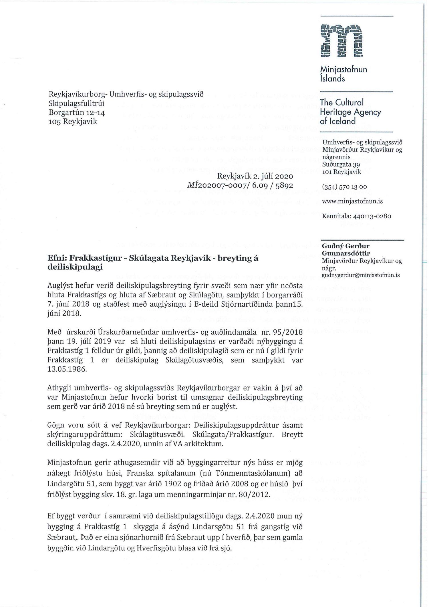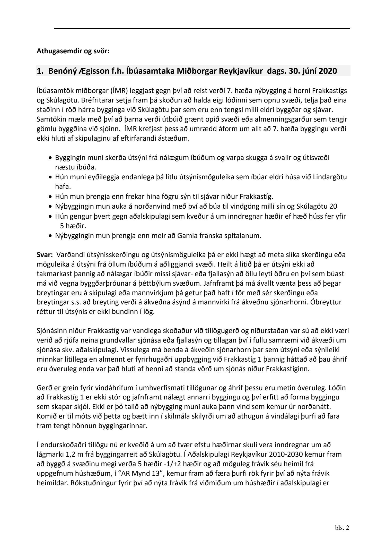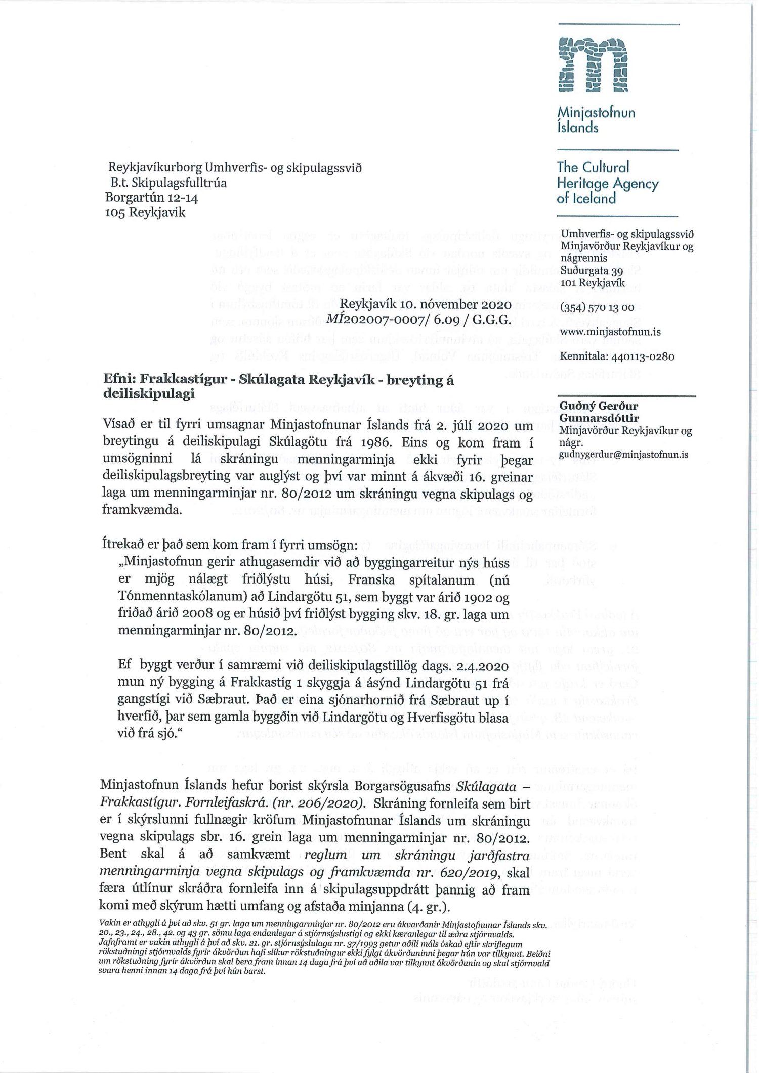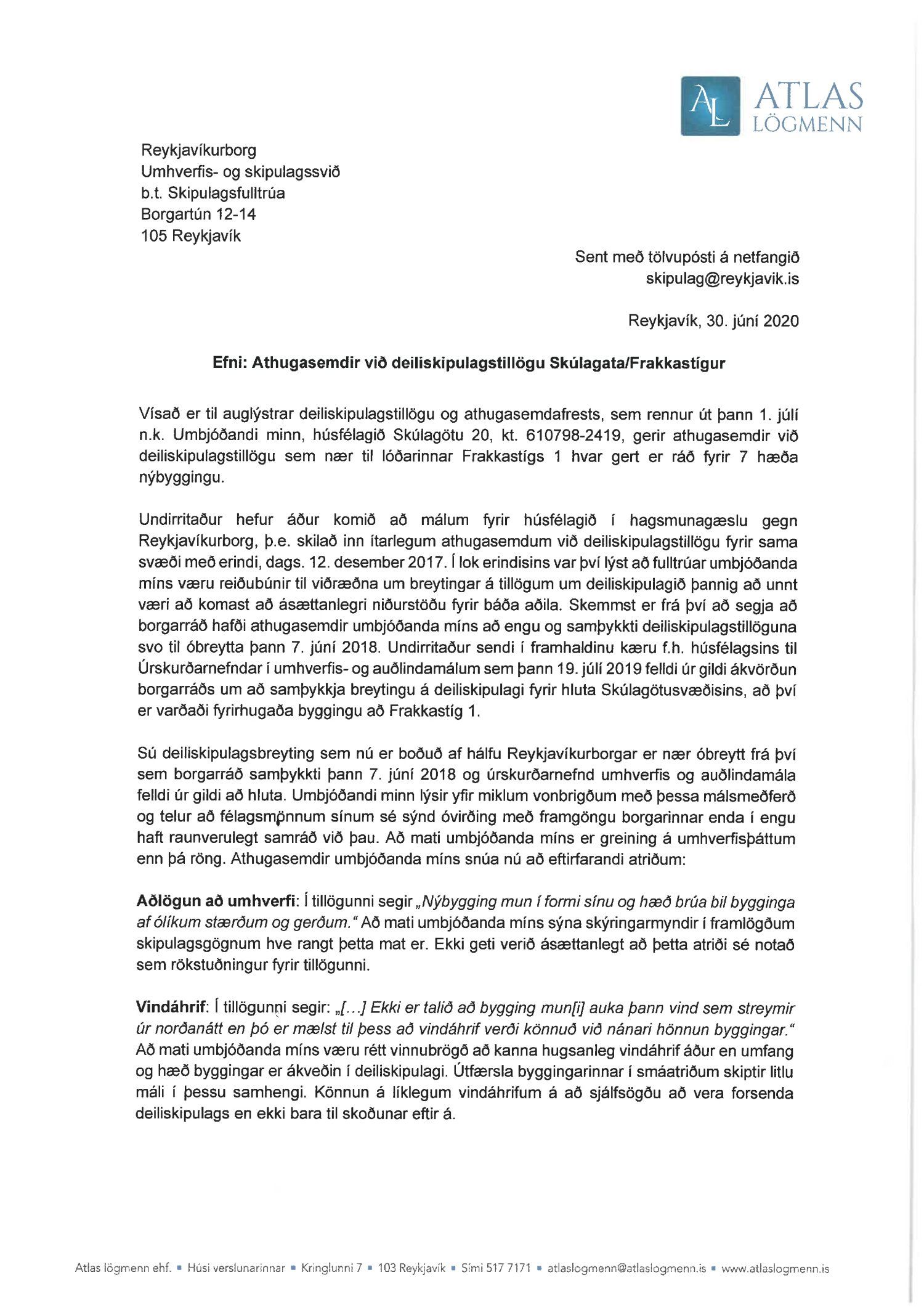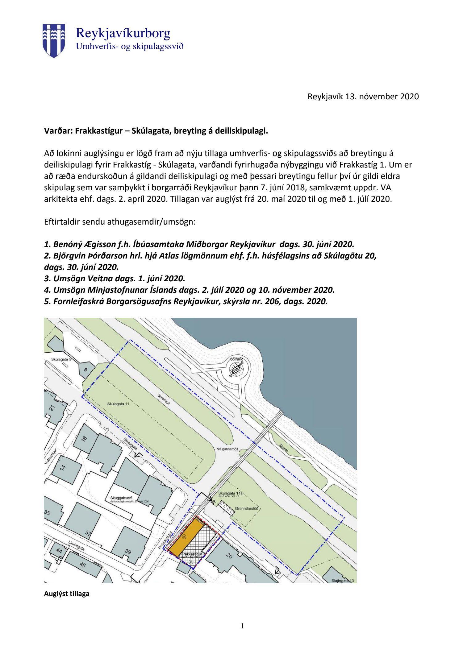 dags. 2. apríl 2020 br. 16. nóvember 2020. Tillagan var auglýst frá 20. maí 2020 til og með 1. júlí 2020. Eftirtaldir sendu athugasemdir/umsögn: Benóný Ægisson f.h. Íbúasamtaka Miðborgar Reykjavíkur dags. 30. júní 2020 og Björgvin Þórðarson hrl. hjá Atlas lögmönnum ehf. f.h. húsfélagsins að Skúlagötu 20, dags. 30. júní 2020. Einnig er lögð fram umsögn Veitna dags. 1. júní 2020, umsögn Minjastofnunar Íslands dags. 2. júlí 2020 og 10. nóvember 2020 og fornleifaskrá Borgarsögusafns Reykjavíkur, skýrsla nr. 206, dags. 2020. Einnig er lögð fram umsögn skipulagsfulltrúa, dags. 13. nóvember 2020.