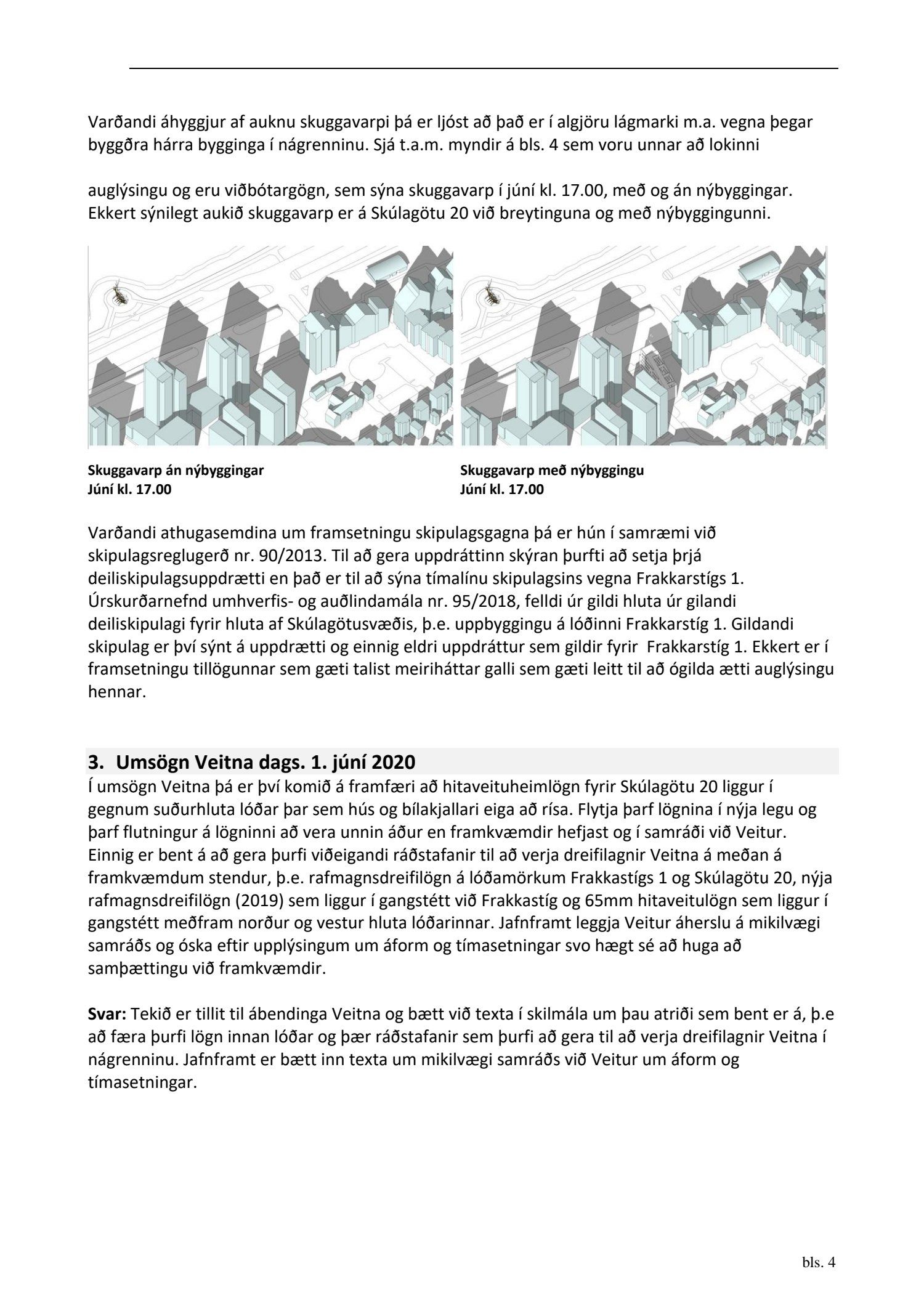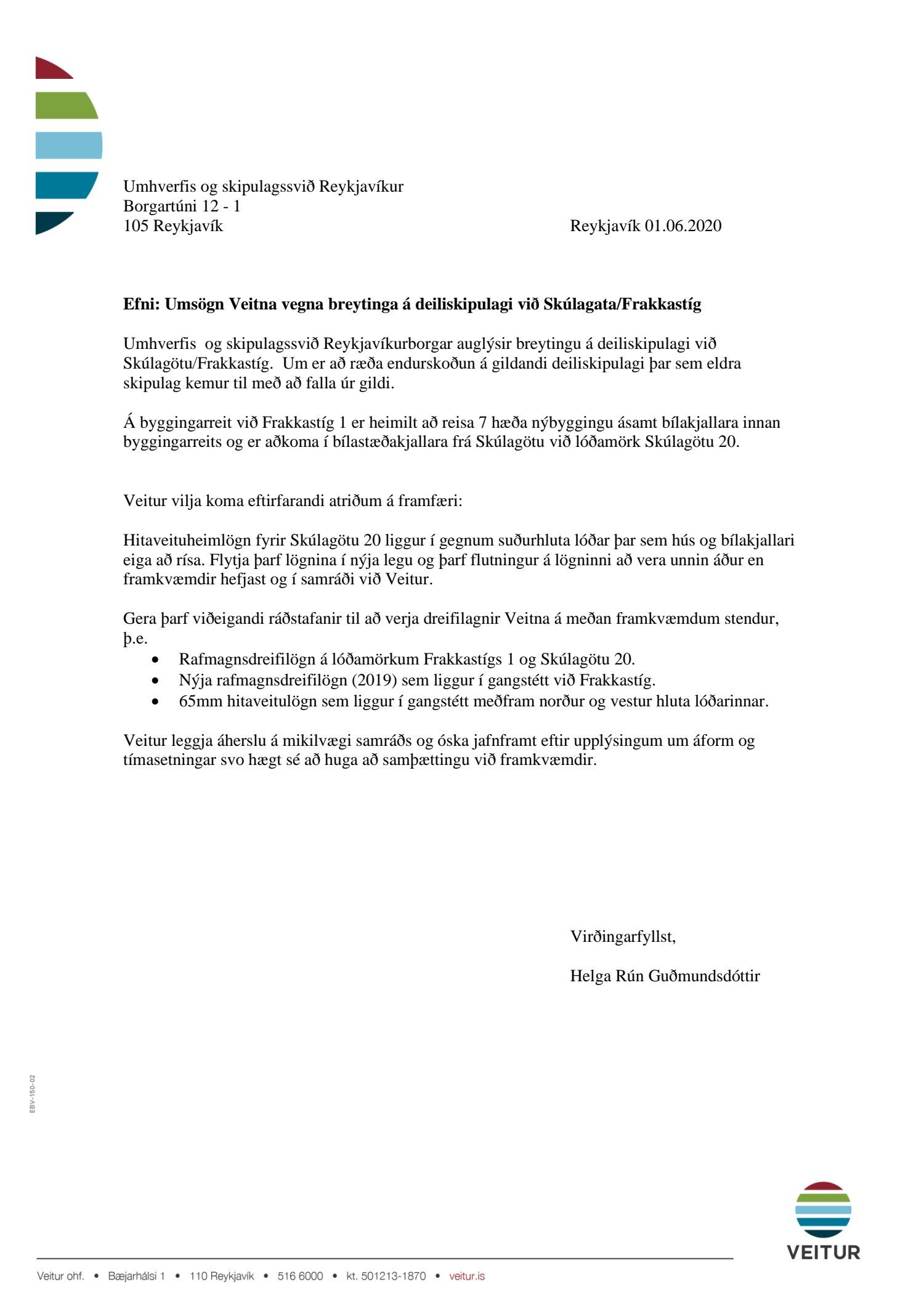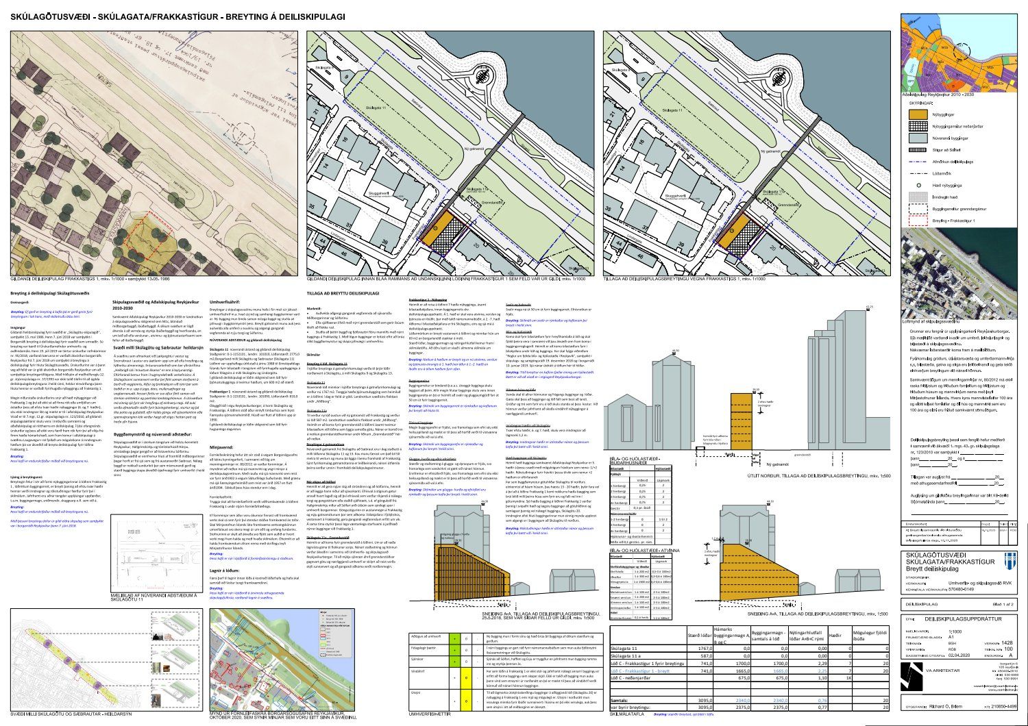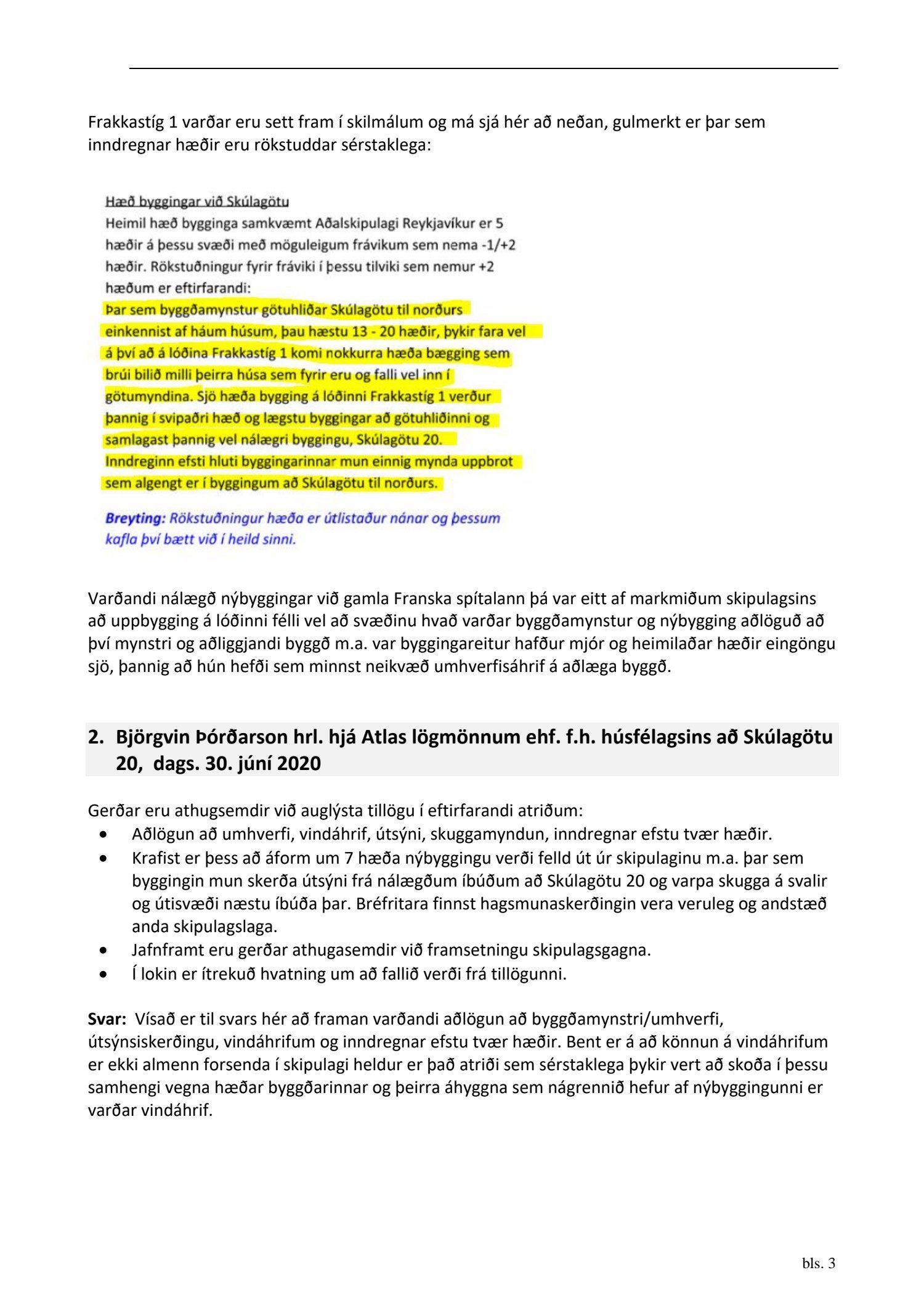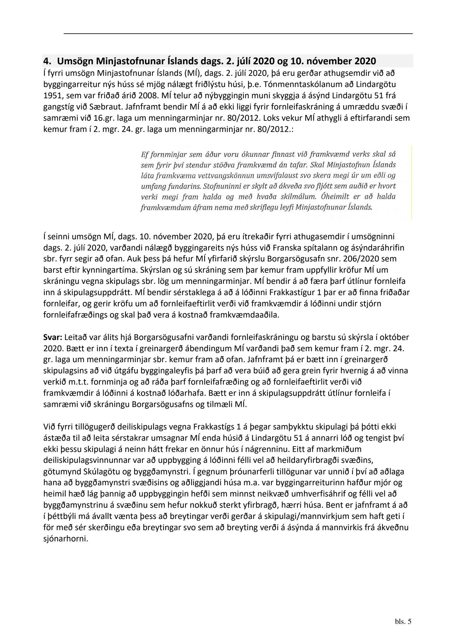 dags. 2. apríl 2020 br. 16. nóvember 2020. Tillagan var auglýst frá 20. maí 2020 til og með 1. júlí 2020. Eftirtaldir sendu athugasemdir/umsögn: Benóný Ægisson f.h. Íbúasamtaka Miðborgar Reykjavíkur dags. 30. júní 2020 og Björgvin Þórðarson hrl. hjá Atlas lögmönnum ehf. f.h. húsfélagsins að Skúlagötu 20, dags. 30. júní 2020. Einnig er lögð fram umsögn Veitna dags. 1. júní 2020, umsögn Minjastofnunar Íslands dags. 2. júlí 2020 og 10. nóvember 2020 og fornleifaskrá Borgarsögusafns Reykjavíkur, skýrsla nr. 206, dags. 2020. Einnig er lögð fram umsögn skipulagsfulltrúa, dags. 13. nóvember 2020.