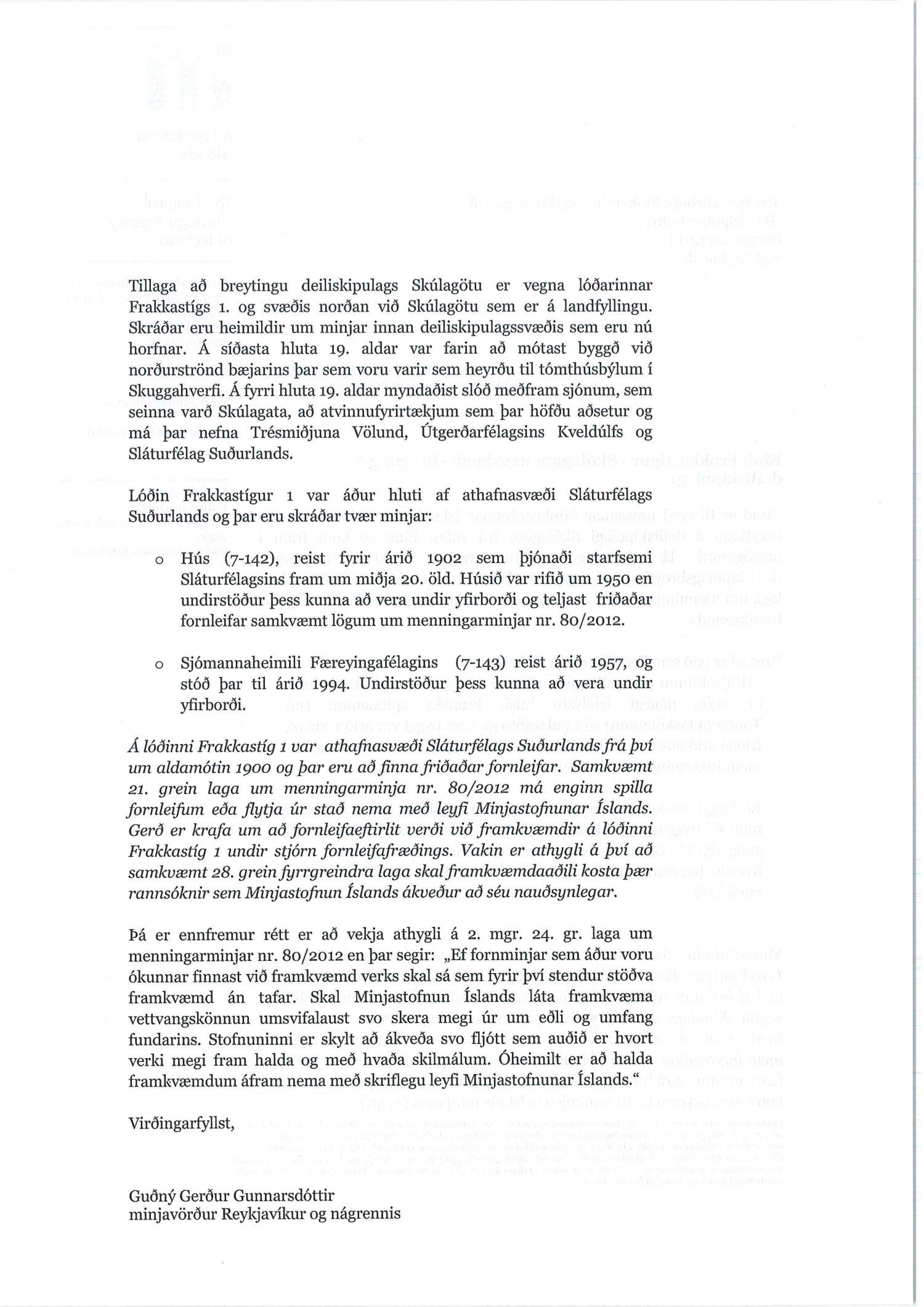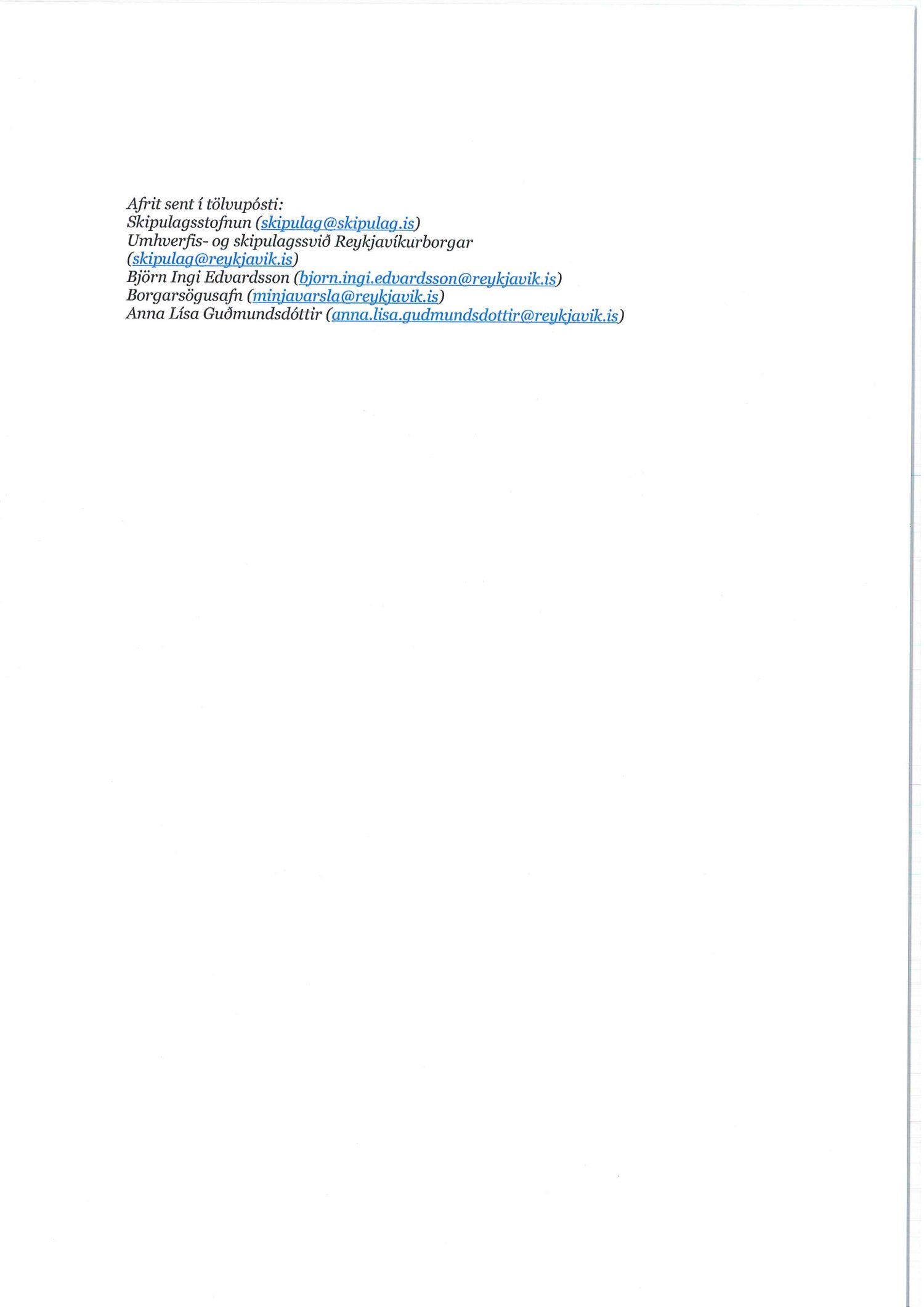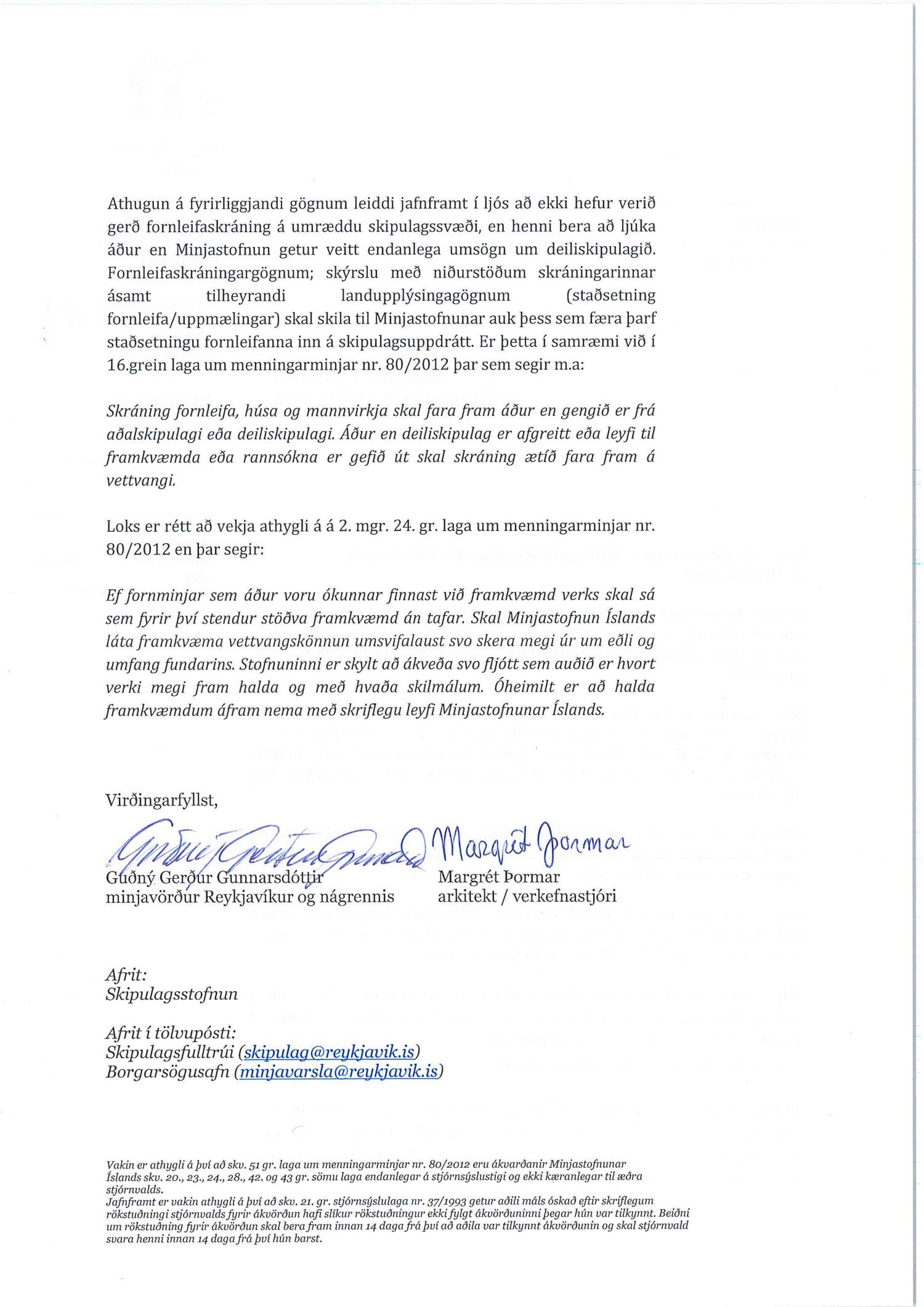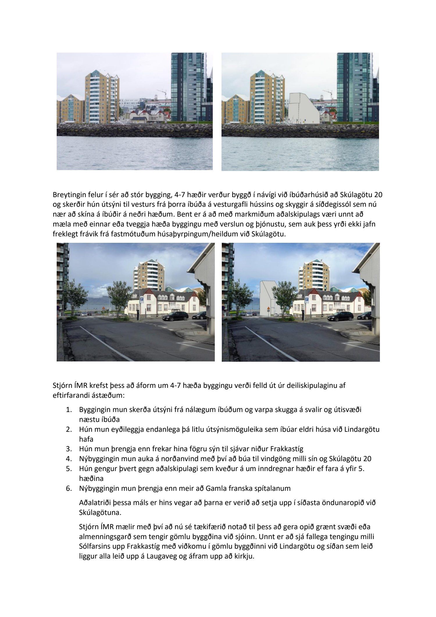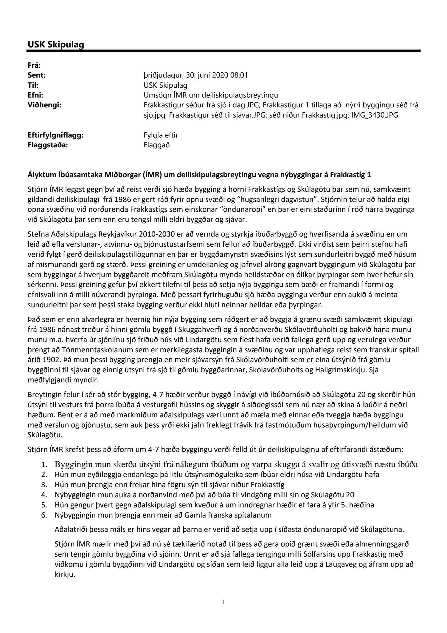 dags. 2. apríl 2020 br. 16. nóvember 2020. Tillagan var auglýst frá 20. maí 2020 til og með 1. júlí 2020. Eftirtaldir sendu athugasemdir/umsögn: Benóný Ægisson f.h. Íbúasamtaka Miðborgar Reykjavíkur dags. 30. júní 2020 og Björgvin Þórðarson hrl. hjá Atlas lögmönnum ehf. f.h. húsfélagsins að Skúlagötu 20, dags. 30. júní 2020. Einnig er lögð fram umsögn Veitna dags. 1. júní 2020, umsögn Minjastofnunar Íslands dags. 2. júlí 2020 og 10. nóvember 2020 og fornleifaskrá Borgarsögusafns Reykjavíkur, skýrsla nr. 206, dags. 2020. Einnig er lögð fram umsögn skipulagsfulltrúa, dags. 13. nóvember 2020.