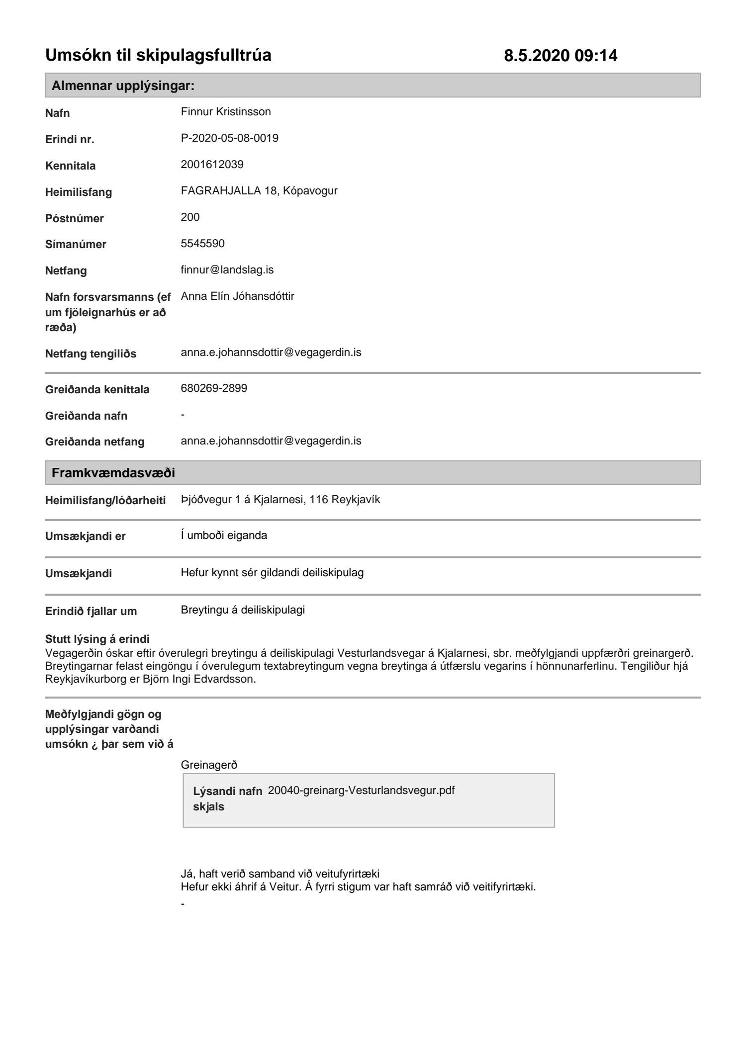 Samþykkt að falla frá kynningu þar sem breyting á deiliskipulagi varðar ekki hagsmuni annarra en umsækjanda með vísan til 2.ml. 3. mgr. 44. gr. skipulagslaga nr. 123/2010. Samþykkt með vísan til a liðar 1. gr. í viðauka 1.1 um fullnaðarafgreiðslur nú skipulags- og samgönguráðs án staðfestingar borgarráðs.