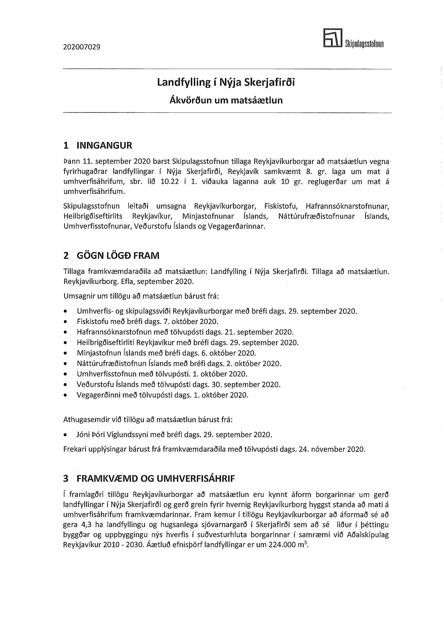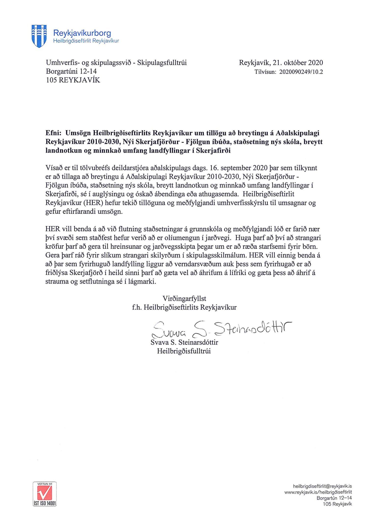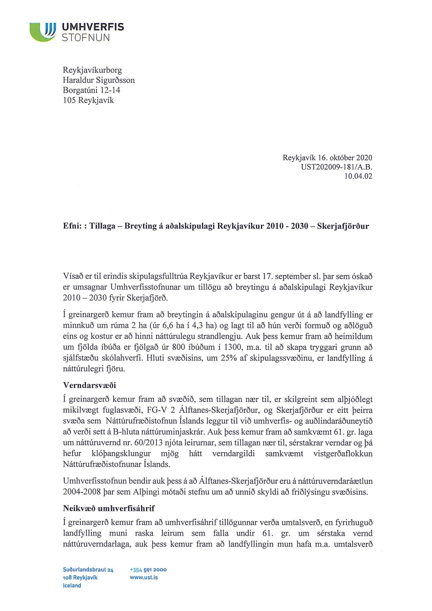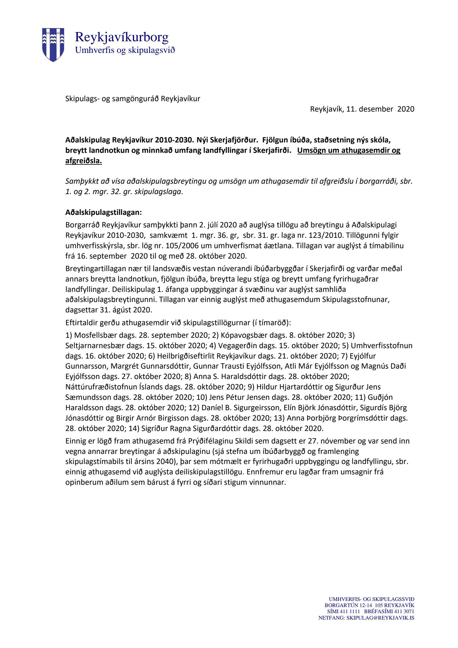 Að lokinni auglýsingu er lögð fram tillaga umhverfis- og skipulagssviðs dags. í júní 2020, síðast uppfærð 11. desember 2020 að breytingu á Aðalskipulagi Reykjavíkur 2010-2030. Tillögunni fylgir umhverfisskýrsla. Breytingartillagan nær til landsvæðis vestan núverandi íbúðarbyggðar í Skerjafirði og varðar meðal annars breytta landnotkun, fjölgun íbúða, breytta legu stíga og breytt umfang fyrirhugaðrar landfyllingar. Einnig er lagt fram bréf Skipulagsstofnunar dags. 31. ágúst 2020. Tillagan var auglýst frá 16. september 2020 til og með 28. október 2020. Eftirtaldir sendu athugasemdir/umsögn: Mosfellsbær dags. 28. september 2020, Kópavogsbær dags. 8. október 2020, Seltjarnarnesbær dags. 15. október 2020, Vegagerðin dags. 15. október 2020, Umhverfisstofnun dags. 16. október 2020, Heilbrigðiseftirlit Reykjavíkur dags. 21. október 2020, Eyjólfur Gunnarsson, Margrét Gunnarsdóttir, Gunnar Trausti Eyjólfsson, Atli Már Eyjólfsson og Magnús Daði Eyjólfsson dags. 27. október 2020, Anna S. Haraldsdóttir dags. 28. október 2020, Náttúrufræðistofnun Íslands dags. 28. október 2020, Hildur Hjartardóttir og Sigurður Jens Sæmundsson dags. 28. október 2020, Jens Pétur Jensen dags. 28. október 2020, Guðjón Haraldsson dags. 28. október 2020, Daníel B. Sigurgeirsson, Elín Björk Jónasdóttir, Sigurdís Björg Jónasdóttir og Birgir Arnór Birgisson dags. 28. október 2020, Anna Þorbjörg Þorgrímsdóttir dags. 28. október 2020 og Sigríður Ragna Sigurðardóttir dags. 28. október 2020. Einnig er lögð fram umsögn umhverfis- og skipulagssviðs dags. 11. desember 2020 og bréf Skipulagsstofnunar dags. 21. desember 2020 ásamt ákvörðun um matsskyldu vegna Landfyllingar í Nýja Skerjafirði. Einnig er lögð fram umsögn umhverfis- og skipulagssviðs dags. 11. desember 2020.