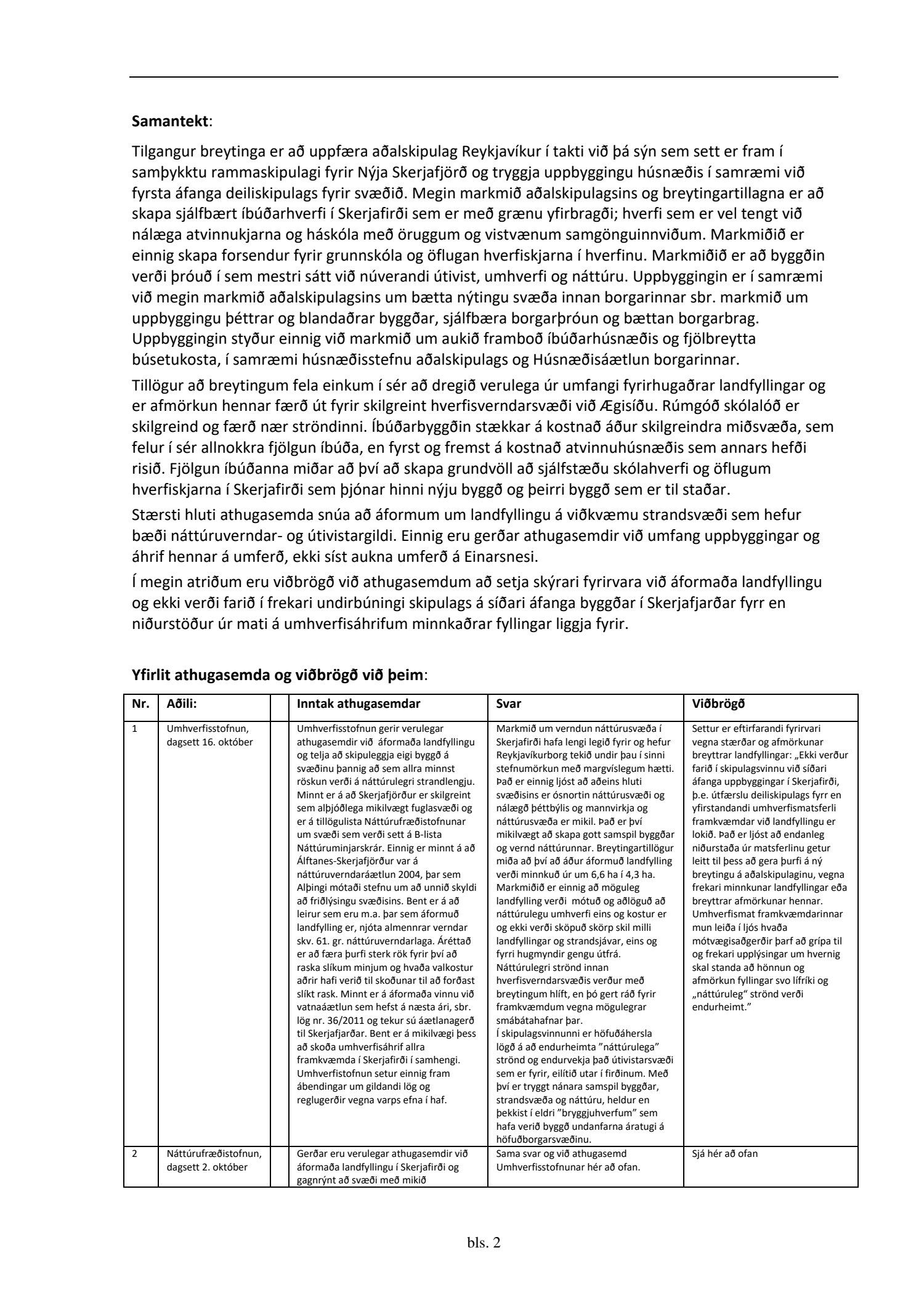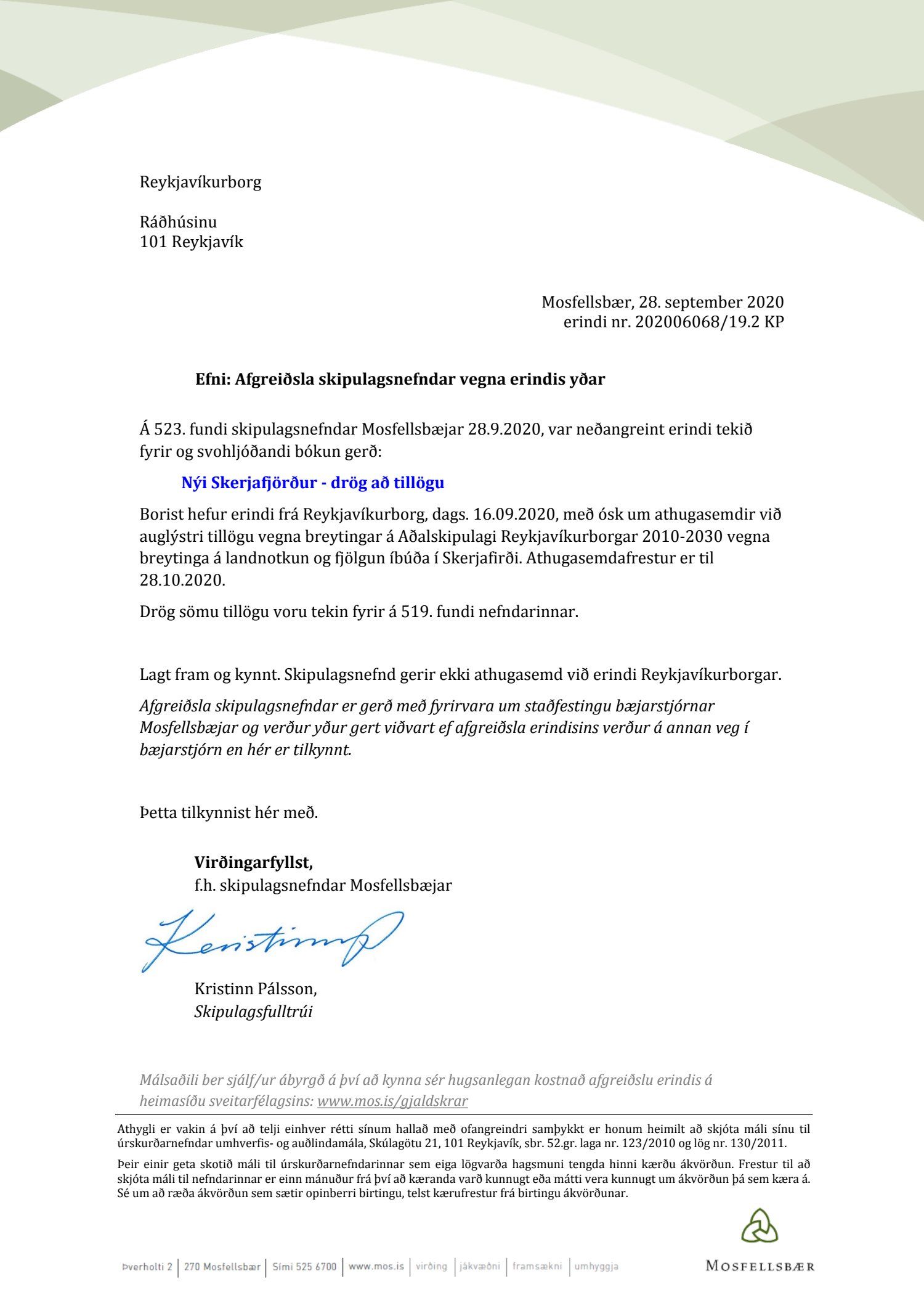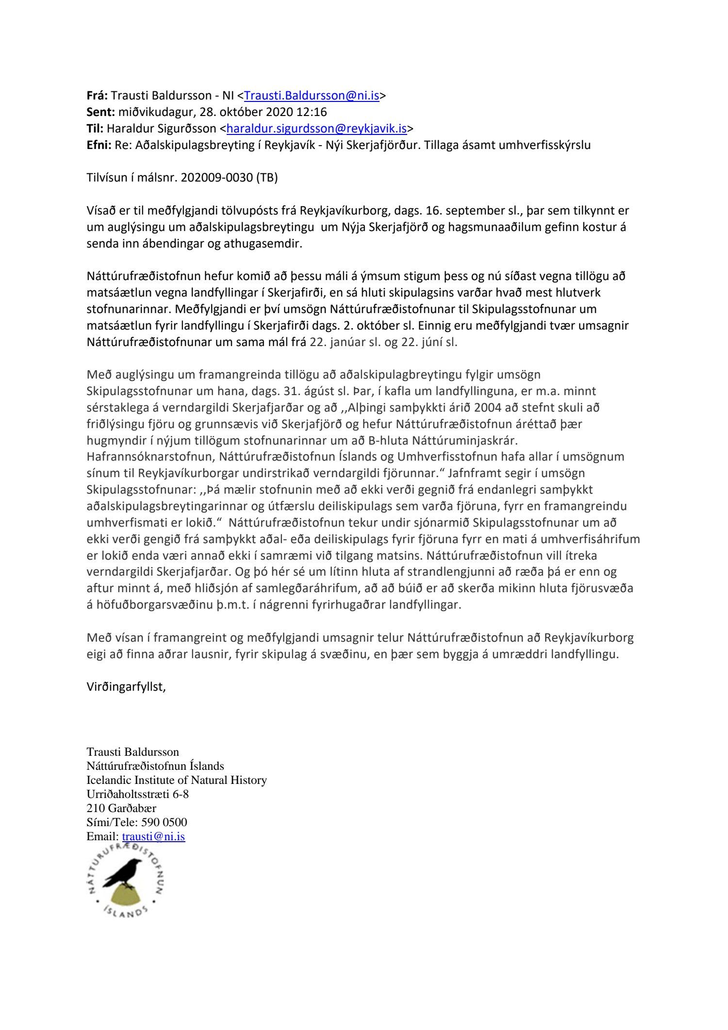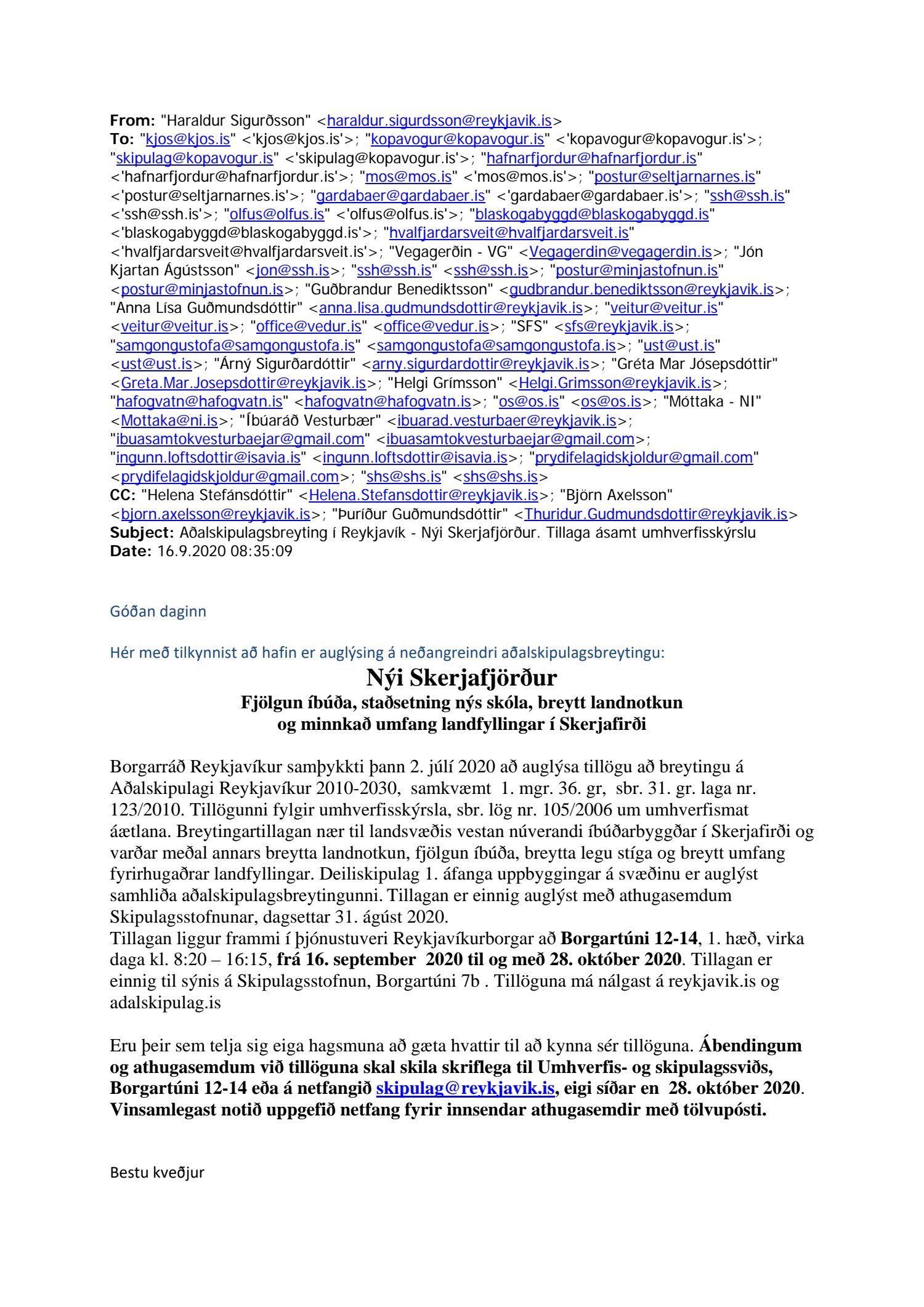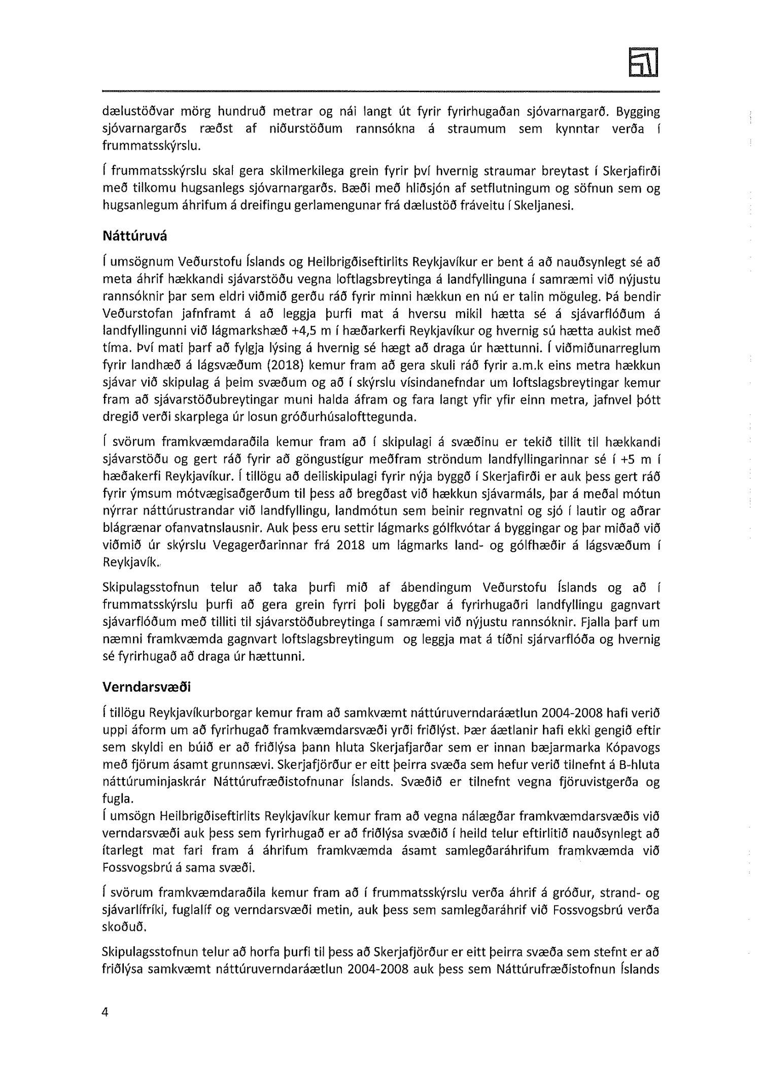 Að lokinni auglýsingu er lögð fram tillaga umhverfis- og skipulagssviðs dags. í júní 2020, síðast uppfærð 11. desember 2020 að breytingu á Aðalskipulagi Reykjavíkur 2010-2030. Tillögunni fylgir umhverfisskýrsla. Breytingartillagan nær til landsvæðis vestan núverandi íbúðarbyggðar í Skerjafirði og varðar meðal annars breytta landnotkun, fjölgun íbúða, breytta legu stíga og breytt umfang fyrirhugaðrar landfyllingar. Einnig er lagt fram bréf Skipulagsstofnunar dags. 31. ágúst 2020. Tillagan var auglýst frá 16. september 2020 til og með 28. október 2020. Eftirtaldir sendu athugasemdir/umsögn: Mosfellsbær dags. 28. september 2020, Kópavogsbær dags. 8. október 2020, Seltjarnarnesbær dags. 15. október 2020, Vegagerðin dags. 15. október 2020, Umhverfisstofnun dags. 16. október 2020, Heilbrigðiseftirlit Reykjavíkur dags. 21. október 2020, Eyjólfur Gunnarsson, Margrét Gunnarsdóttir, Gunnar Trausti Eyjólfsson, Atli Már Eyjólfsson og Magnús Daði Eyjólfsson dags. 27. október 2020, Anna S. Haraldsdóttir dags. 28. október 2020, Náttúrufræðistofnun Íslands dags. 28. október 2020, Hildur Hjartardóttir og Sigurður Jens Sæmundsson dags. 28. október 2020, Jens Pétur Jensen dags. 28. október 2020, Guðjón Haraldsson dags. 28. október 2020, Daníel B. Sigurgeirsson, Elín Björk Jónasdóttir, Sigurdís Björg Jónasdóttir og Birgir Arnór Birgisson dags. 28. október 2020, Anna Þorbjörg Þorgrímsdóttir dags. 28. október 2020 og Sigríður Ragna Sigurðardóttir dags. 28. október 2020. Einnig er lögð fram umsögn umhverfis- og skipulagssviðs dags. 11. desember 2020 og bréf Skipulagsstofnunar dags. 21. desember 2020 ásamt ákvörðun um matsskyldu vegna Landfyllingar í Nýja Skerjafirði. Einnig er lögð fram umsögn umhverfis- og skipulagssviðs dags. 11. desember 2020.