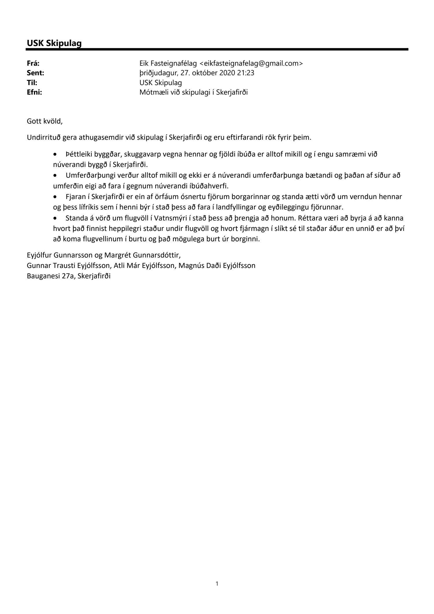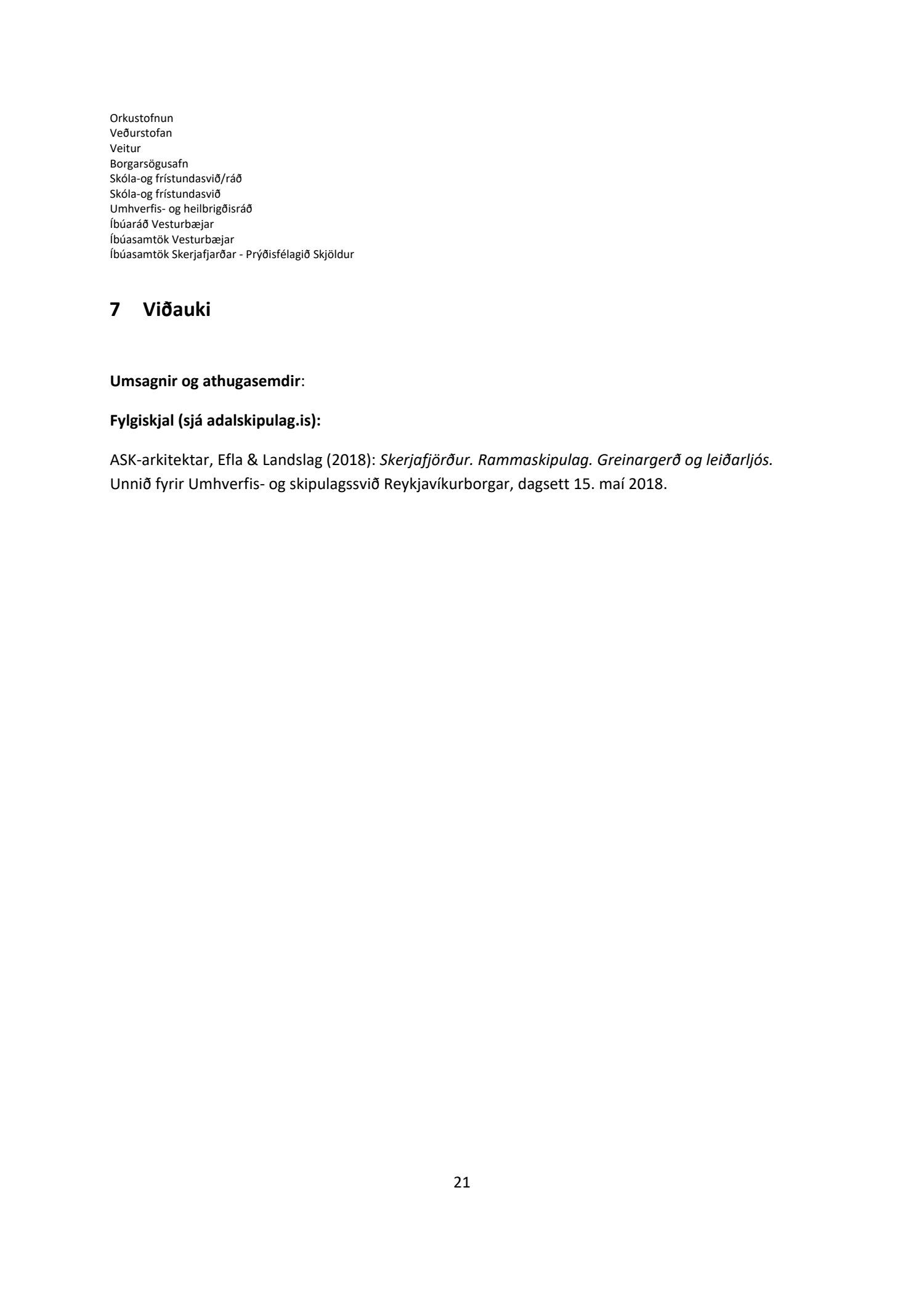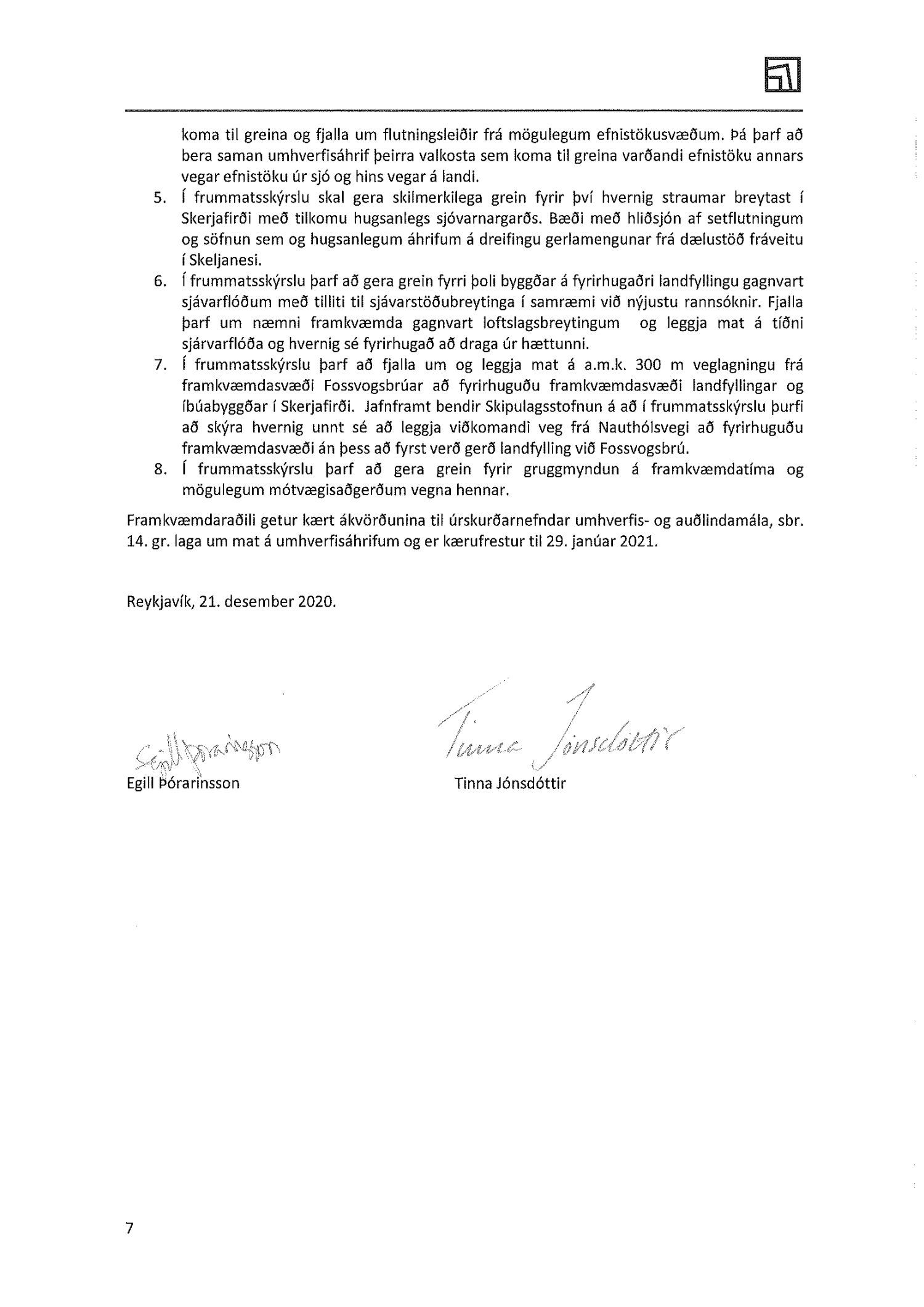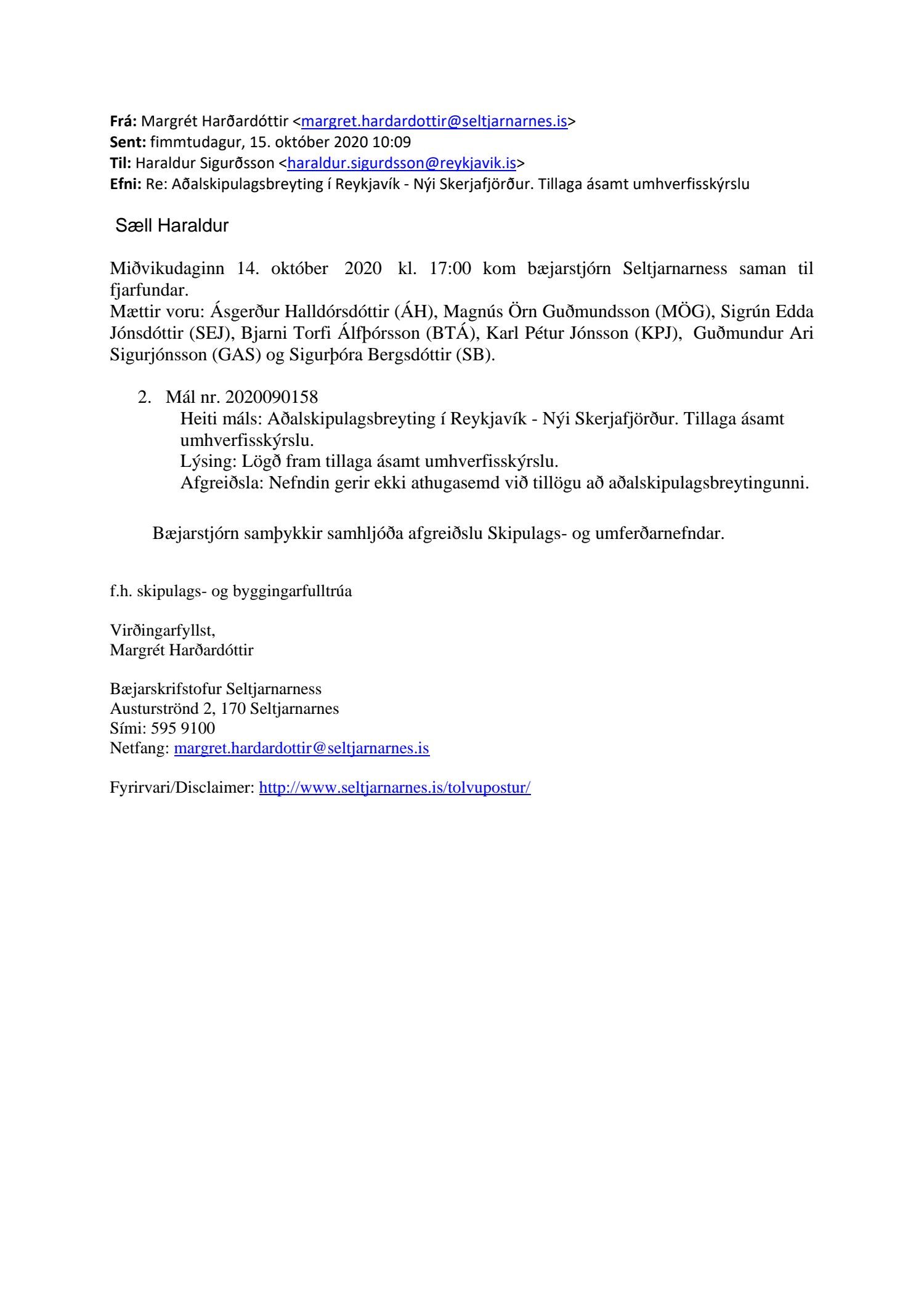 Að lokinni auglýsingu er lögð fram tillaga umhverfis- og skipulagssviðs dags. í júní 2020, síðast uppfærð 11. desember 2020 að breytingu á Aðalskipulagi Reykjavíkur 2010-2030. Tillögunni fylgir umhverfisskýrsla. Breytingartillagan nær til landsvæðis vestan núverandi íbúðarbyggðar í Skerjafirði og varðar meðal annars breytta landnotkun, fjölgun íbúða, breytta legu stíga og breytt umfang fyrirhugaðrar landfyllingar. Einnig er lagt fram bréf Skipulagsstofnunar dags. 31. ágúst 2020. Tillagan var auglýst frá 16. september 2020 til og með 28. október 2020. Eftirtaldir sendu athugasemdir/umsögn: Mosfellsbær dags. 28. september 2020, Kópavogsbær dags. 8. október 2020, Seltjarnarnesbær dags. 15. október 2020, Vegagerðin dags. 15. október 2020, Umhverfisstofnun dags. 16. október 2020, Heilbrigðiseftirlit Reykjavíkur dags. 21. október 2020, Eyjólfur Gunnarsson, Margrét Gunnarsdóttir, Gunnar Trausti Eyjólfsson, Atli Már Eyjólfsson og Magnús Daði Eyjólfsson dags. 27. október 2020, Anna S. Haraldsdóttir dags. 28. október 2020, Náttúrufræðistofnun Íslands dags. 28. október 2020, Hildur Hjartardóttir og Sigurður Jens Sæmundsson dags. 28. október 2020, Jens Pétur Jensen dags. 28. október 2020, Guðjón Haraldsson dags. 28. október 2020, Daníel B. Sigurgeirsson, Elín Björk Jónasdóttir, Sigurdís Björg Jónasdóttir og Birgir Arnór Birgisson dags. 28. október 2020, Anna Þorbjörg Þorgrímsdóttir dags. 28. október 2020 og Sigríður Ragna Sigurðardóttir dags. 28. október 2020. Einnig er lögð fram umsögn umhverfis- og skipulagssviðs dags. 11. desember 2020 og bréf Skipulagsstofnunar dags. 21. desember 2020 ásamt ákvörðun um matsskyldu vegna Landfyllingar í Nýja Skerjafirði. Einnig er lögð fram umsögn umhverfis- og skipulagssviðs dags. 11. desember 2020.