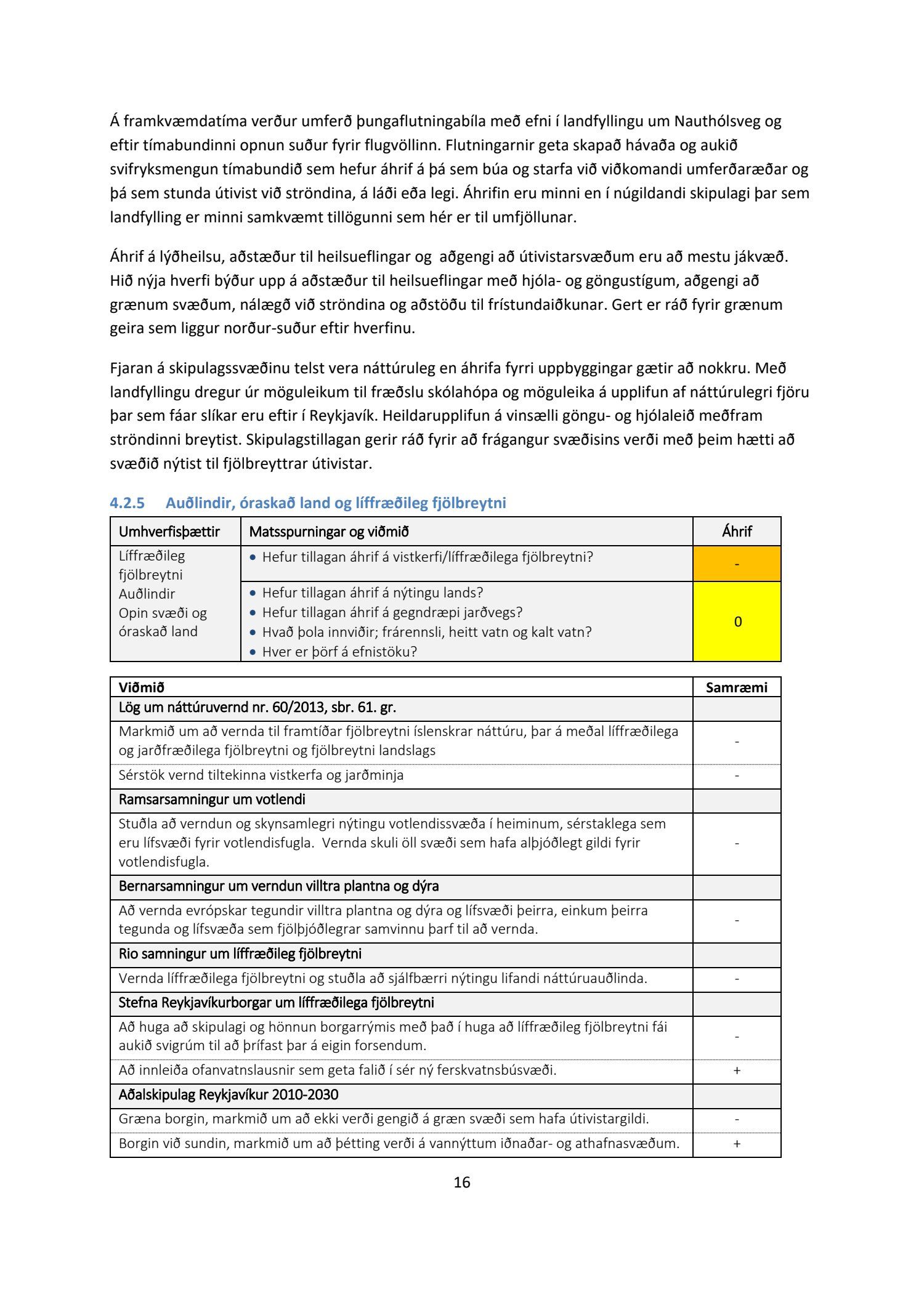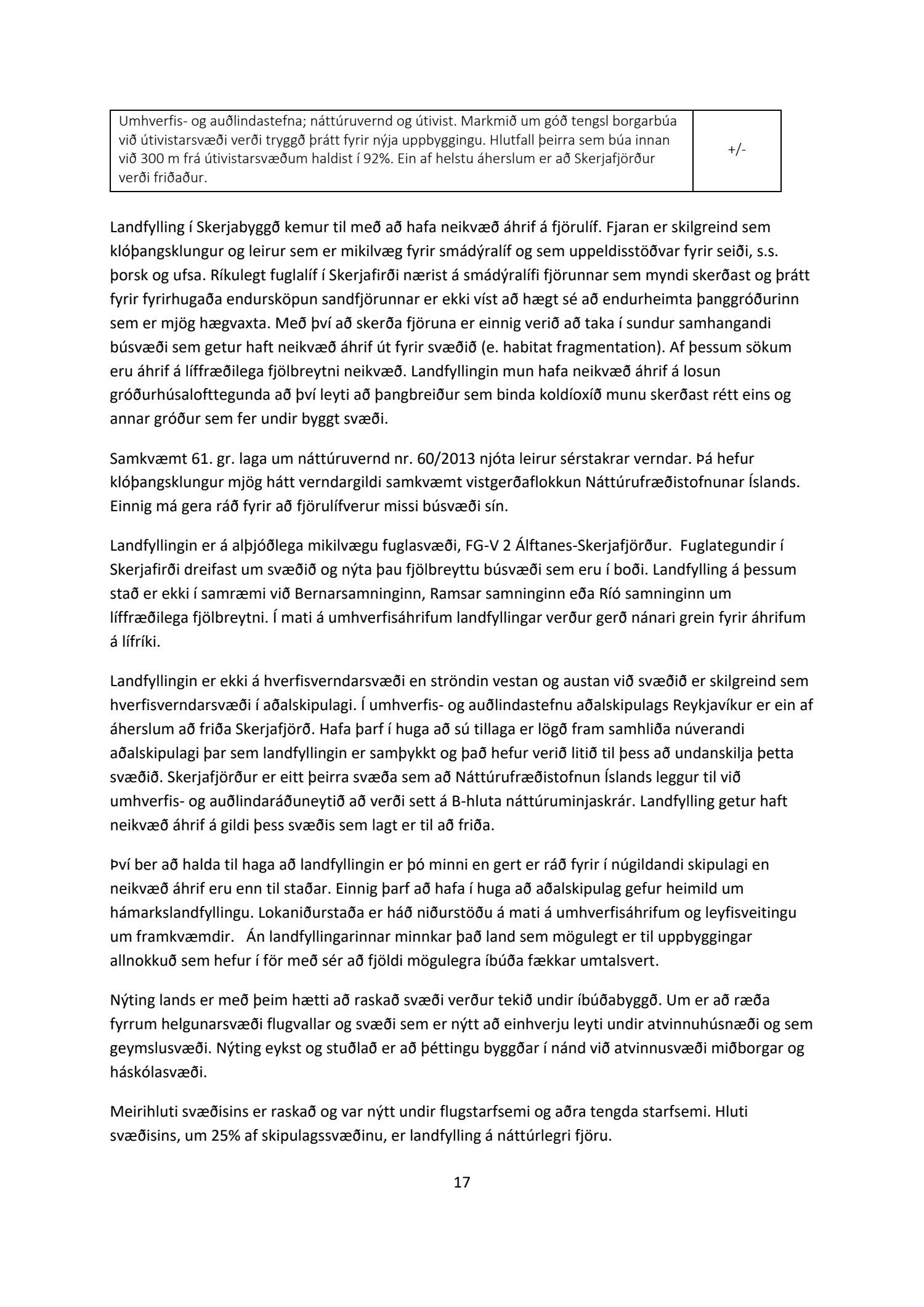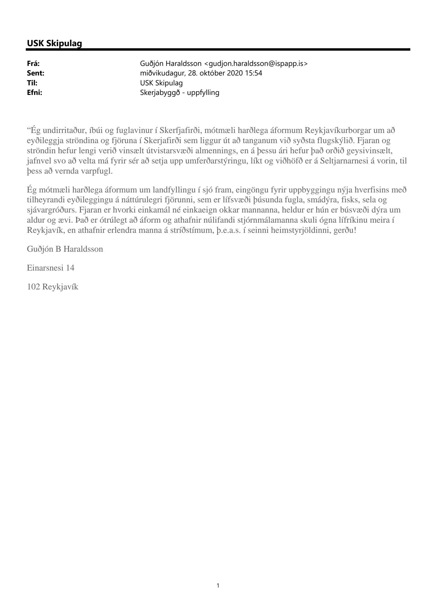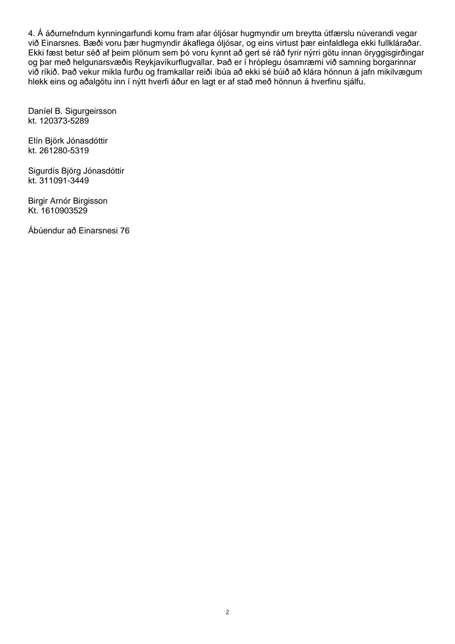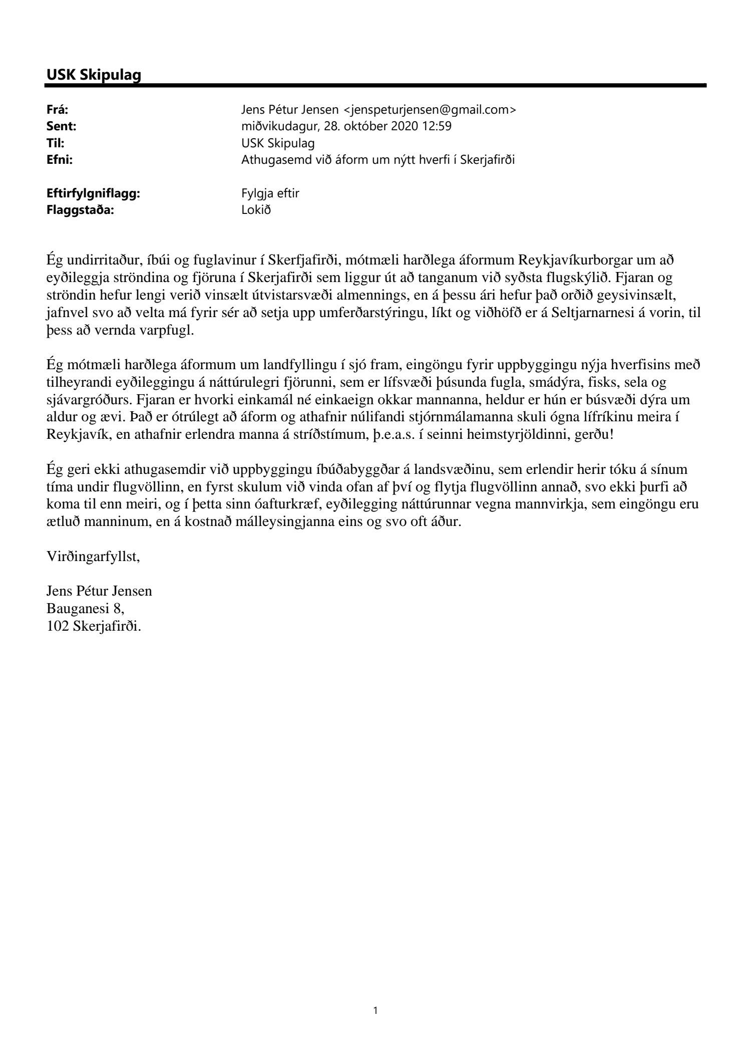 Að lokinni auglýsingu er lögð fram tillaga umhverfis- og skipulagssviðs dags. í júní 2020, síðast uppfærð 11. desember 2020 að breytingu á Aðalskipulagi Reykjavíkur 2010-2030. Tillögunni fylgir umhverfisskýrsla. Breytingartillagan nær til landsvæðis vestan núverandi íbúðarbyggðar í Skerjafirði og varðar meðal annars breytta landnotkun, fjölgun íbúða, breytta legu stíga og breytt umfang fyrirhugaðrar landfyllingar. Einnig er lagt fram bréf Skipulagsstofnunar dags. 31. ágúst 2020. Tillagan var auglýst frá 16. september 2020 til og með 28. október 2020. Eftirtaldir sendu athugasemdir/umsögn: Mosfellsbær dags. 28. september 2020, Kópavogsbær dags. 8. október 2020, Seltjarnarnesbær dags. 15. október 2020, Vegagerðin dags. 15. október 2020, Umhverfisstofnun dags. 16. október 2020, Heilbrigðiseftirlit Reykjavíkur dags. 21. október 2020, Eyjólfur Gunnarsson, Margrét Gunnarsdóttir, Gunnar Trausti Eyjólfsson, Atli Már Eyjólfsson og Magnús Daði Eyjólfsson dags. 27. október 2020, Anna S. Haraldsdóttir dags. 28. október 2020, Náttúrufræðistofnun Íslands dags. 28. október 2020, Hildur Hjartardóttir og Sigurður Jens Sæmundsson dags. 28. október 2020, Jens Pétur Jensen dags. 28. október 2020, Guðjón Haraldsson dags. 28. október 2020, Daníel B. Sigurgeirsson, Elín Björk Jónasdóttir, Sigurdís Björg Jónasdóttir og Birgir Arnór Birgisson dags. 28. október 2020, Anna Þorbjörg Þorgrímsdóttir dags. 28. október 2020 og Sigríður Ragna Sigurðardóttir dags. 28. október 2020. Einnig er lögð fram umsögn umhverfis- og skipulagssviðs dags. 11. desember 2020 og bréf Skipulagsstofnunar dags. 21. desember 2020 ásamt ákvörðun um matsskyldu vegna Landfyllingar í Nýja Skerjafirði. Einnig er lögð fram umsögn umhverfis- og skipulagssviðs dags. 11. desember 2020.