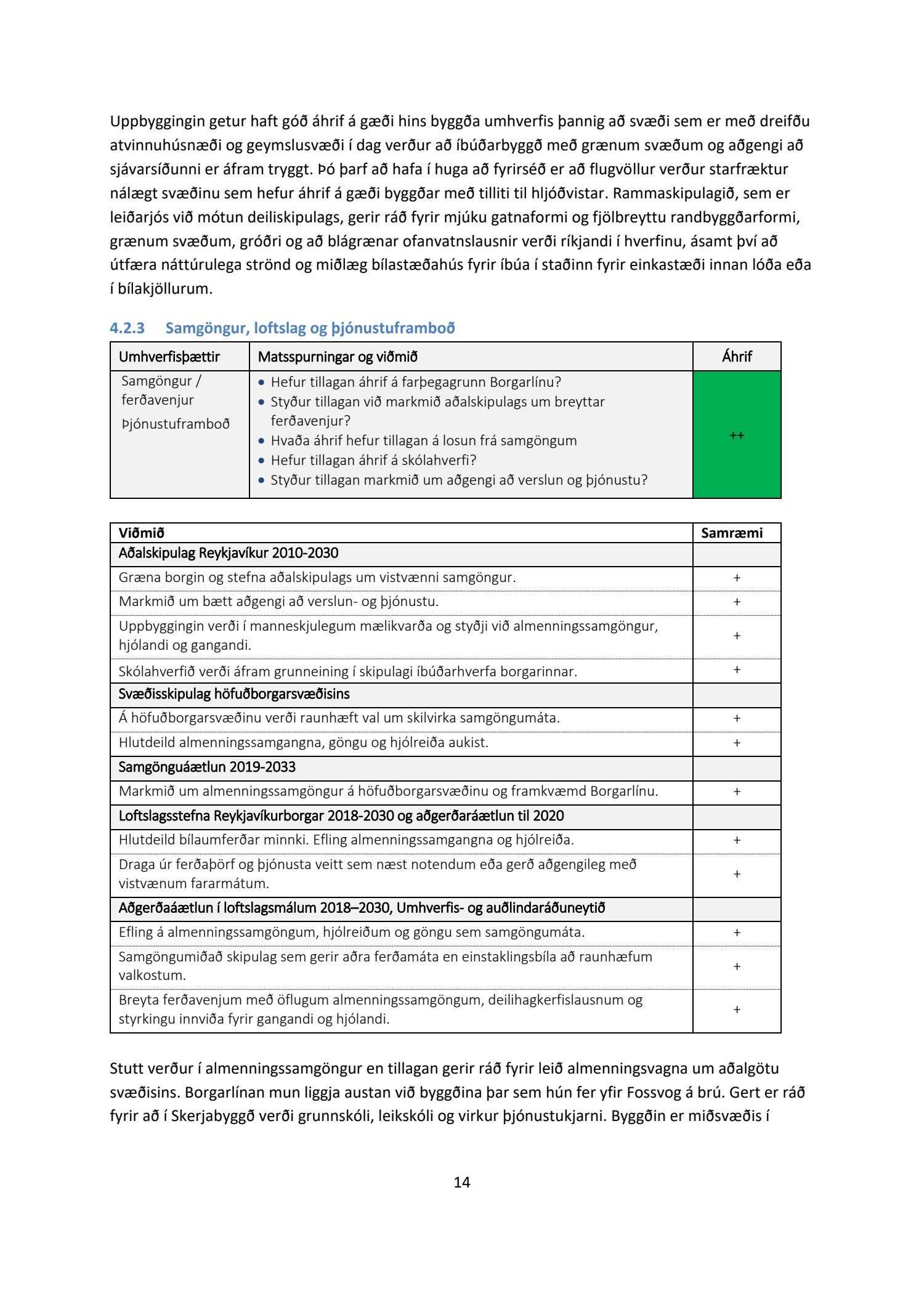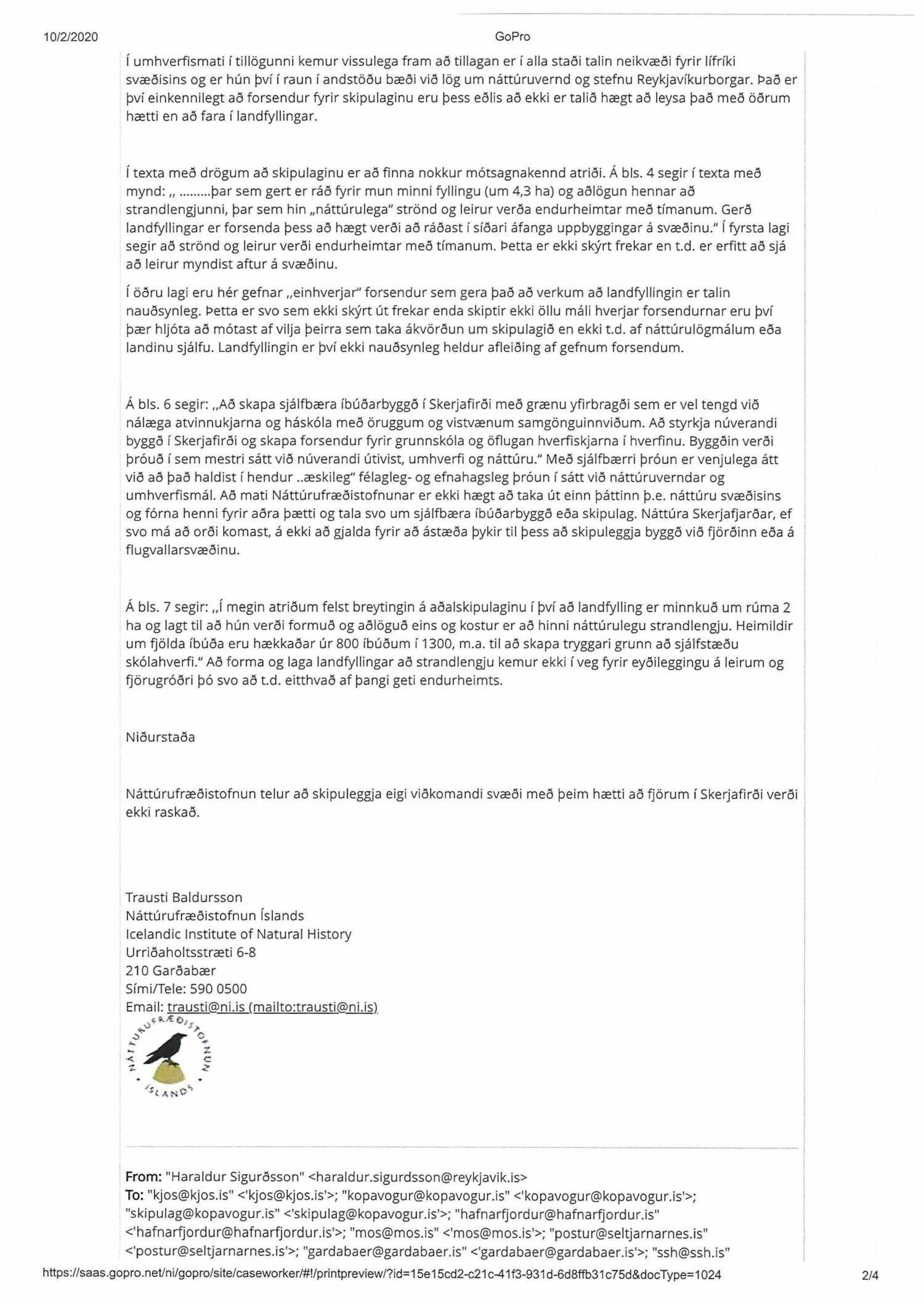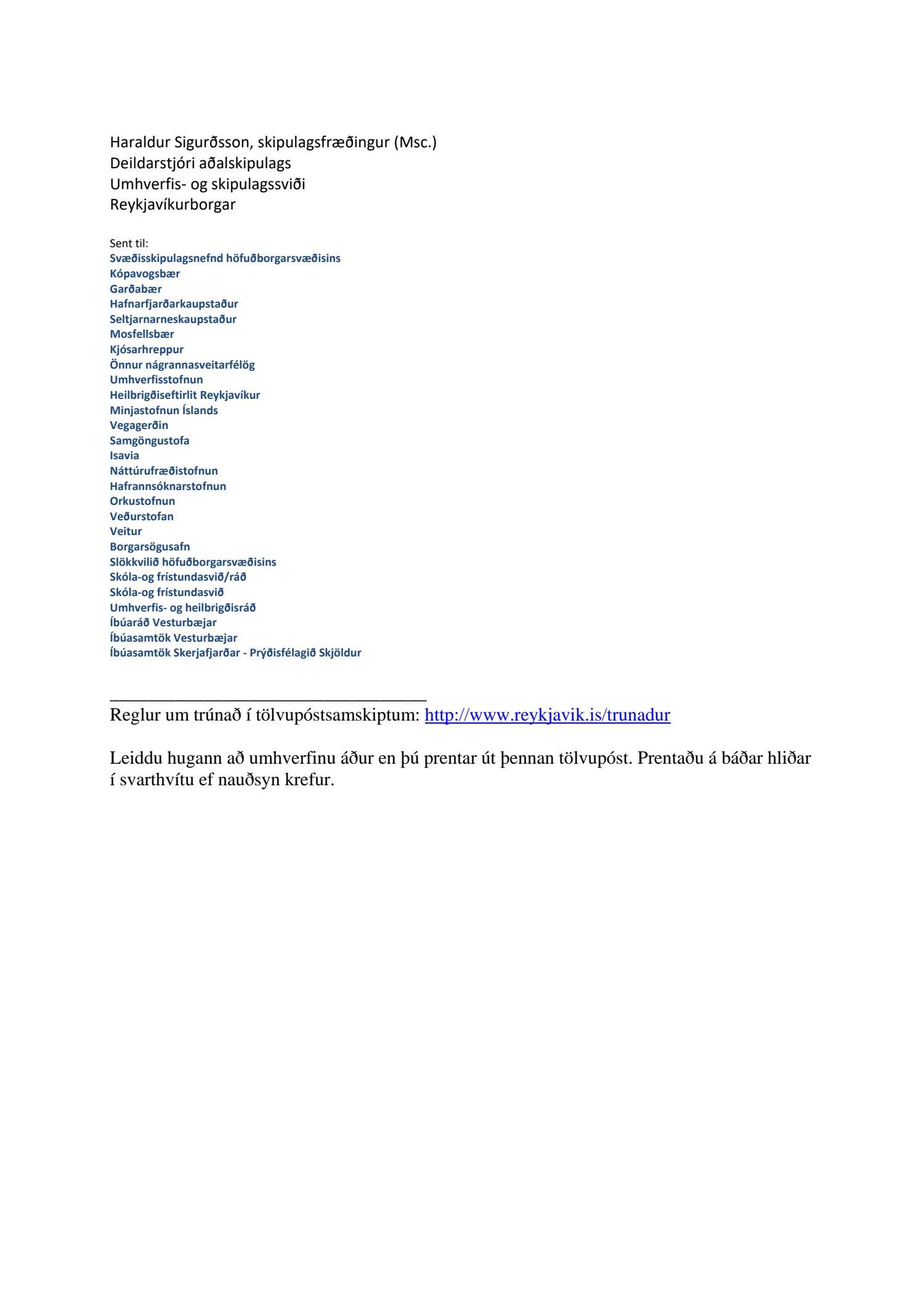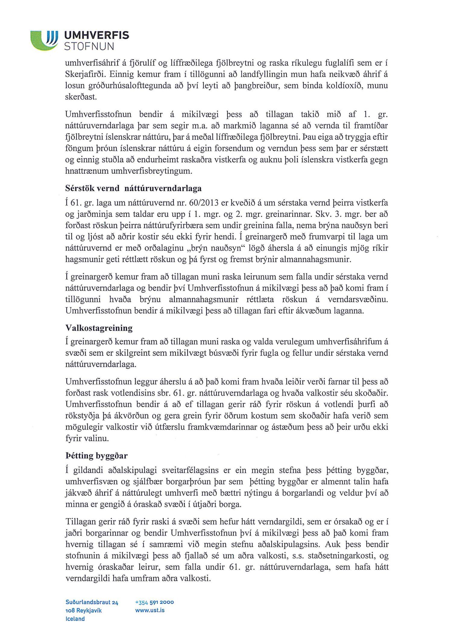 Að lokinni auglýsingu er lögð fram tillaga umhverfis- og skipulagssviðs dags. í júní 2020, síðast uppfærð 11. desember 2020 að breytingu á Aðalskipulagi Reykjavíkur 2010-2030. Tillögunni fylgir umhverfisskýrsla. Breytingartillagan nær til landsvæðis vestan núverandi íbúðarbyggðar í Skerjafirði og varðar meðal annars breytta landnotkun, fjölgun íbúða, breytta legu stíga og breytt umfang fyrirhugaðrar landfyllingar. Einnig er lagt fram bréf Skipulagsstofnunar dags. 31. ágúst 2020. Tillagan var auglýst frá 16. september 2020 til og með 28. október 2020. Eftirtaldir sendu athugasemdir/umsögn: Mosfellsbær dags. 28. september 2020, Kópavogsbær dags. 8. október 2020, Seltjarnarnesbær dags. 15. október 2020, Vegagerðin dags. 15. október 2020, Umhverfisstofnun dags. 16. október 2020, Heilbrigðiseftirlit Reykjavíkur dags. 21. október 2020, Eyjólfur Gunnarsson, Margrét Gunnarsdóttir, Gunnar Trausti Eyjólfsson, Atli Már Eyjólfsson og Magnús Daði Eyjólfsson dags. 27. október 2020, Anna S. Haraldsdóttir dags. 28. október 2020, Náttúrufræðistofnun Íslands dags. 28. október 2020, Hildur Hjartardóttir og Sigurður Jens Sæmundsson dags. 28. október 2020, Jens Pétur Jensen dags. 28. október 2020, Guðjón Haraldsson dags. 28. október 2020, Daníel B. Sigurgeirsson, Elín Björk Jónasdóttir, Sigurdís Björg Jónasdóttir og Birgir Arnór Birgisson dags. 28. október 2020, Anna Þorbjörg Þorgrímsdóttir dags. 28. október 2020 og Sigríður Ragna Sigurðardóttir dags. 28. október 2020. Einnig er lögð fram umsögn umhverfis- og skipulagssviðs dags. 11. desember 2020 og bréf Skipulagsstofnunar dags. 21. desember 2020 ásamt ákvörðun um matsskyldu vegna Landfyllingar í Nýja Skerjafirði. Einnig er lögð fram umsögn umhverfis- og skipulagssviðs dags. 11. desember 2020.