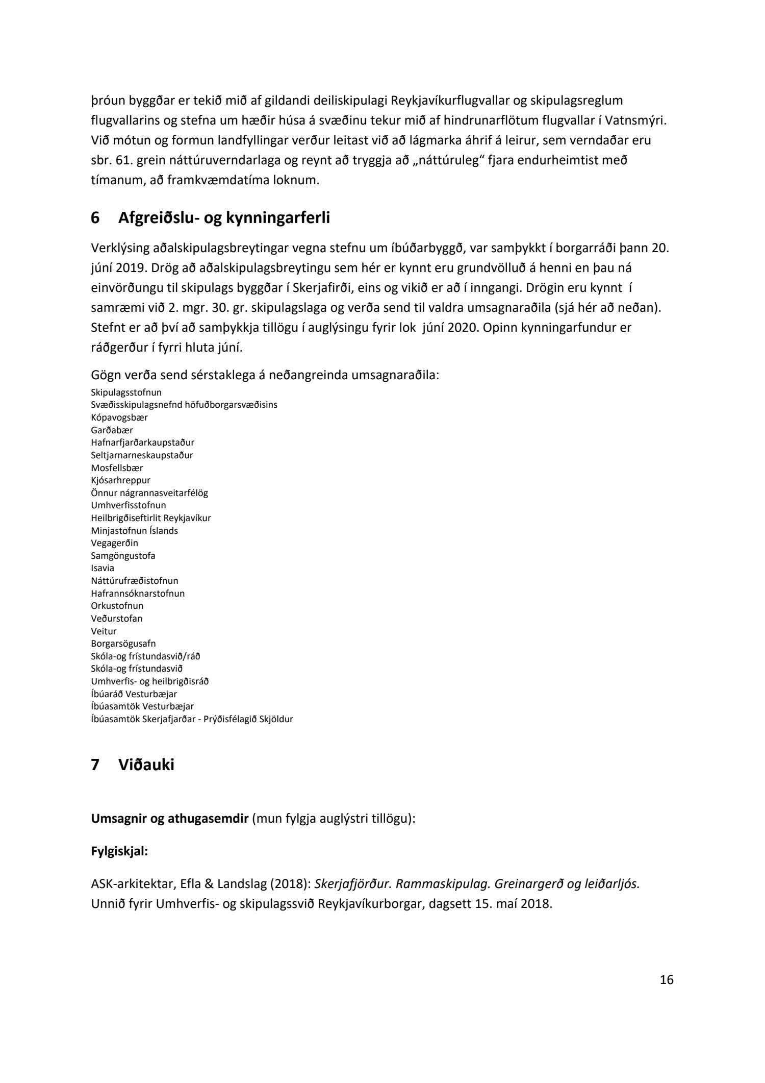 Samþykkt með fjórum greiddum atkvæðum fulltrúa Samfylkingarinnar, Viðreisnar og Pírata að kynna fyrirliggjandi drög að aðalskipulagsbreytingu, sbr. 2. mgr. 30. gr. skipulagslaga, ásamt umhverfisskýrslu sbr. 7. gr. laga nr. 105/2006. Fulltrúar Sjálfstæðisflokksins sitja hjá. Gögn verða send til skilgreindra hagsmunaaðila og kynnt á opnum fundi. Drögin verða auglýst í fjölmiðli og gerð aðgengileg á vef borgarinnar. Tillagan verður send til eftirfarandi umsagnaraðila: Svæðisskipulagsnefndar höfuðborgarsvæðisins, Kópavogs, Garðabæjar, Hafnarfjarðar, Seltjarnarnesbæjar, Mosfellsbæjar, Kjósarhrepps, annarra nágrannasveitarfélaga, Umhverfisstofnunar, Heilbrigðiseftirlits Reykjavíkur, Minjastofnunar Íslands, Vegagerðarinnar, Samgöngustofu, Isavia, Náttúrufræðistofnunar, Hafrannsóknarstofnunar, Orkustofnunar, Veðurstofu Íslands, Veitna, Borgarsögusafns, Skóla- og frístundaráðs, skóla- og frístundasviðs, Umhverfis- og heilbrigðisráðs, Íbúaráðs Vesturbæjar, Íbúasamtaka Vesturbæjar, Íbúasamtaka Skerjafjarðar og Prýðisfélagsins Skjaldar.