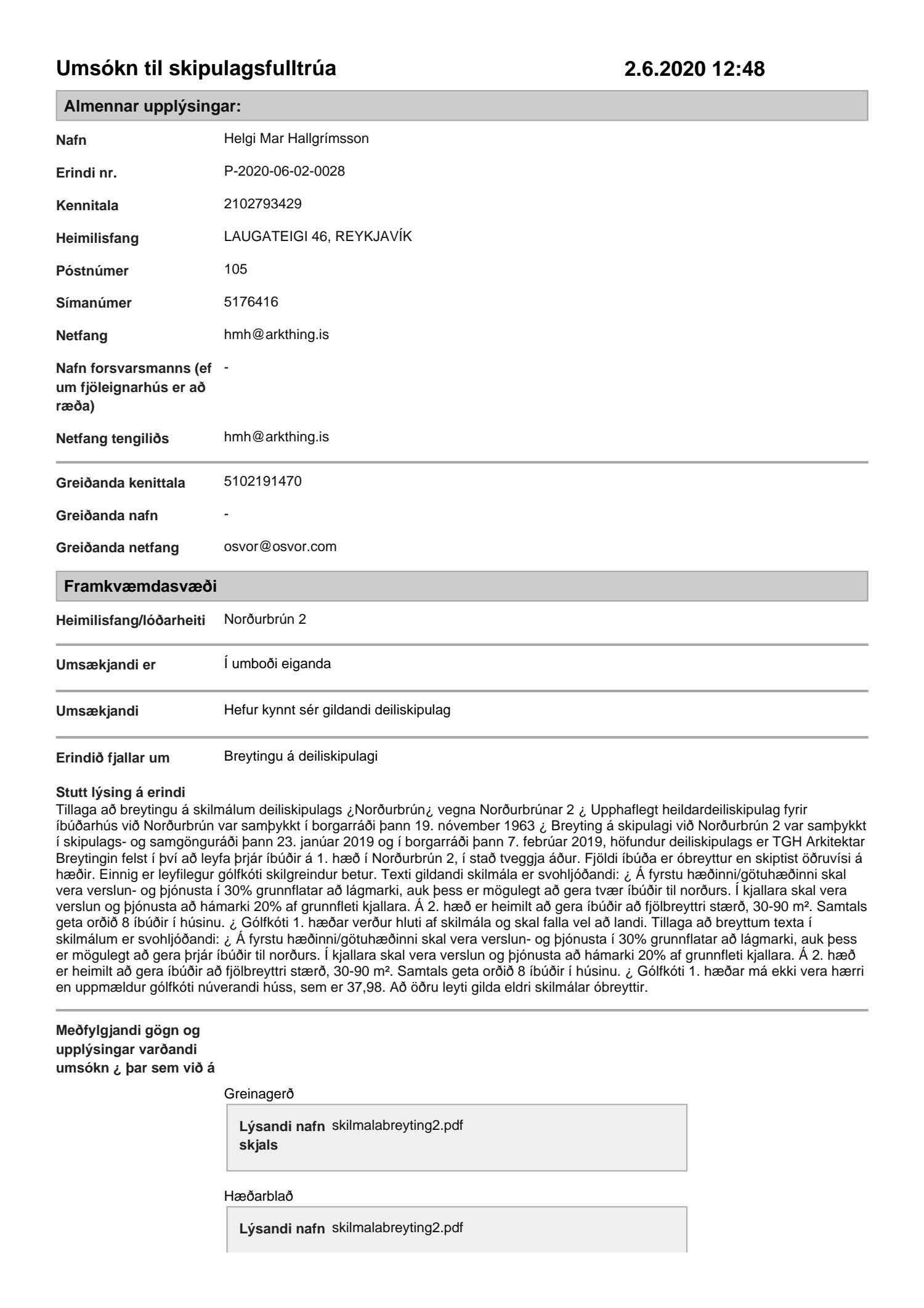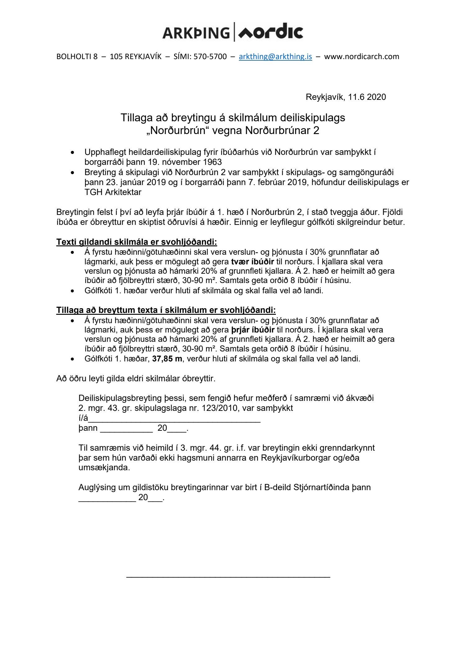 Lögð fram umsókn Helga Mars Hallgrímssonar dags. 2. júní 2020 varðandi breytingu á skilmálum deiliskipulagi  Norðurbrúnar vegna lóðarinnar nr. 2 við Norðurbrún. Í breytingunni felst að heimilt verði að gera þrjár íbúðir á 1. hæð í stað tveggja, fjöldi íbúða verður óbreyttur en skipt öðruvísi á hæðir ásamt því að leyfilegur gólfkvóti verður skilgreindur nánar, samkvæmt tillögu Arkþings - Nordic ehf. dags. í maí 2020, síðast breytt 11. júní 2020.
