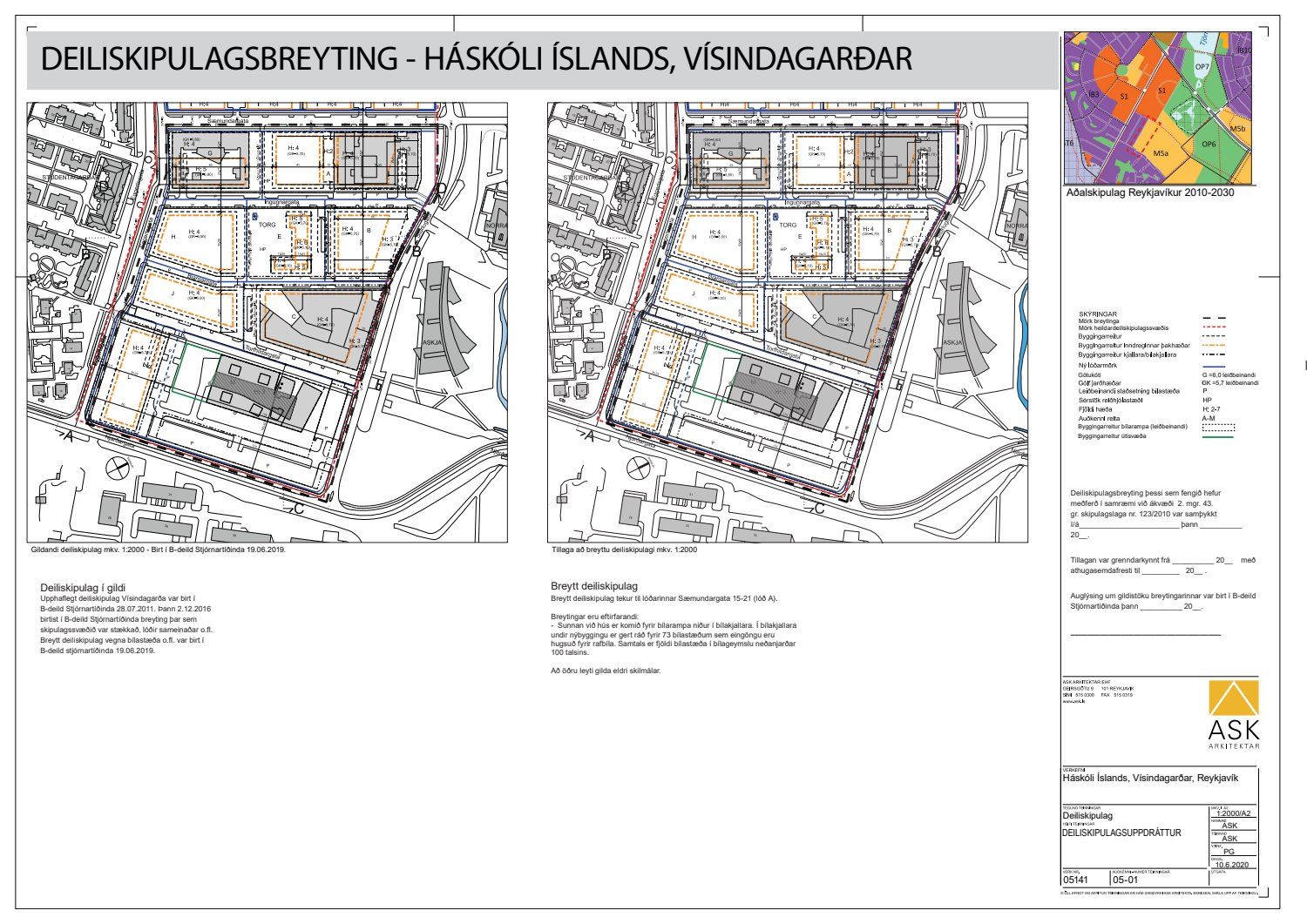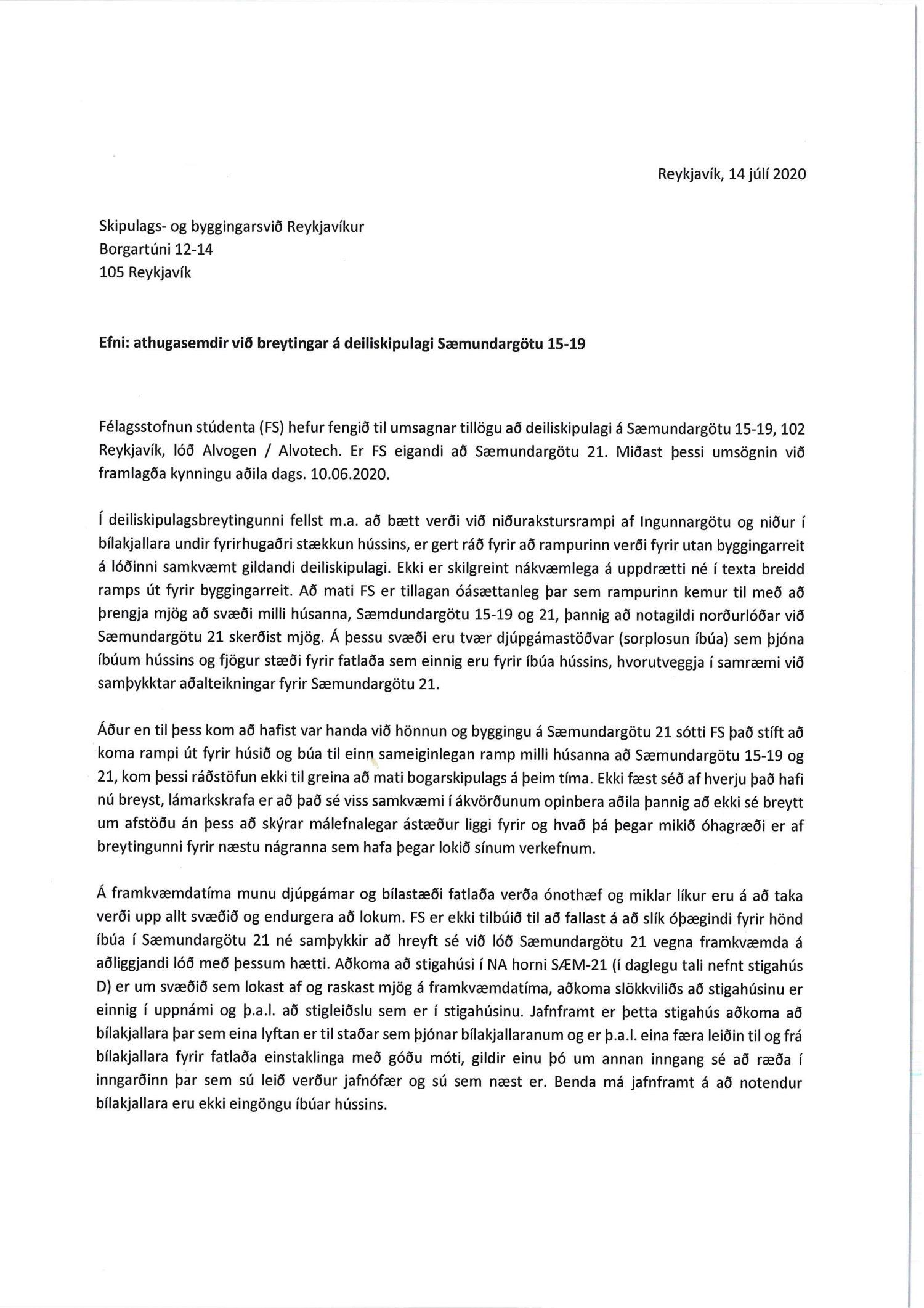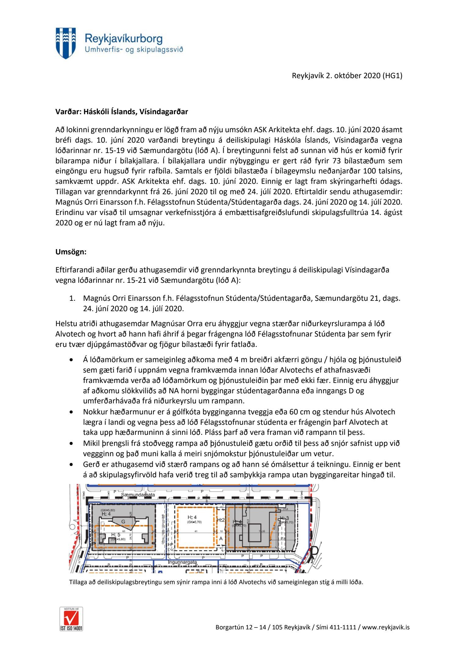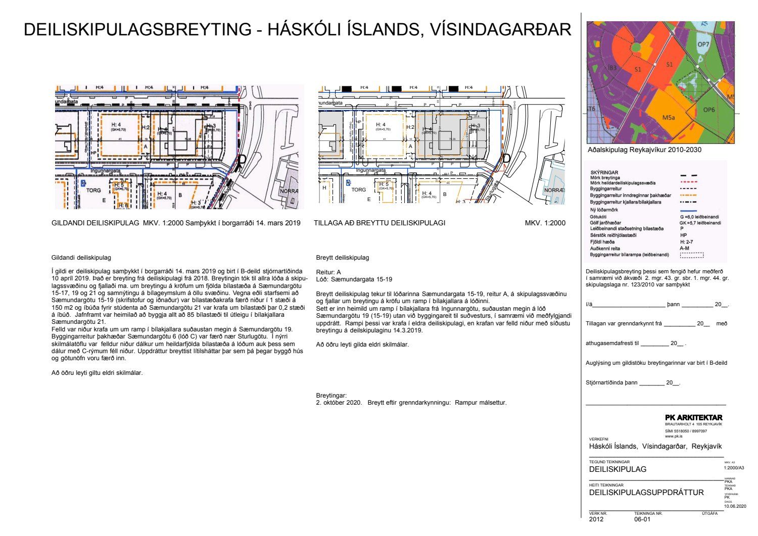 dags. 10. júní 2020, ásamt bréfi dags. 10. júní 2020 varðandi breytingu á deiliskipulagi Háskóla Íslands, Vísindagarða vegna lóðarinnar nr. 15-19 við Sæmundargötu (lóð A). Í breytingunni felst að sunnan við hús er komið fyrir bílarampa niður í bílakjallara. Í bílakjallara undir nýbyggingu er gert ráð fyrir 73 bílastæðum sem eingöngu eru hugsuð fyrir rafbíla. Samtals er fjöldi bílastæða í bílageymslu neðanjarðar 100 talsins, samkvæmt uppdr.