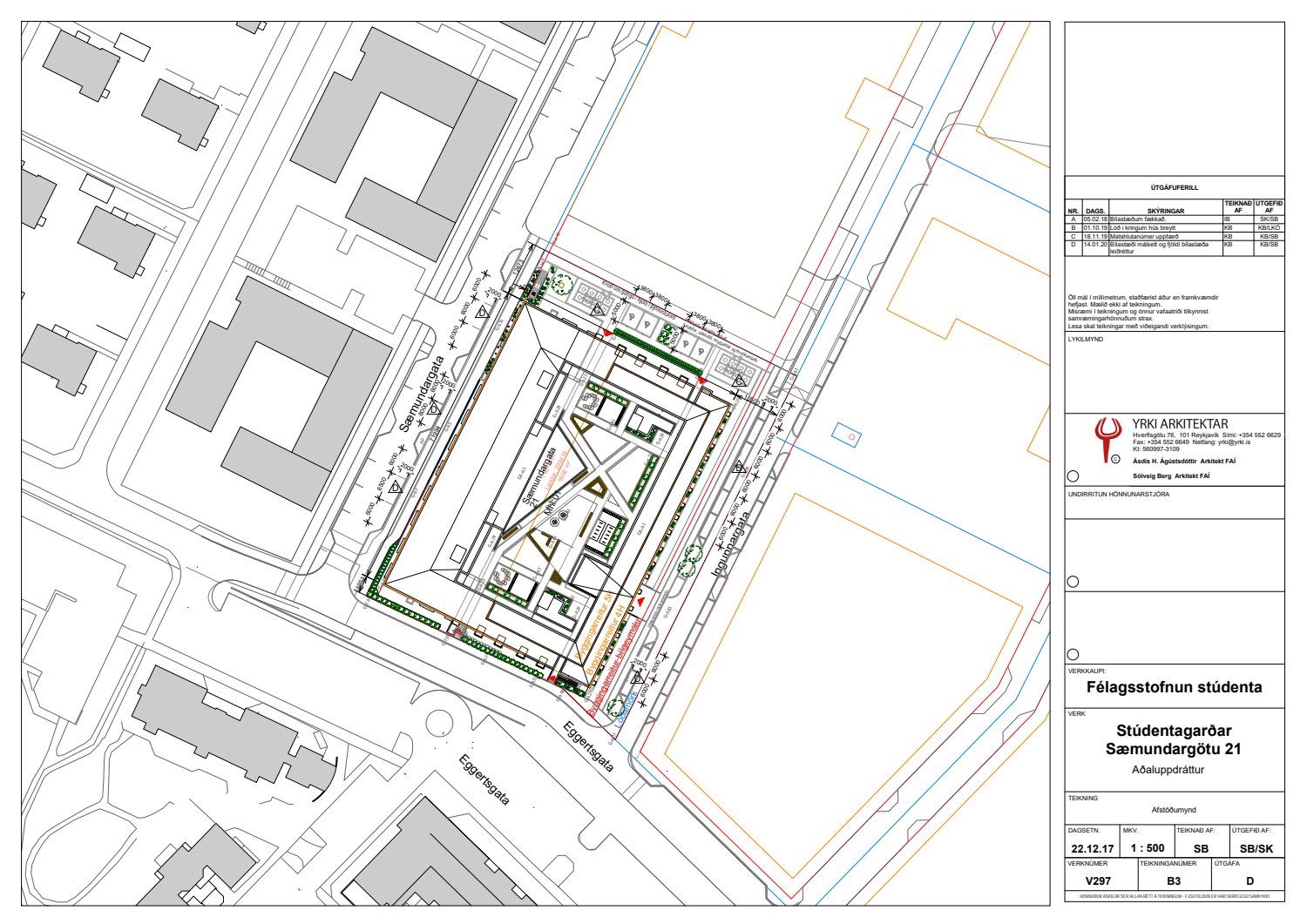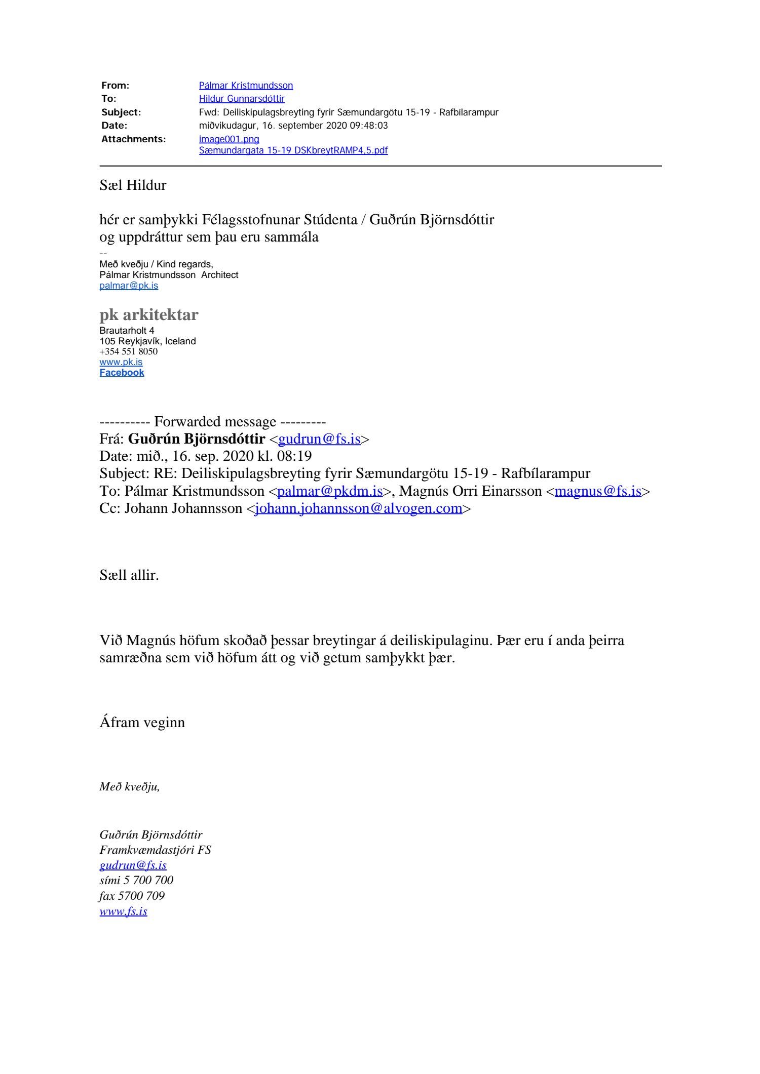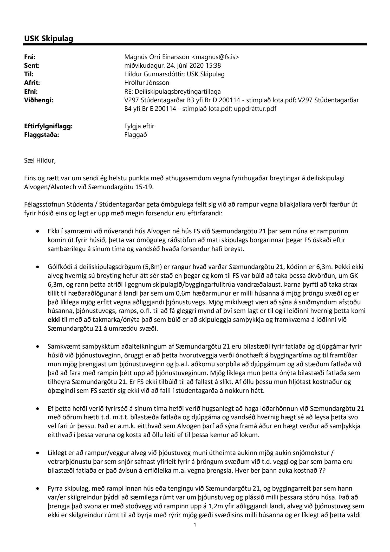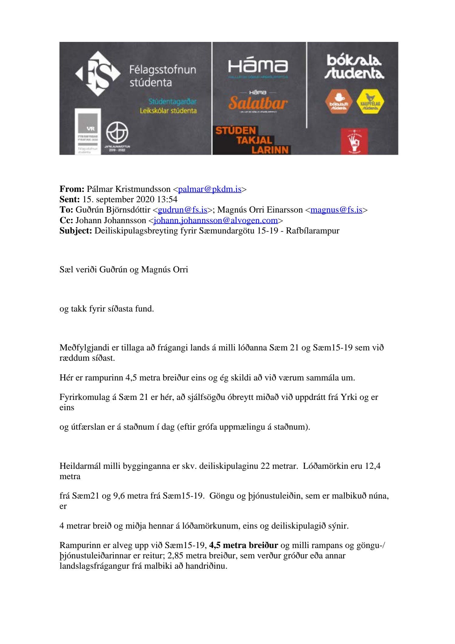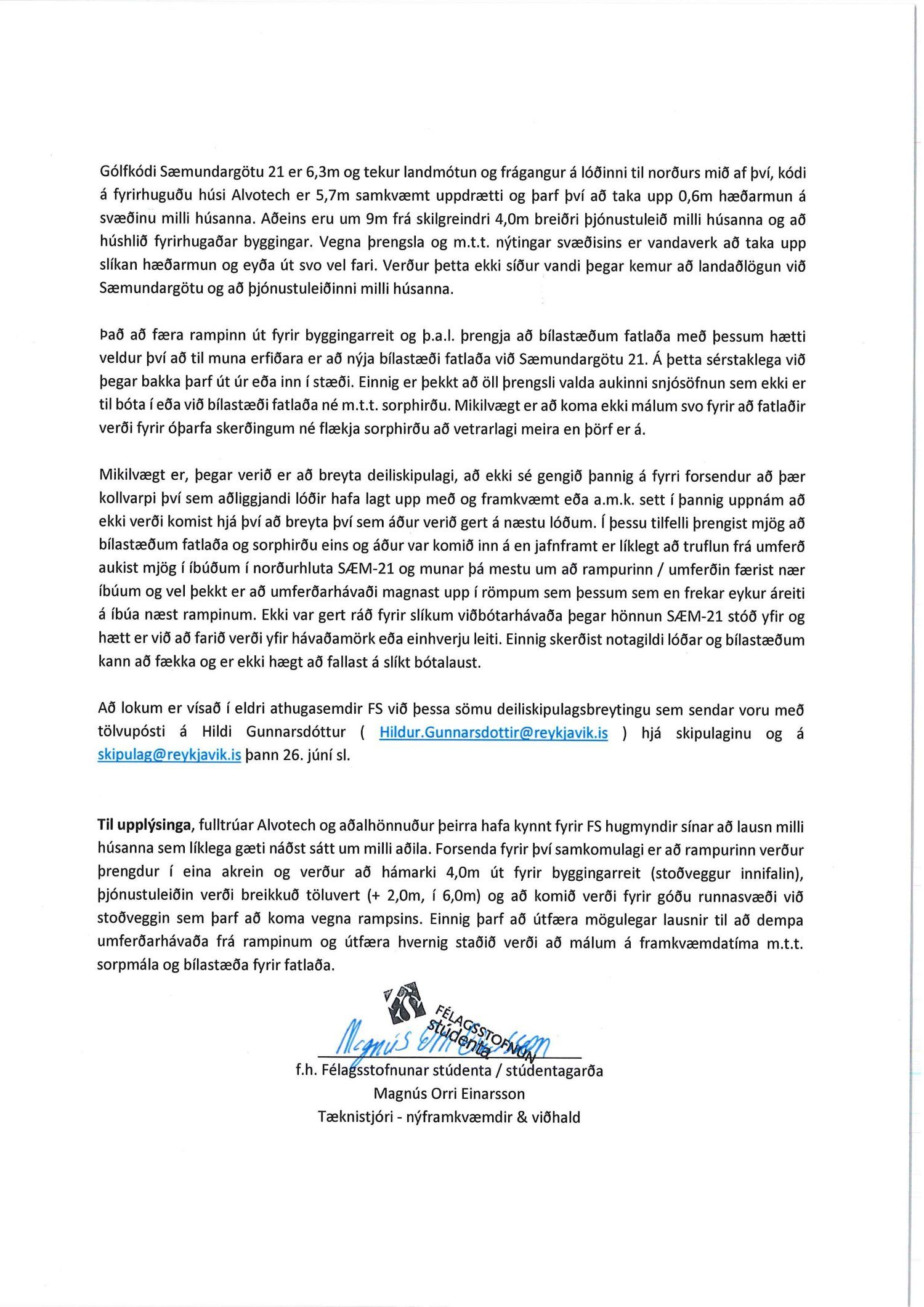 dags. 10. júní 2020, ásamt bréfi dags. 10. júní 2020 varðandi breytingu á deiliskipulagi Háskóla Íslands, Vísindagarða vegna lóðarinnar nr. 15-19 við Sæmundargötu (lóð A). Í breytingunni felst að sunnan við hús er komið fyrir bílarampa niður í bílakjallara. Í bílakjallara undir nýbyggingu er gert ráð fyrir 73 bílastæðum sem eingöngu eru hugsuð fyrir rafbíla. Samtals er fjöldi bílastæða í bílageymslu neðanjarðar 100 talsins, samkvæmt uppdr.