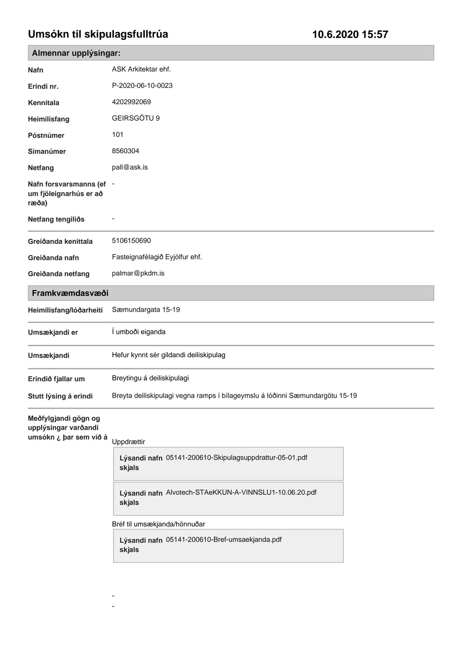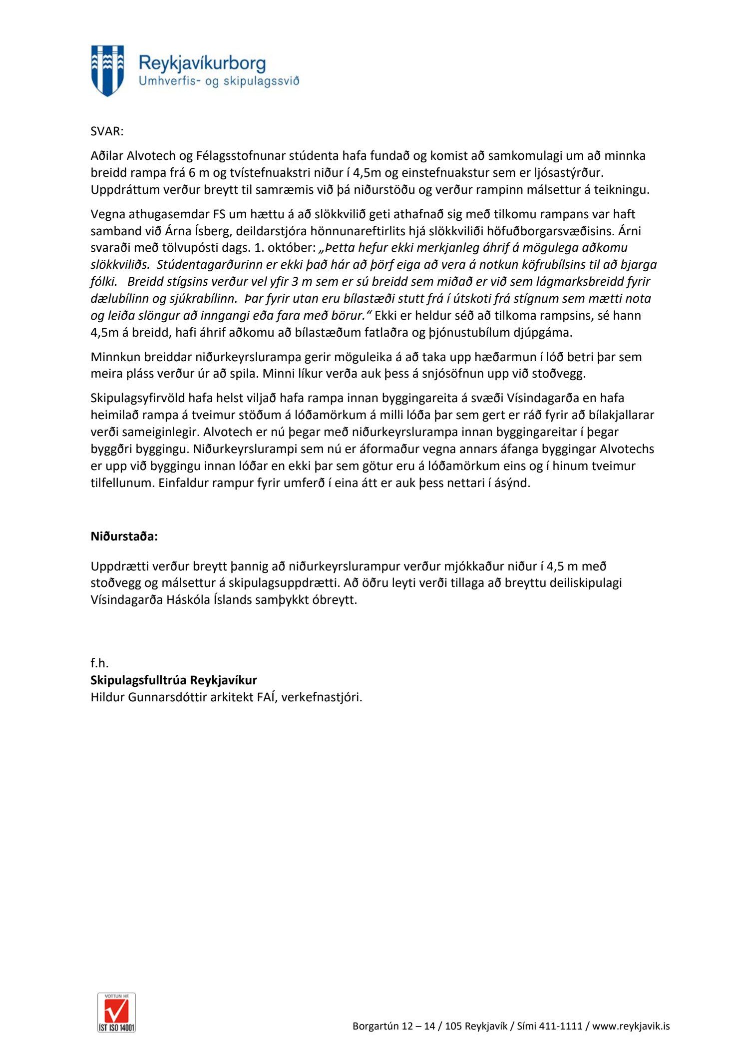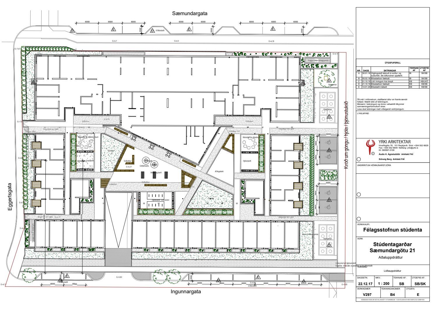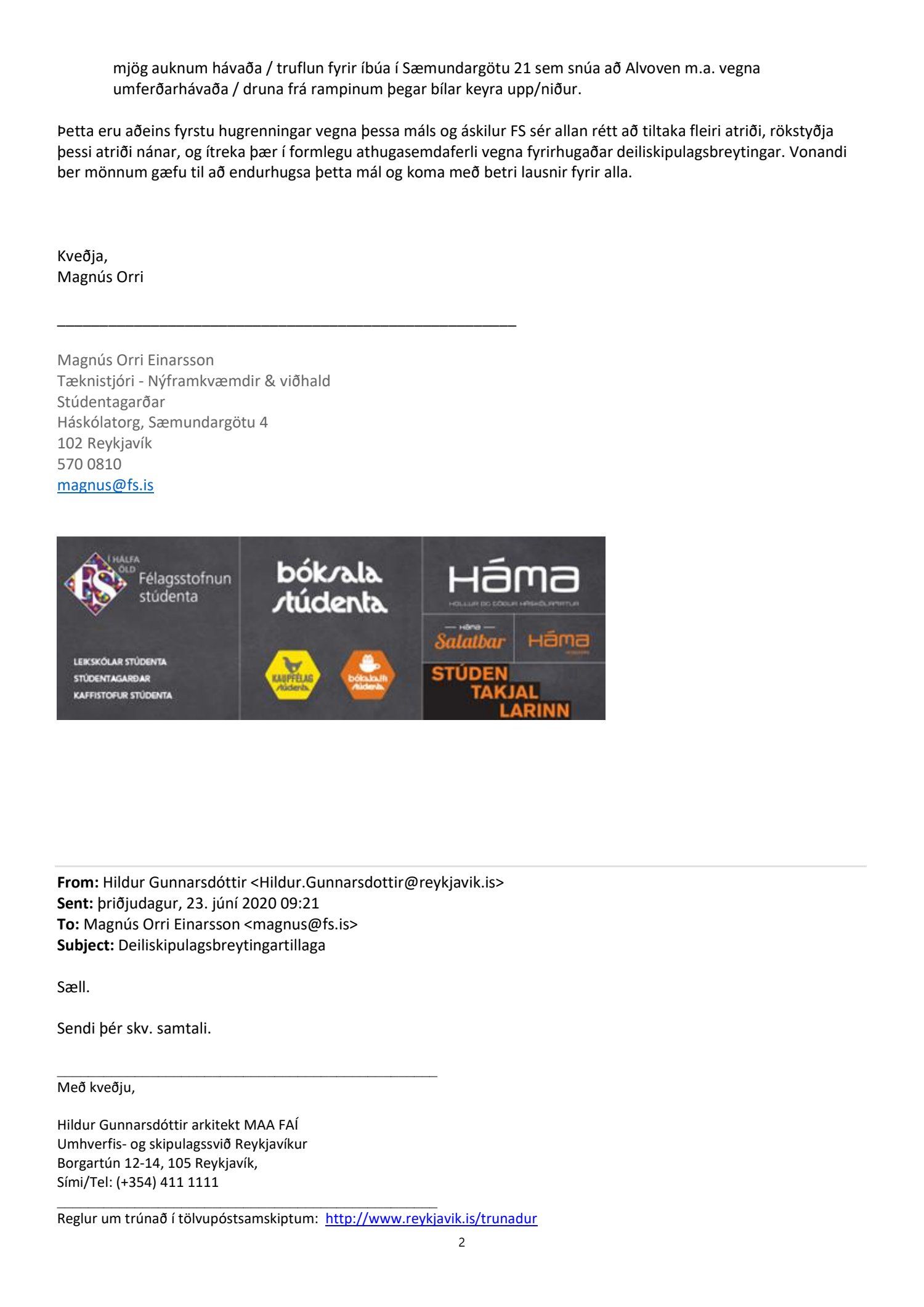 dags. 10. júní 2020, ásamt bréfi dags. 10. júní 2020 varðandi breytingu á deiliskipulagi Háskóla Íslands, Vísindagarða vegna lóðarinnar nr. 15-19 við Sæmundargötu (lóð A). Í breytingunni felst að sunnan við hús er komið fyrir bílarampa niður í bílakjallara. Í bílakjallara undir nýbyggingu er gert ráð fyrir 73 bílastæðum sem eingöngu eru hugsuð fyrir rafbíla. Samtals er fjöldi bílastæða í bílageymslu neðanjarðar 100 talsins, samkvæmt uppdr.