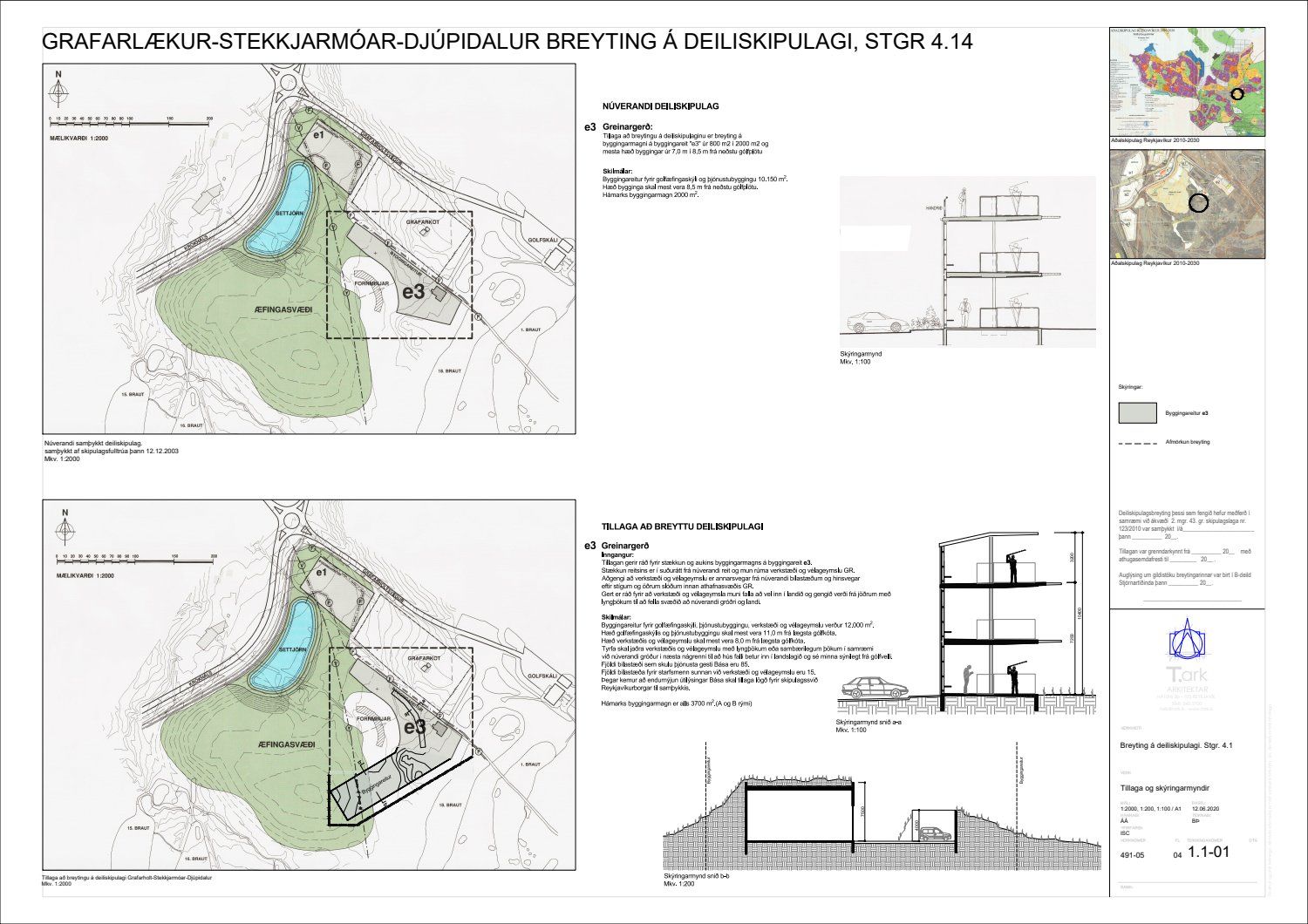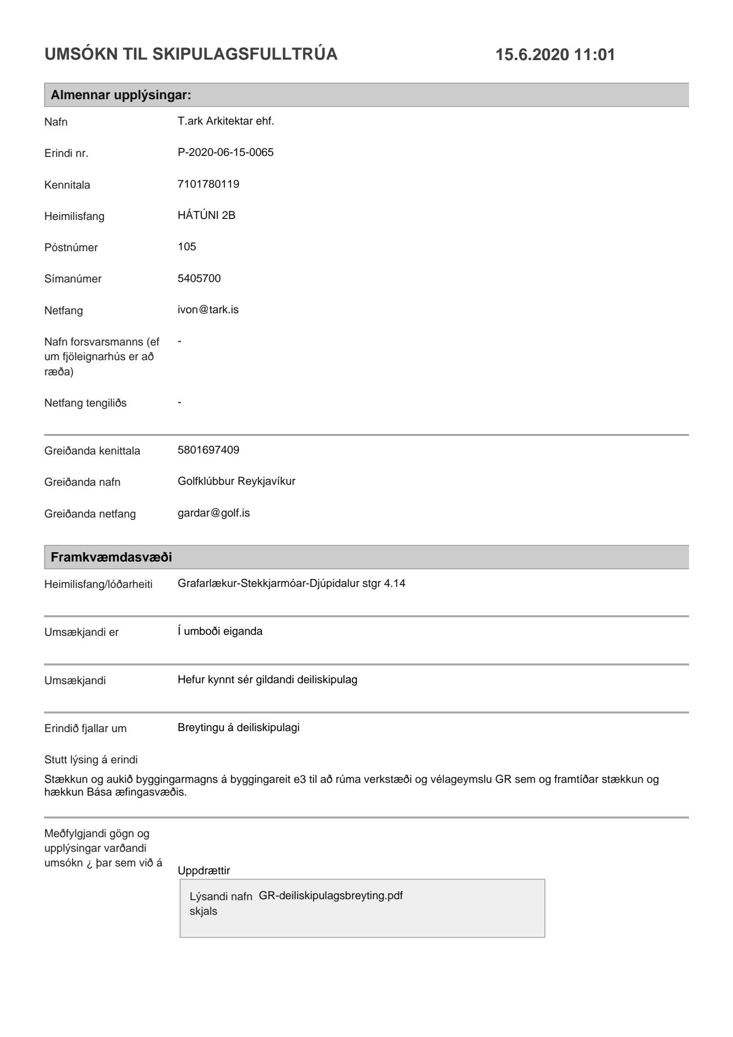 dags. 15. júní 2020 varðandi breytingu á deiliskipulagi Grafarlækjar-Stekkjarmóa-Djúpadals. Í breytingunni felst stækkun á byggingarreit e3 í suðurátt til að rúma verkstæði og vélageymslu ásamt aukningu á byggingarmagni, samkvæmt uppdr. T.ark