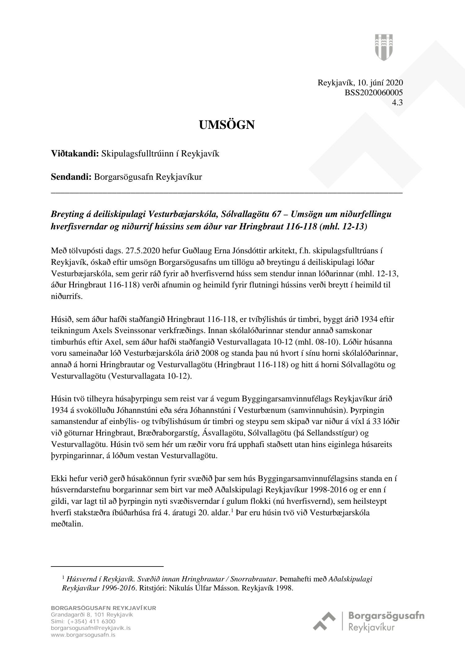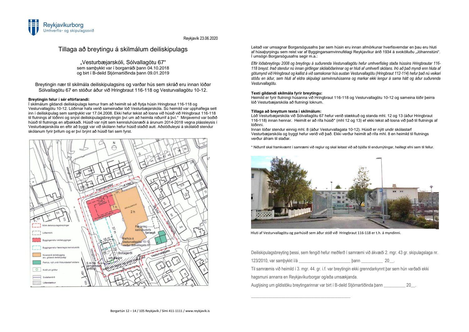 Lögð fram tillaga umhverfis- og skipulagssviðs dags. 23. júní 2020 að breytingu á skilmálum deiliskipulags lóðarinnar nr. 67 við Sólvallagötu 67, Vesturbæjarskóli. Í breytingunni felst að í stað flutningsheimildar á húsinu, sem stendur í suðvesturhorni lóðarinnar (áður Hringbraut 116-118), er heimilt að rífa það. Einnig er lögð fram umsögn Borgarsögusafns Reykjavíkur dags. 10. júní 2020.