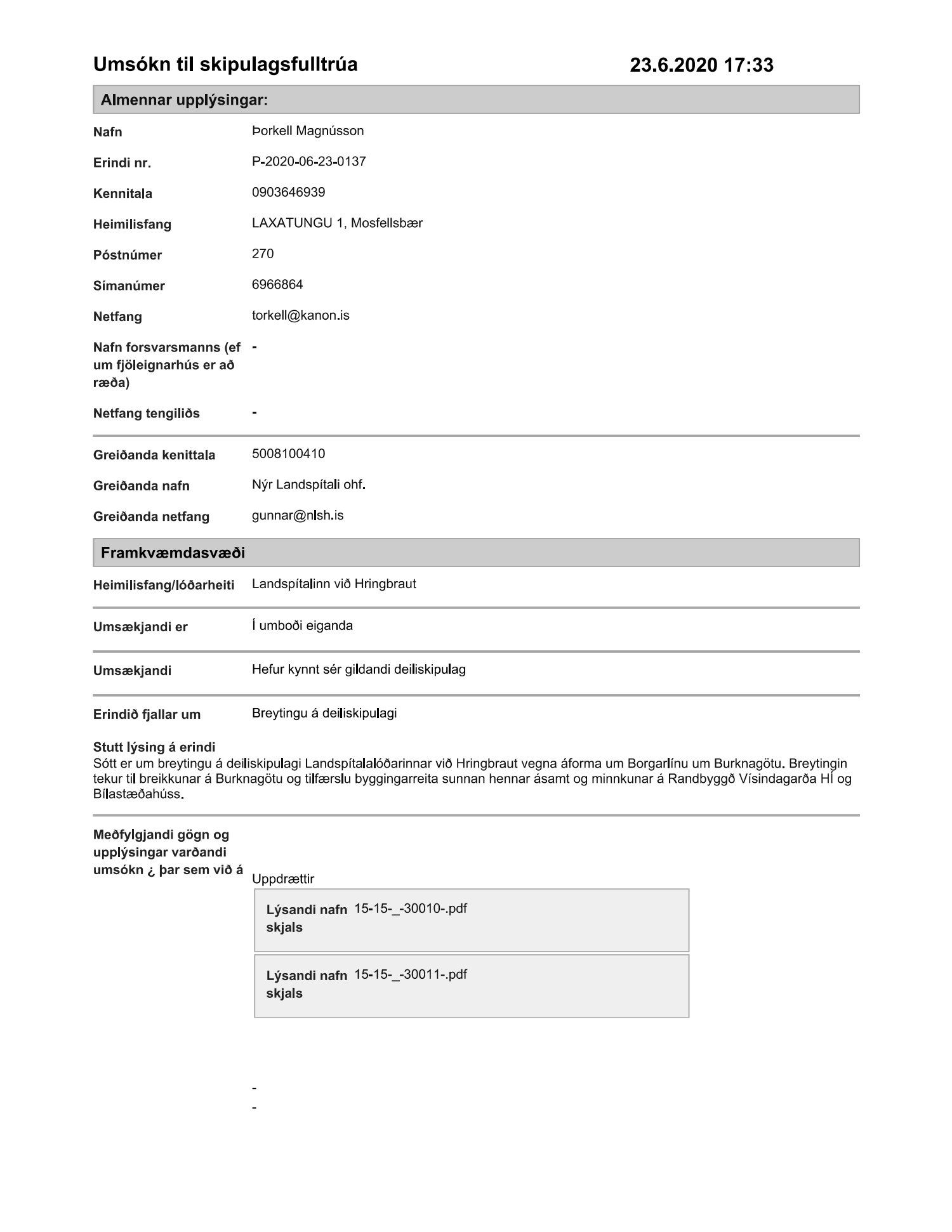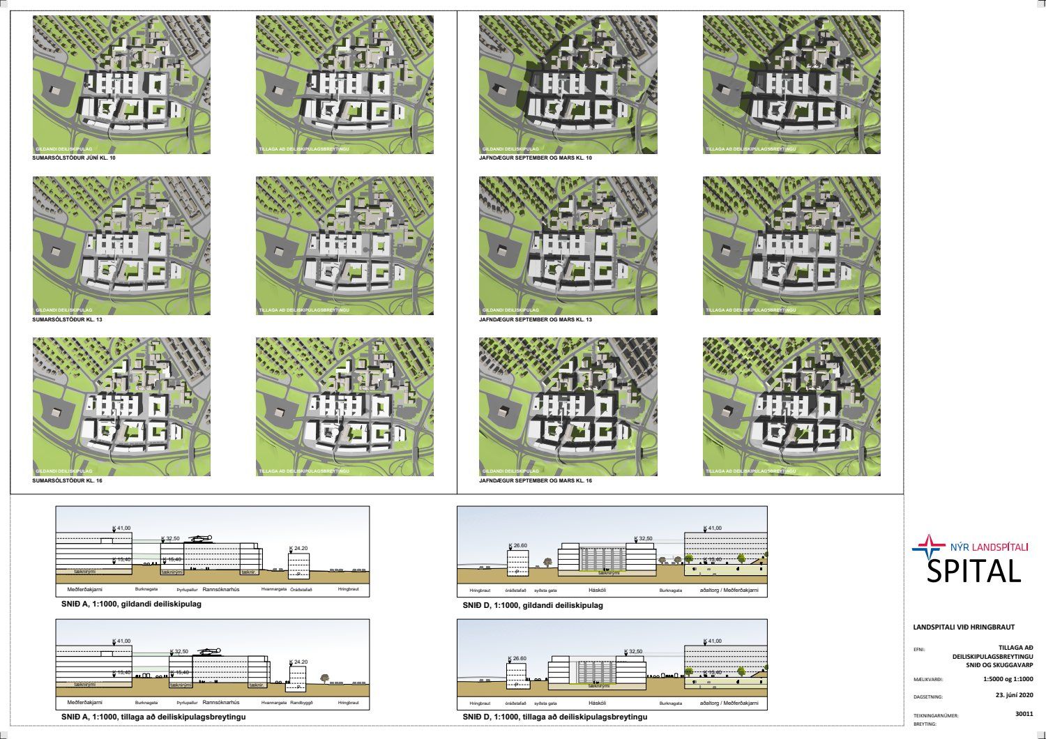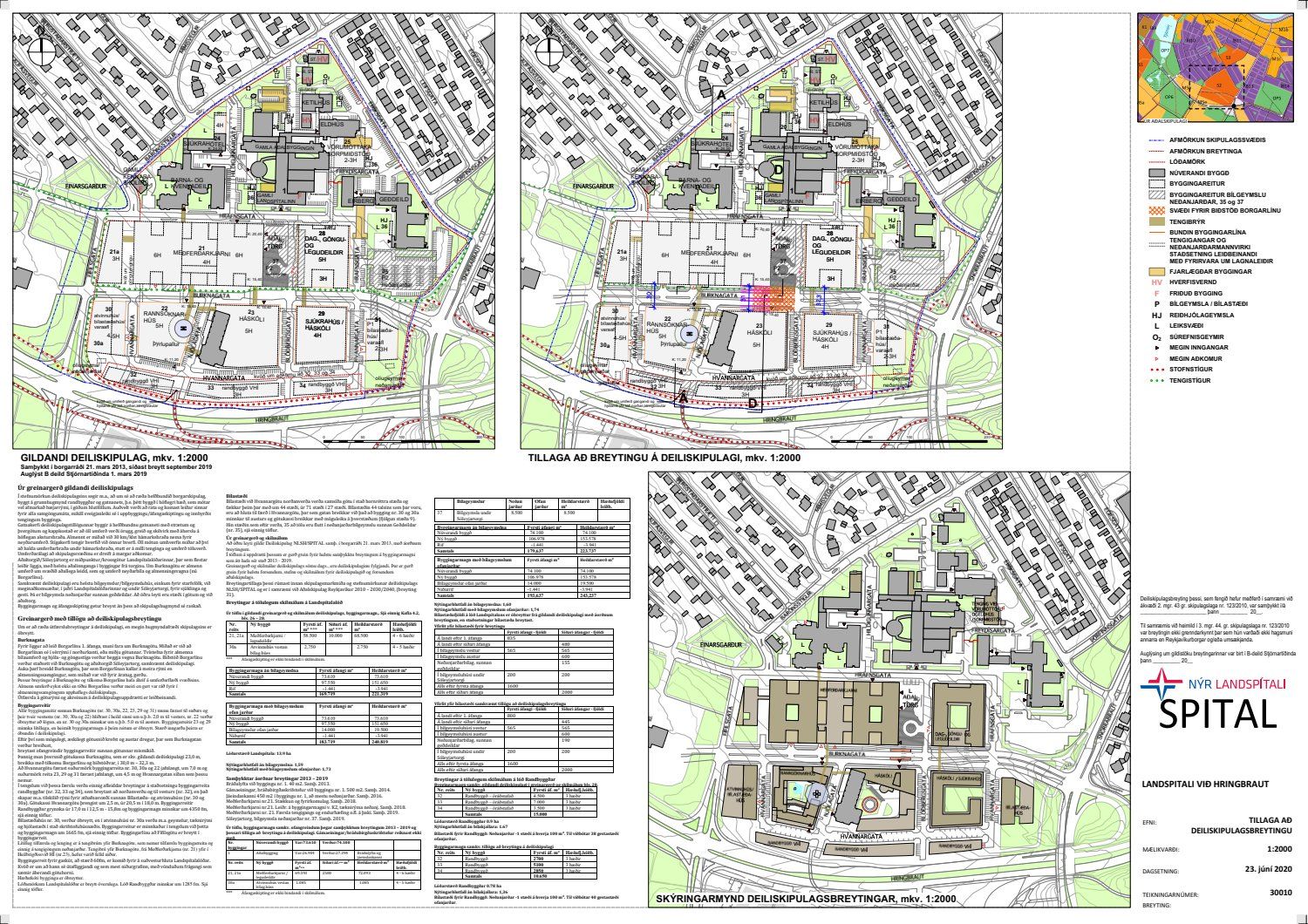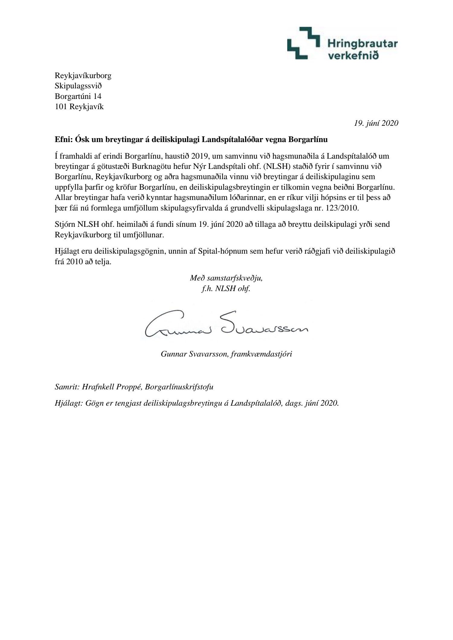 , dags. 23. júní 2020, varðandi breytingu á deiliskipulagi Nýs Landspítala við Hringbraut. Í breytingunni felst breikkun á Burknagötu vegna tilkomu borgarlínu og færslu og breytingar á byggingarreitum sunnan götunnar sem nemur breikkuninni. Í tengslum við þessa færslu verða einnig afleiddar breytingar á staðsetningu byggingarreita randbyggðar, samkvæmt deiliskipulags- og skýringaruppdr. Spital ehf., dags. 23. júní 2020. Einnig er lagt fram bréf Gunnars Svavarssonar f.h. NLSH ohf.dags. 19. júní 2020.