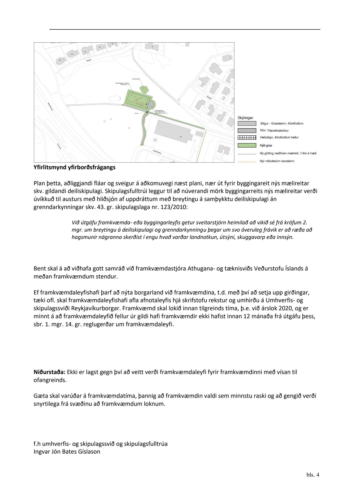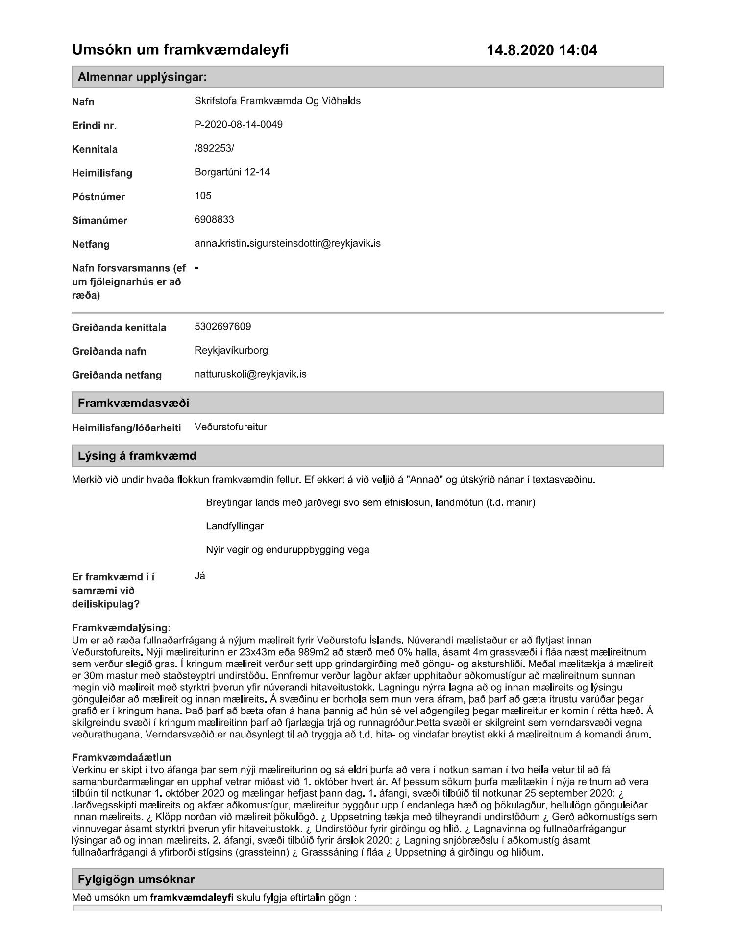 Samþykkt að gefa út framkvæmdaleyfi með vísan til umsagnar skipulagsfulltrúa dags. 21. ágúst 2020, 3. mgr. 43. gr. og 2. ml. 3. mgr. 44. gr. skipulagslaga nr. 123/2010. Vísað til skrifstofu sviðsstjóra til útgáfu framkvæmdaleyfis. Vakin er athygli á að greiða þarf fyrir útgáfu framkvæmdaleyfis skv. gr. 5.2 í gjaldskrá skipulagsfulltrúa nr. 1231/2018.