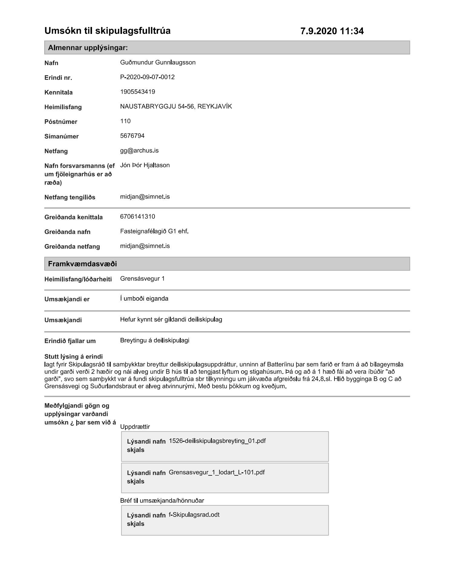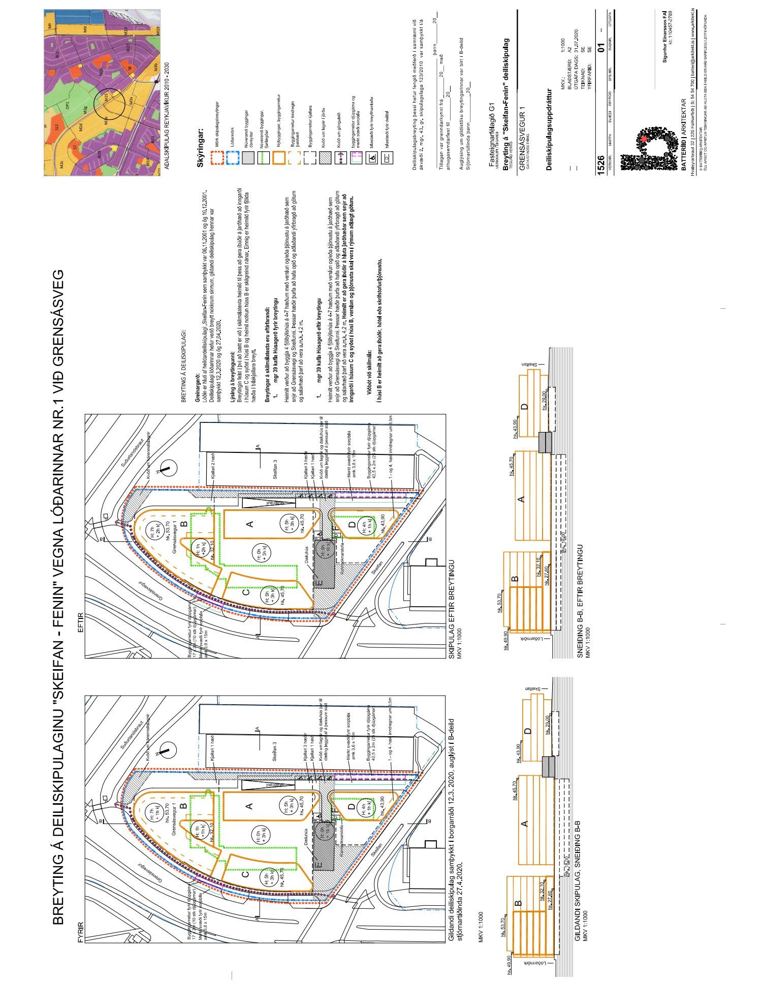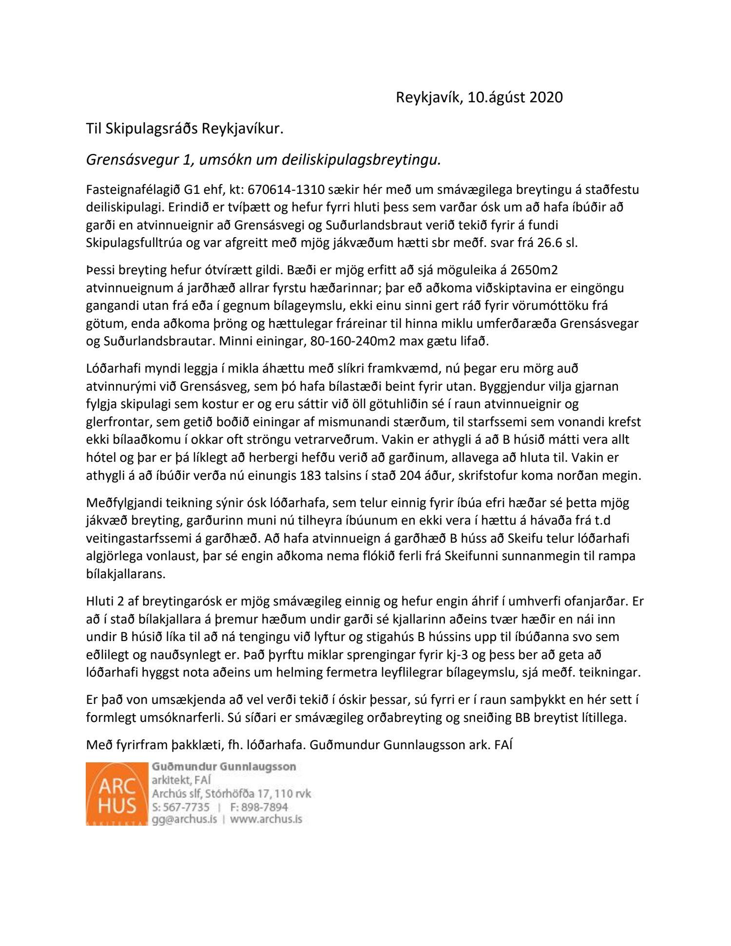 Lögð fram umsókn Guðmundar Gunnlaugssonar dags. 7. september 2020 ásamt bréfi dags. 10. ágúst 2020 varðandi breytingu á deiliskipulagi "Skeifan-Fenin" vegna lóðarinnar nr. 1 við Grensásveg. Í breytingunni felst að bætt er við skilmálatexta heimild til þess að gera íbúðir á jarðhæð að inngarði í húsum C og syðst í húsi B og heimil notkun B er skilgreind nánar. Einnig er heimild fyrir fjölda hæða í bílakjallara breytt, samkvæmt uppdr. Batterísins arkitekta dags. 31. júlí 2020.