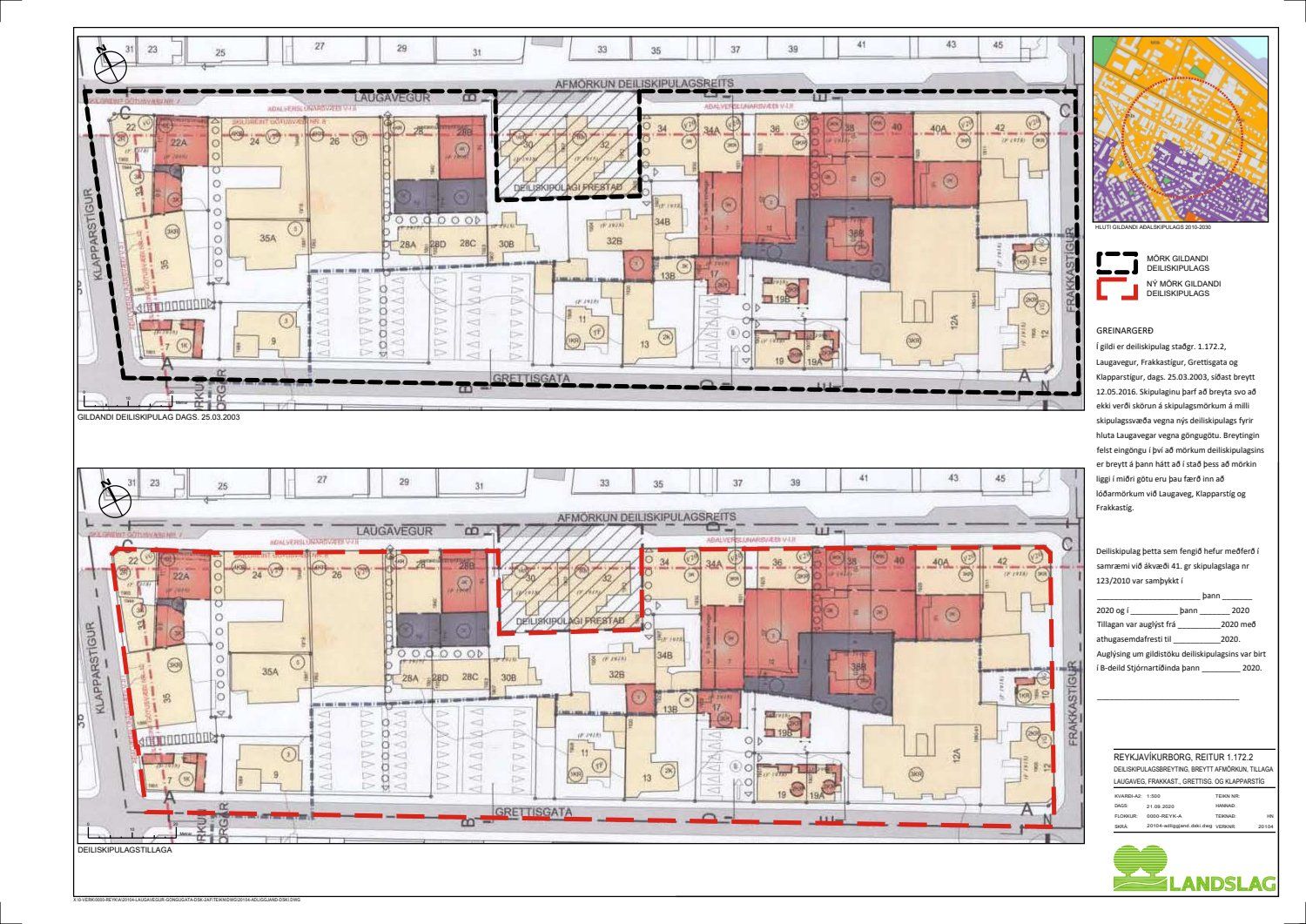 Lögð fram tillaga umhverfis- og skipulagssviðs að breytingu á deiliskipulagi reits 1.172.2 sem afmarkast af Laugavegi, Frakkastíg, Grettisgötu og Klapparstíg. Í breytingunni felst að mörkum deiliskipulagsins er breytt á þann hátt að í stað þess að mörkin liggi í miðri götu eru þau færð inn að lóðarmörkum við Laugaveg, Klapparstíg og Frakkastíg, samkvæmt uppdr.