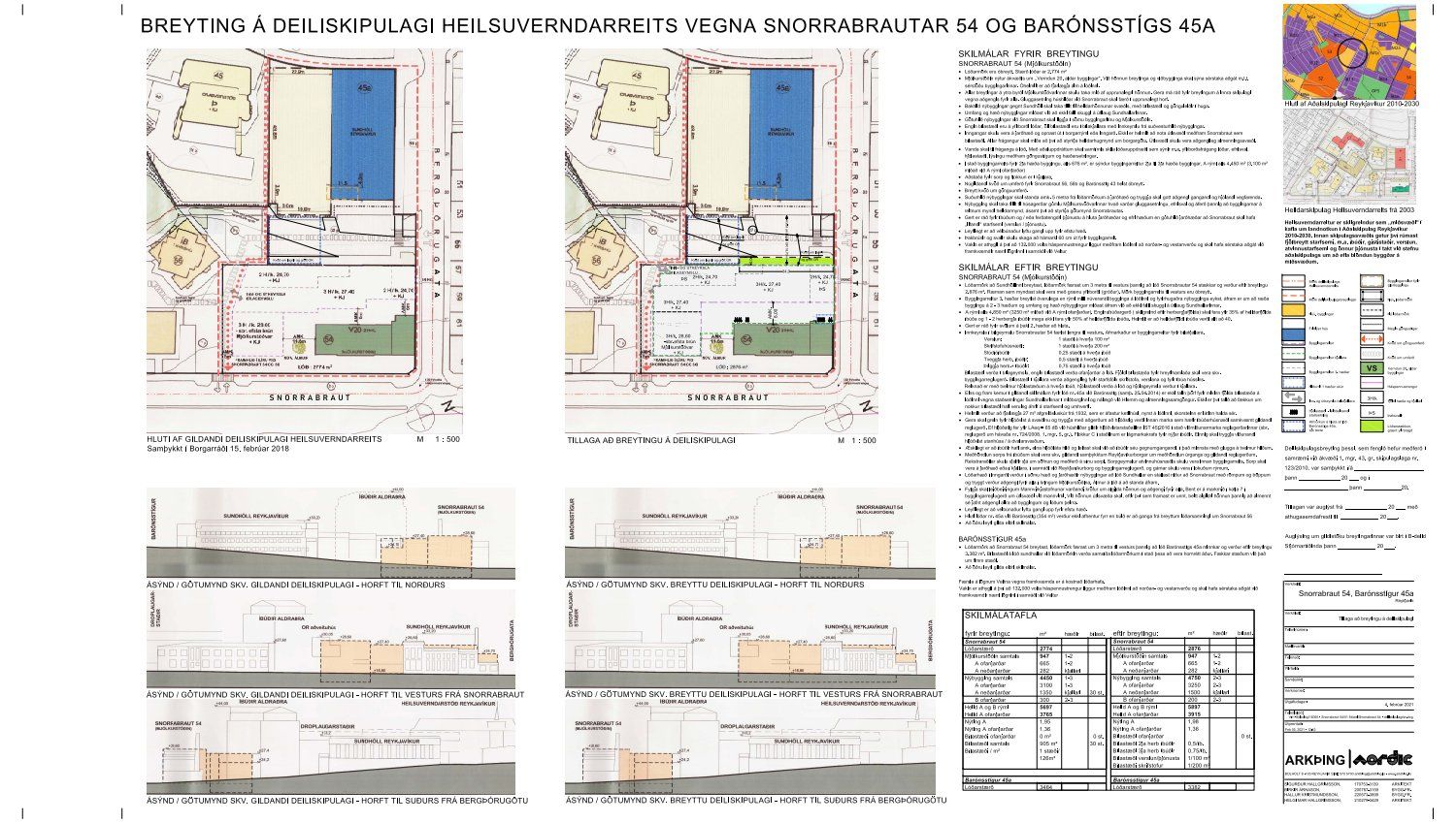 Lögð fram umsókn Sigurðar Hallgrímssonar dags. 22. september 2020 varðandi breytingu á deiliskipulagi Heilsuverndarreits vegna lóðarinnar nr. 54 við Snorrabraut. Í breytingunni felst að lóð nr. 54 við Snorrabraut er stækkuð um 102 m2 og lóð nr. 45A við Barónsstíg (Sundhöll Reykjavíkur) er minnkuð samsvarandi. Fyrirkomulag bílastæða á lóð Sundhallar breytist og bílastæðum fækkar lítillega. Einnig er gerð minni háttar breyting á byggingarreit Snorrabrautar 54 og byggingarmagn aukið um 400 m2 (aðallega neðanjarðar), samkvæmt deiliskipulags- og skýringaruppdr. Arkþing/Nordic ehf. dags. 4. febrúar 2021.