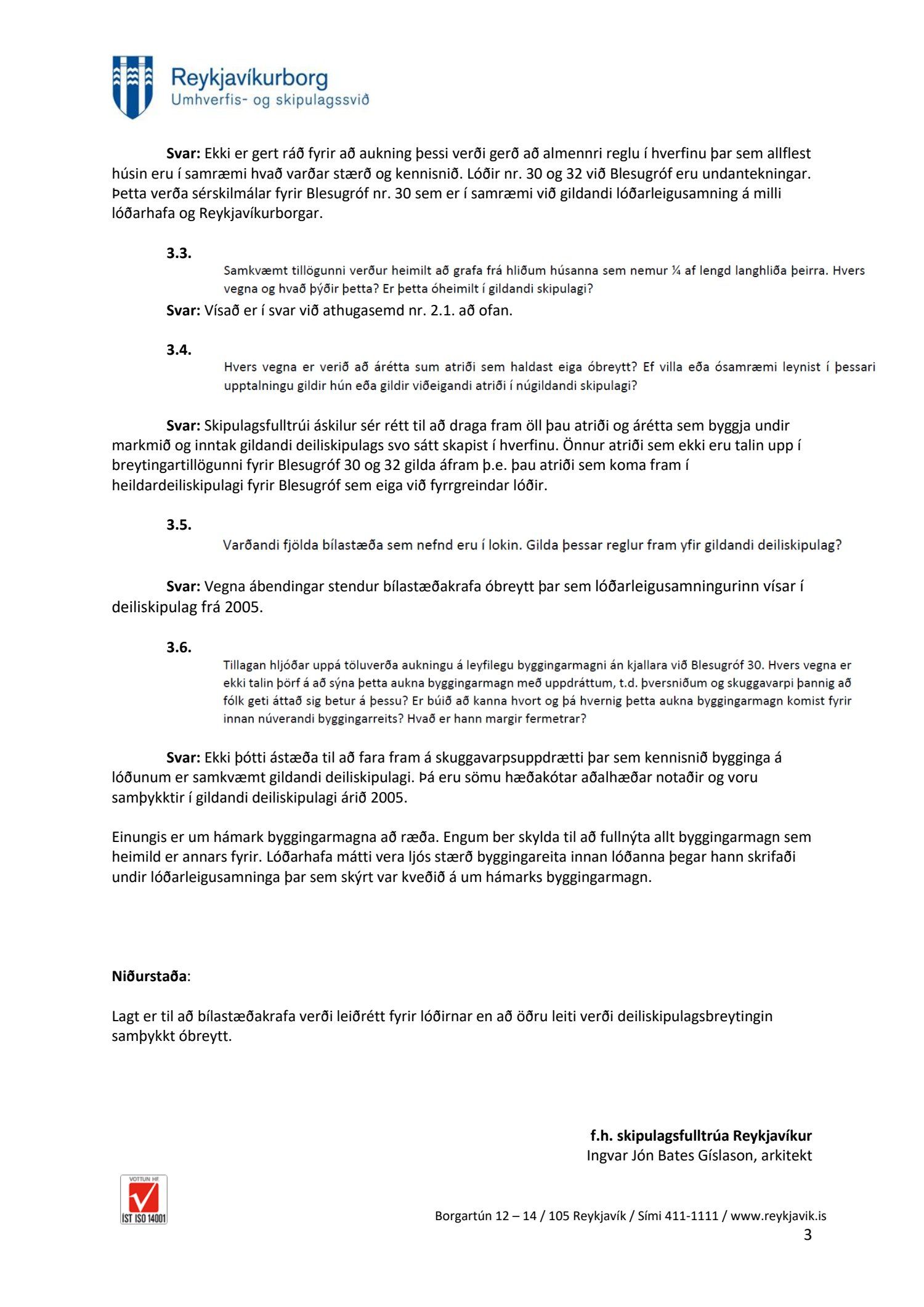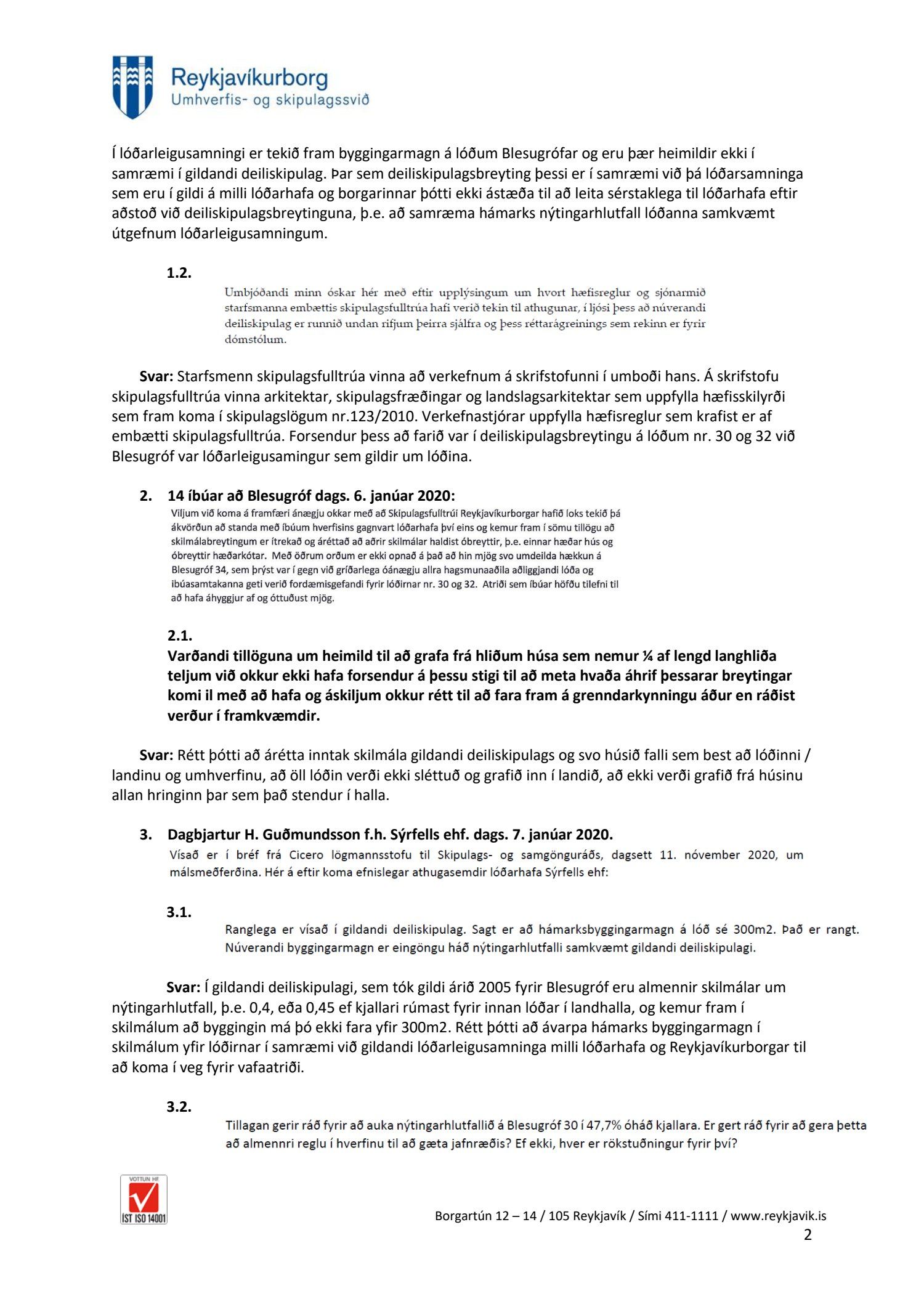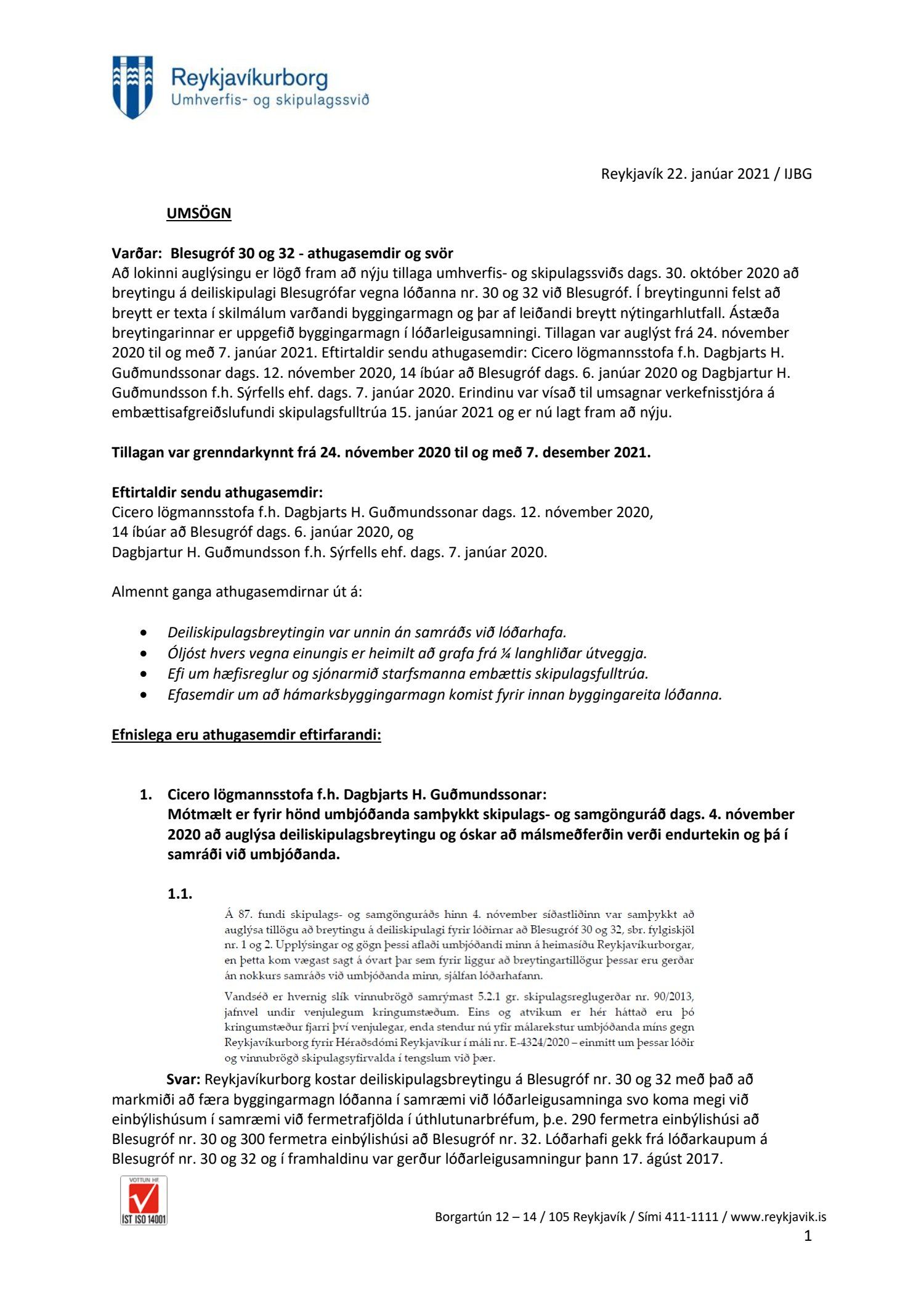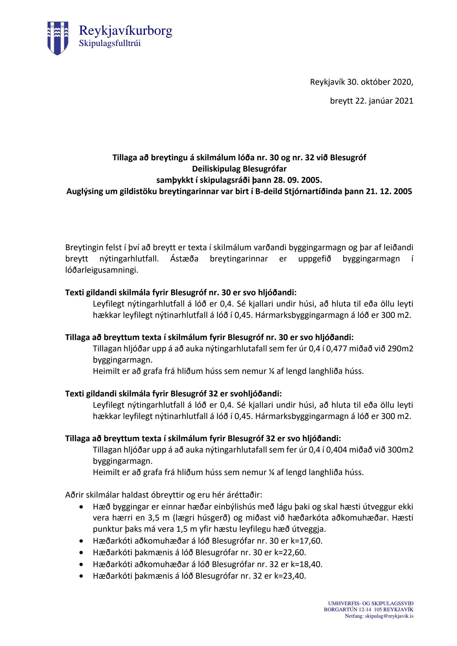 Að lokinni auglýsingu er lögð fram að nýju tillaga umhverfis- og skipulagssviðs dags. 30. október 2020, br. 22. janúar 2020, að breytingu á deiliskipulagi Blesugrófar vegna lóðanna nr. 30 og 32 við Blesugróf. Í breytingunni felst að breytt er texta í skilmálum varðandi byggingarmagn og þar af leiðandi breytt nýtingarhlutfall. Ástæða breytingarinnar er uppgefið byggingarmagn í lóðarleigusamningi. Tillagan var auglýst frá 24. nóvember 2020 til og með 7. janúar 2021. Eftirtaldir sendu athugasemdir: Cicero lögmannsstofa f.h. Dagbjarts H. Guðmundssonar dags. 12. nóvember 2020, 14 íbúar að Blesugróf dags. 6. janúar 2020 og Dagbjartur H. Guðmundsson f.h.