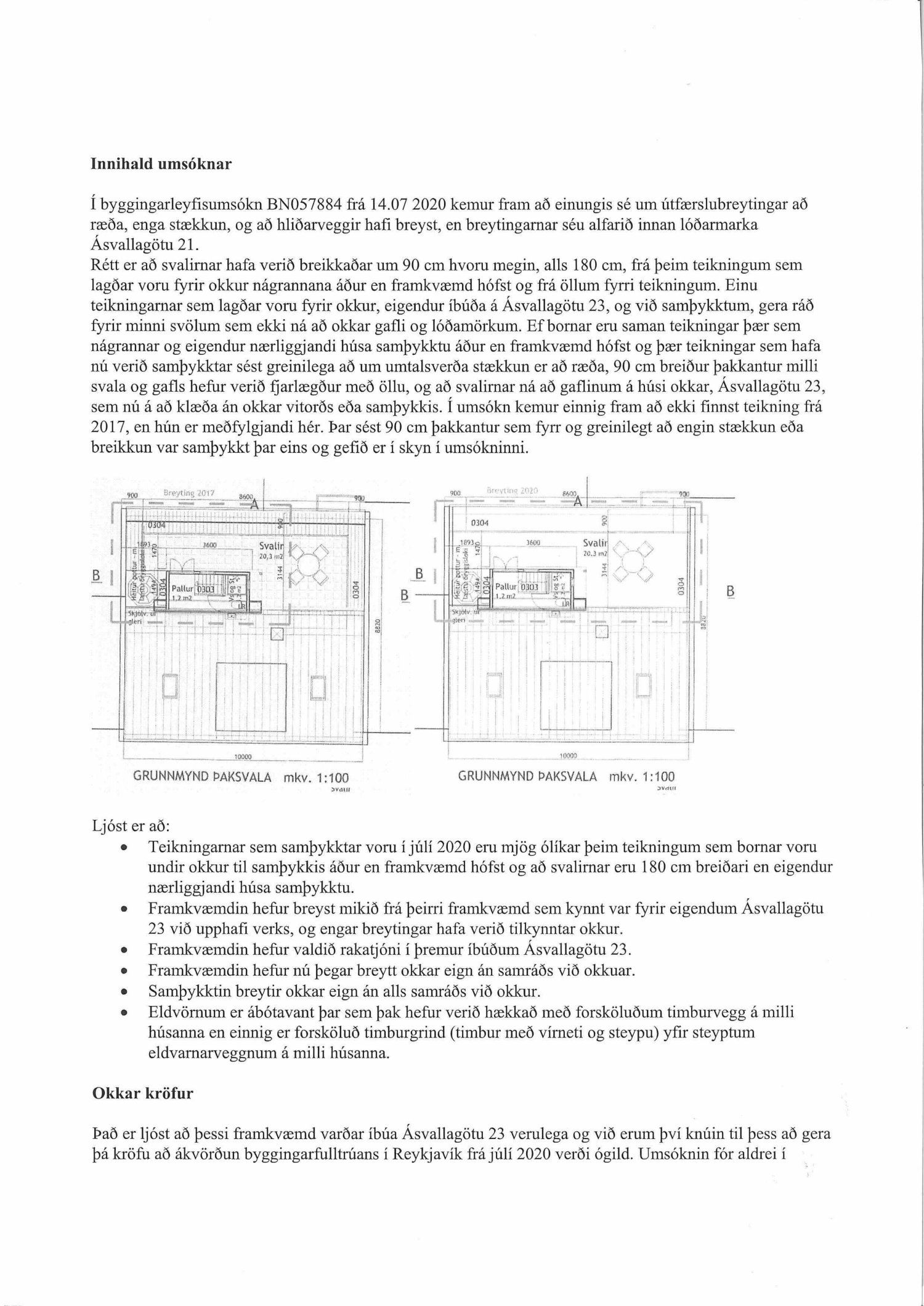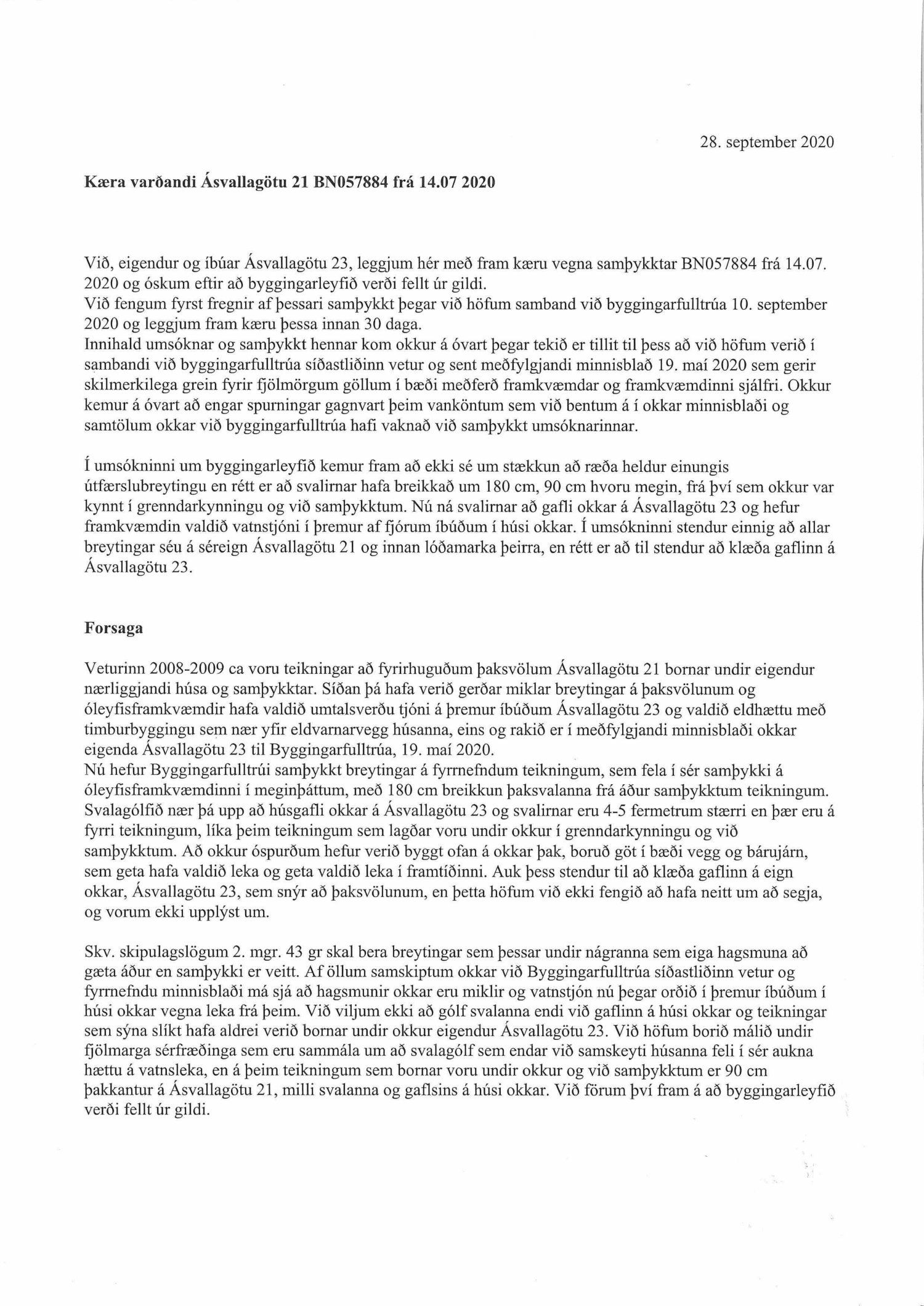 Lagt fram erindi úrskurðarnefndar umhverfis- og auðlindamála dags. 1. október 2020 ásamt kæru dags. 28. september 2020 þar sem kærð er samþykkt byggingarfulltrúa frá 14. júlí 2020 sem felst í því að gaflar eru klæddir á húsi á lóð nr. 21 við Ásvallagötu ásamt stækkun svala.