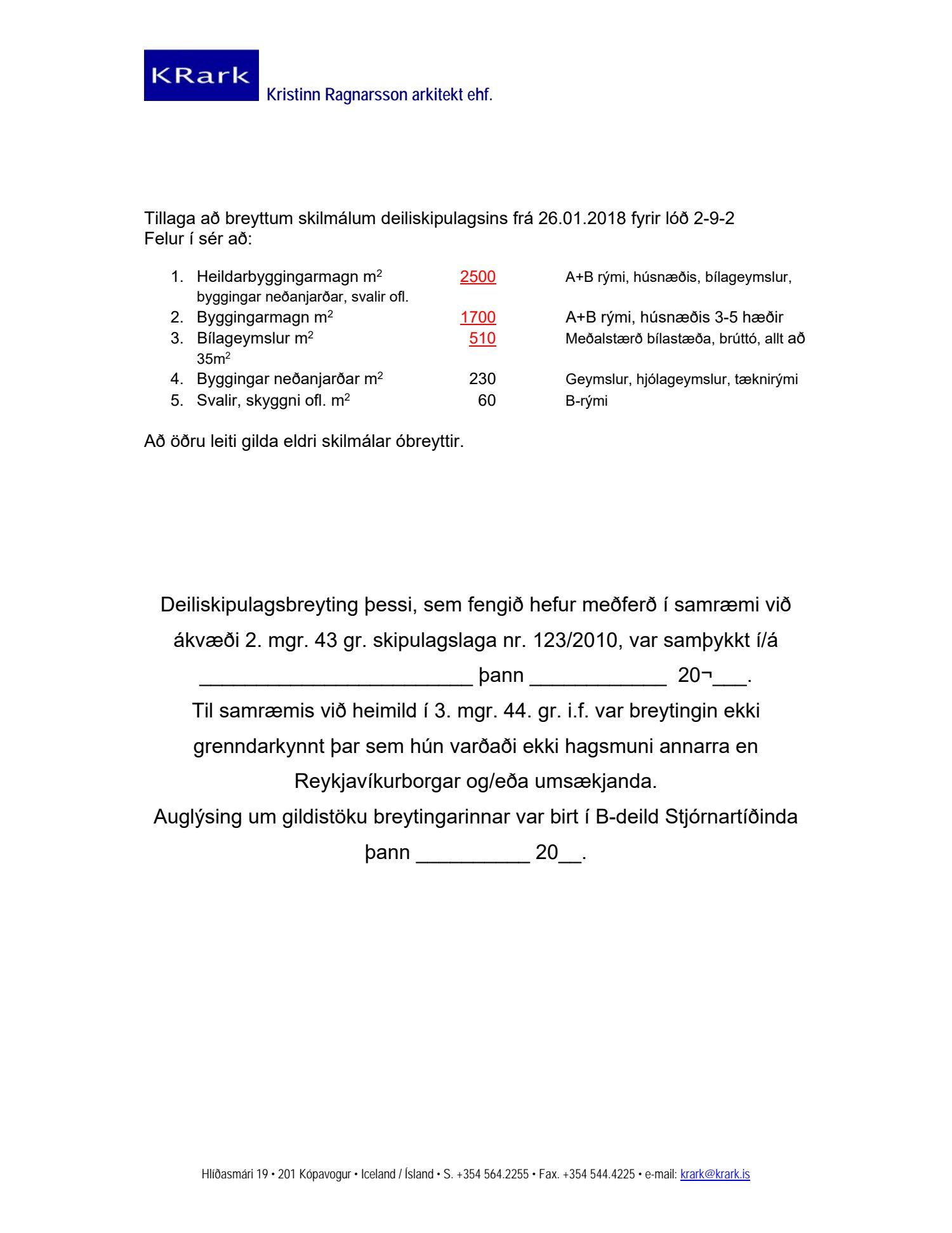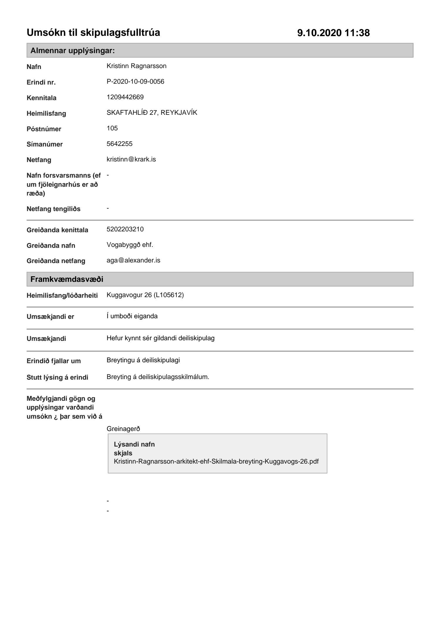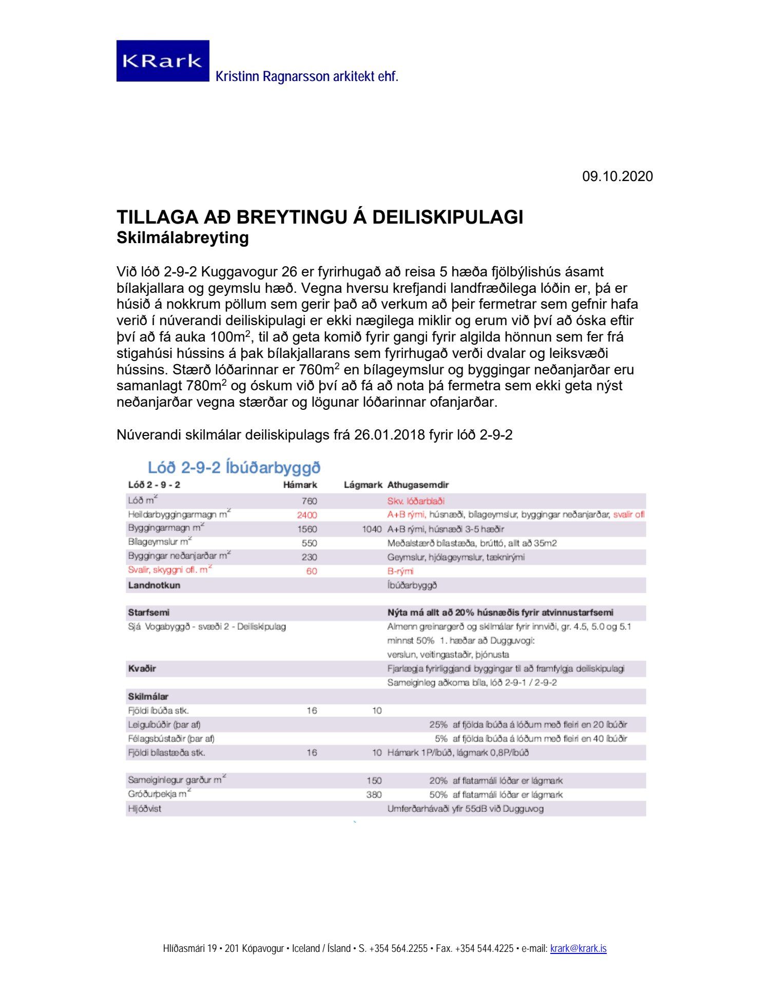 Lögð fram umsókn Kristins Ragnarssonar dags. 9. október 2020 varðandi breytingu á skilmálum deiliskipulags fyrir Vogabyggð svæði 2 vegna lóðar 2-9-2, Kuggavogur 26. Í breytingunni felst aukning á heildarbyggingarmagni lóðar um 100 m2, samkvæmt tillögu Kristins Ragnarssonar arkit. ehf. dags. 9. október 2020.