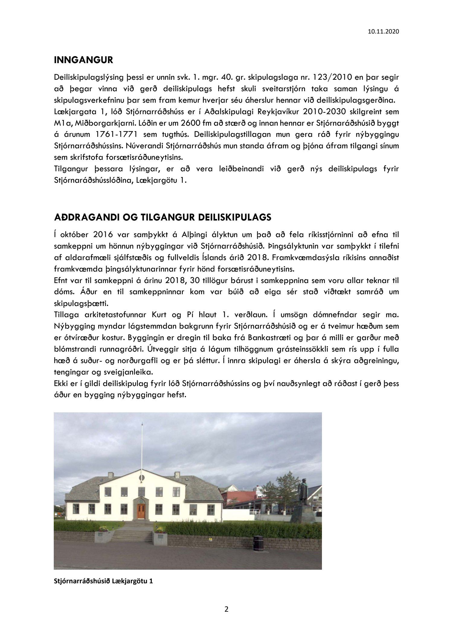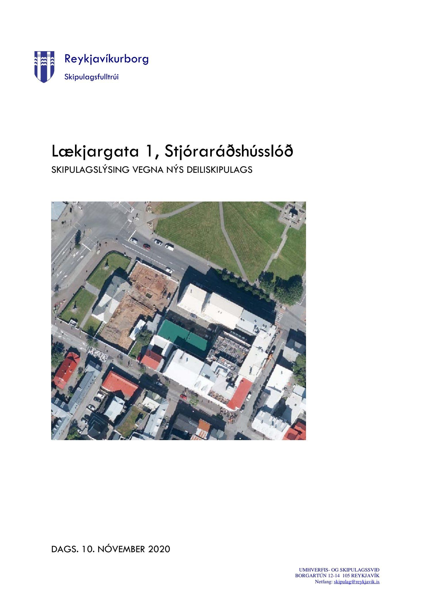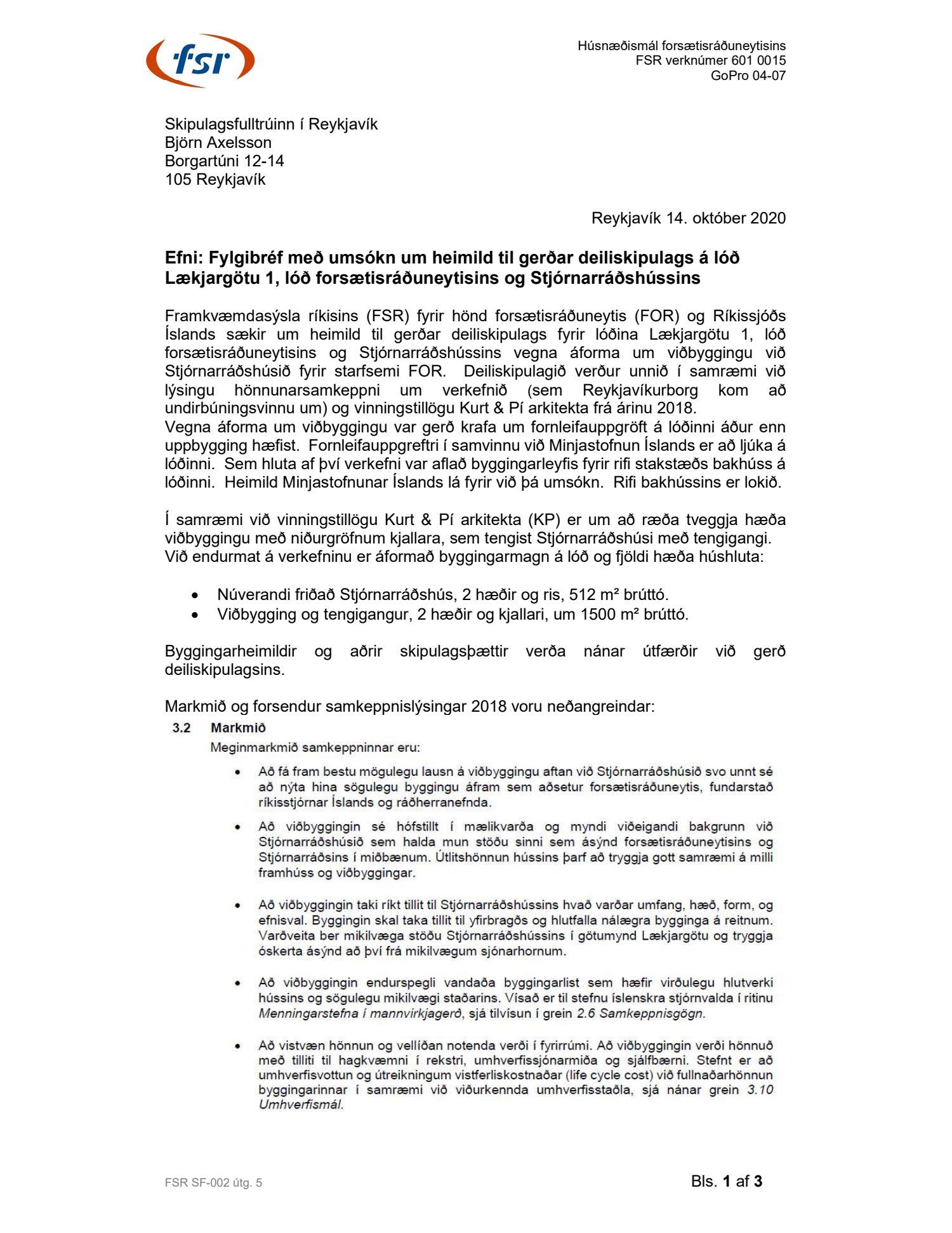 Að lokinni kynningu er lögð fram að nýju umsókn Framkvæmdasýslu ríkisins dags. 14. október 2020 ásamt bréfi dags. 14. október 2020 um nýtt deiliskipulag fyrir lóðina nr. 1 við Lækjargötu, lóð forsætisráðuneytisins og stjórnarráðshússins, vegna áforma um viðbyggingu við Stjórnarráðshúsið fyrir starfsemi forsætisráðuneytisins. Einnig er lögð fram vinningstillaga Kurt og Pí arkitekta frá árinu 2018 og umboð forsætisráðuneytisins dags. 14. október 2020. Jafnframt er lögð fram skipulagslýsing umhverfis- og skipulagssviðs, skipulagsfulltrúa, dags. 10. nóvember 2020. Lýsingin var kynnt til og með 18. desember 2020. Eftirtaldir sendu athugasemdir/umsögn: Herbertsprent ehf. dags. 7. desember 2020, Borgarsögusafn Reykjavíkur, dags. 16. desember 2020 og Skipulagsstofnun dags. 16. desember 2020.