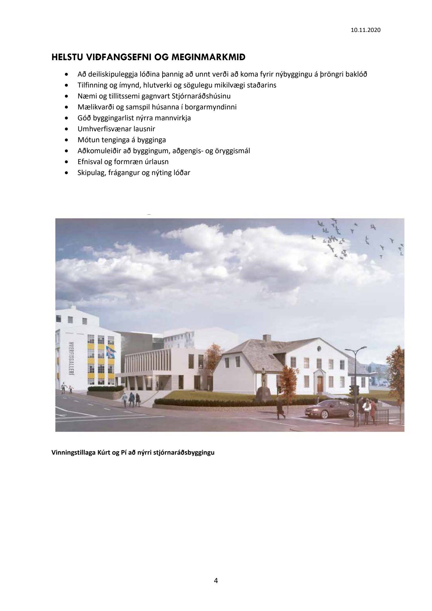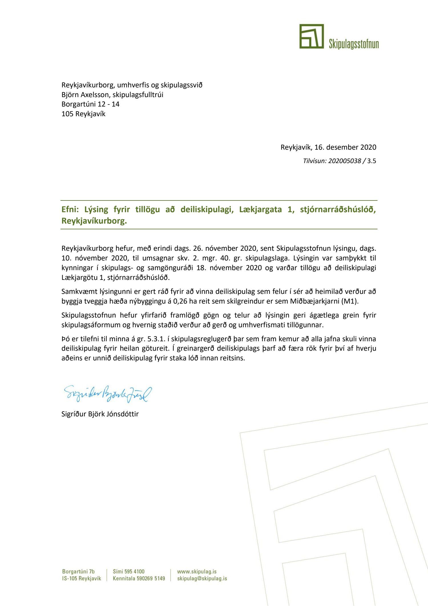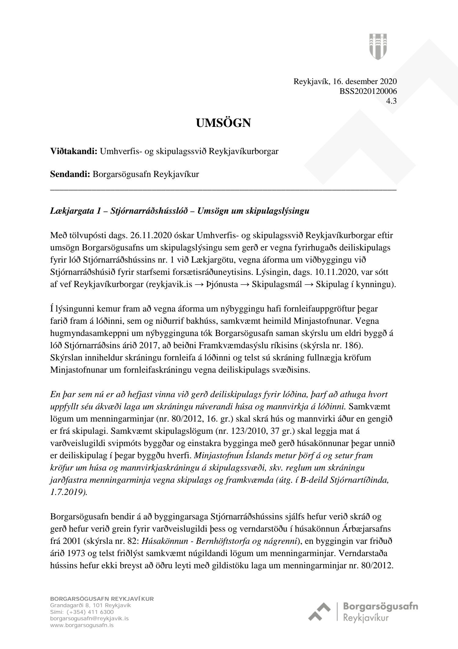 Að lokinni kynningu er lögð fram að nýju umsókn Framkvæmdasýslu ríkisins dags. 14. október 2020 ásamt bréfi dags. 14. október 2020 um nýtt deiliskipulag fyrir lóðina nr. 1 við Lækjargötu, lóð forsætisráðuneytisins og stjórnarráðshússins, vegna áforma um viðbyggingu við Stjórnarráðshúsið fyrir starfsemi forsætisráðuneytisins. Einnig er lögð fram vinningstillaga Kurt og Pí arkitekta frá árinu 2018 og umboð forsætisráðuneytisins dags. 14. október 2020. Jafnframt er lögð fram skipulagslýsing umhverfis- og skipulagssviðs, skipulagsfulltrúa, dags. 10. nóvember 2020. Lýsingin var kynnt til og með 18. desember 2020. Eftirtaldir sendu athugasemdir/umsögn: Herbertsprent ehf. dags. 7. desember 2020, Borgarsögusafn Reykjavíkur, dags. 16. desember 2020 og Skipulagsstofnun dags. 16. desember 2020.