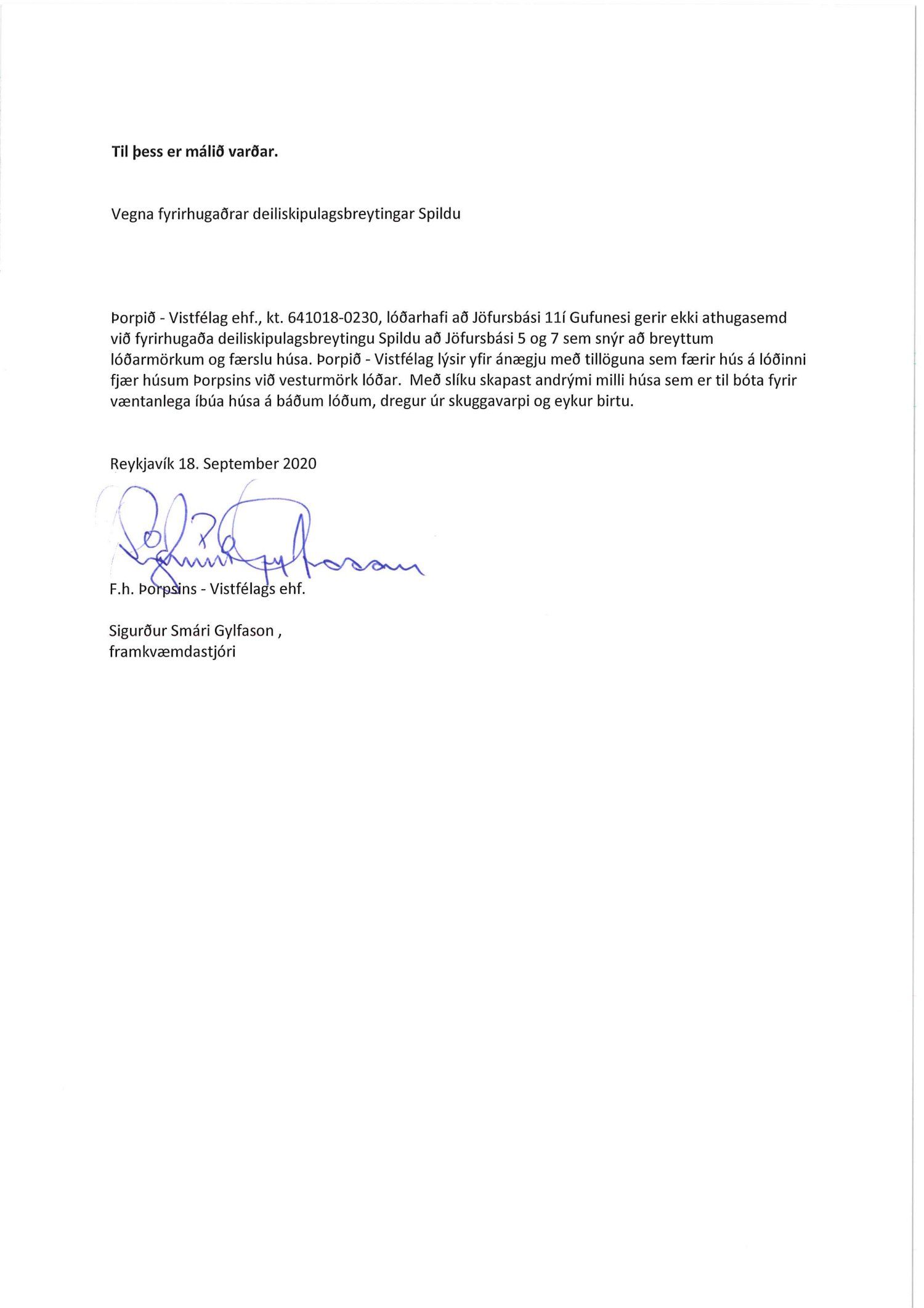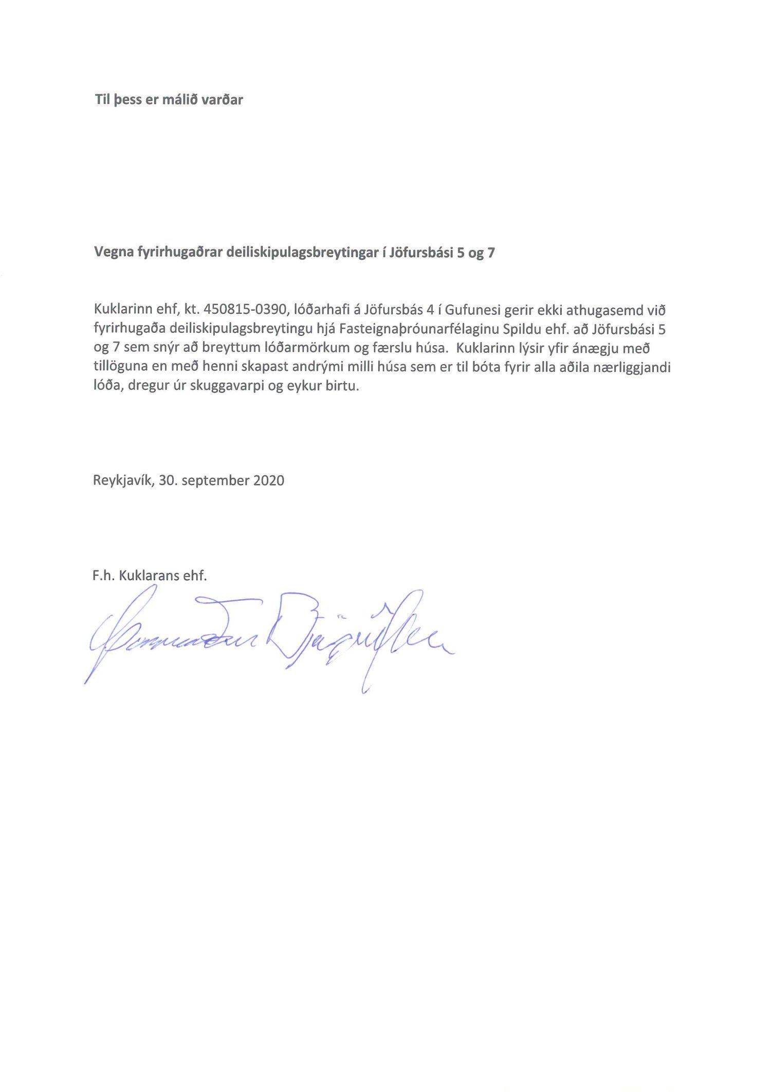 Lögð fram umsókn Helga Mars Hallgrímssonar dags. 21. október 2020 varðandi breytingu á deiliskipulagi Gufuness, áfangi 1, vegna lóðanna nr. 5 og 7 við Jöfursbás. Í breytingunni felst að lóðir stækka, byggingarmagn eykst, hámarksfjöldi íbúða verður skilgreindur, stærðir svalaganga og lágmarks salarhæð verði ekki takmörkuð umfram kvaðir byggingarreglugerðar, fallið verður frá skilmálum um að efstu hæðir þurfi að vera inndregnar og þess í stað verður heimilt að hafa húsin stölluð og að heimilt verði að svalir og útskot nái 2 m út fyrir byggingarreit nema að götu, samkvæmt uppdr. Arkþing/Nordic ehf. dags. 19. október 2020. Einnig er lagt fram samþykki lóðarhafa aðliggjandi lóða dags. 18. og 30. september 2020.