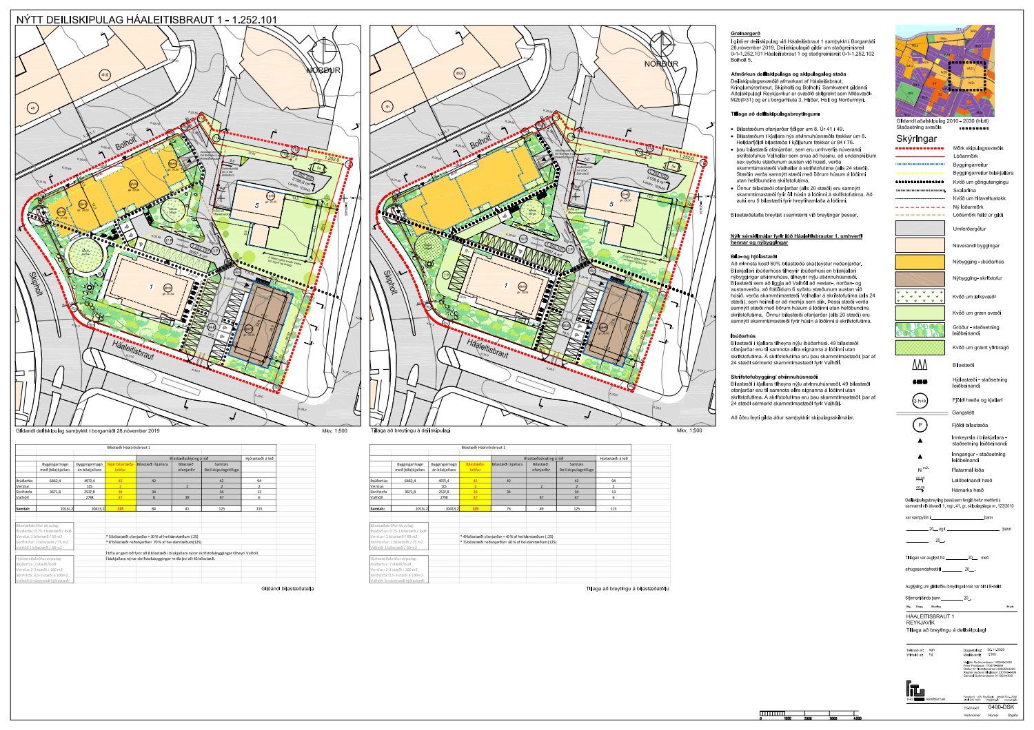 dags. 11. nóvember 2020 ásamt bréfi dags. 12. nóvember 2020 varðandi breytingu á deiliskipulagi lóðarinnar nr. 1 við Háaleitisbraut. Í breytingunni felst að fjölga bílastæðum ofanjarðar um 8, úr 41 í 49, fækka bílastæðum í kjallara um 8, úr 84 í 76, bílastæði ofanjarðar sem eru umhverfis núverandi skrifstofuhús Valhallar sem snúa að húsinu að undanskildum sex syðstu stæðunum austan við húsið verða skammtímastæði Valhallar á skrifstofutíma (alls 24 stæði), en stæðin verða samnýtt stæði með öðrum húsum á lóðinni utan hefðbundins skrifstofutíma ásamt því að önnur bílastæði ofanjarðar verða samnýtt skammtímastæði fyrir öll húsin á lóðinni á skrifstofutíma að auki eru 5 bílastæði fyrir hreyfihamlaða á lóðinni, samkvæmt uppdr.