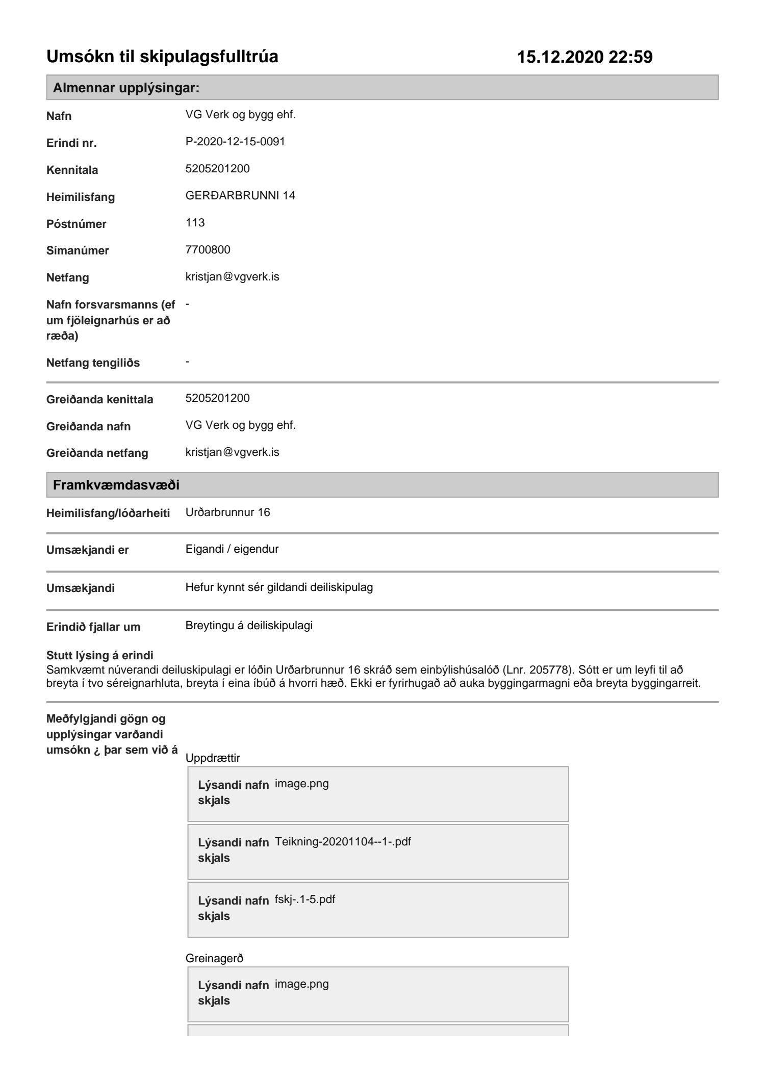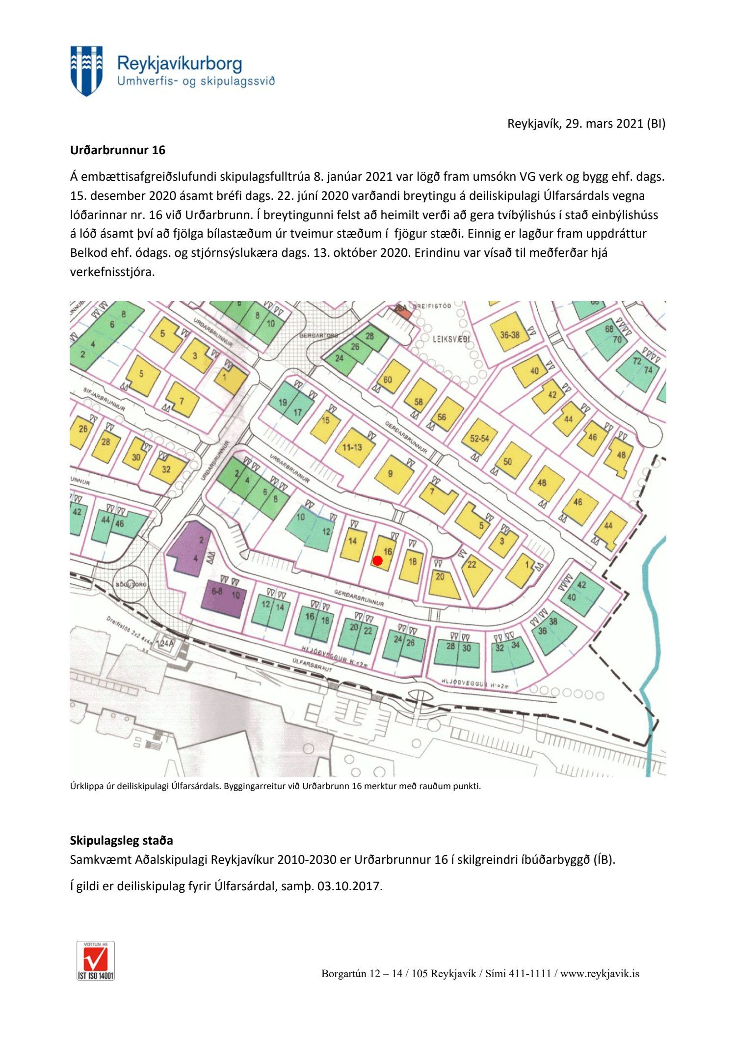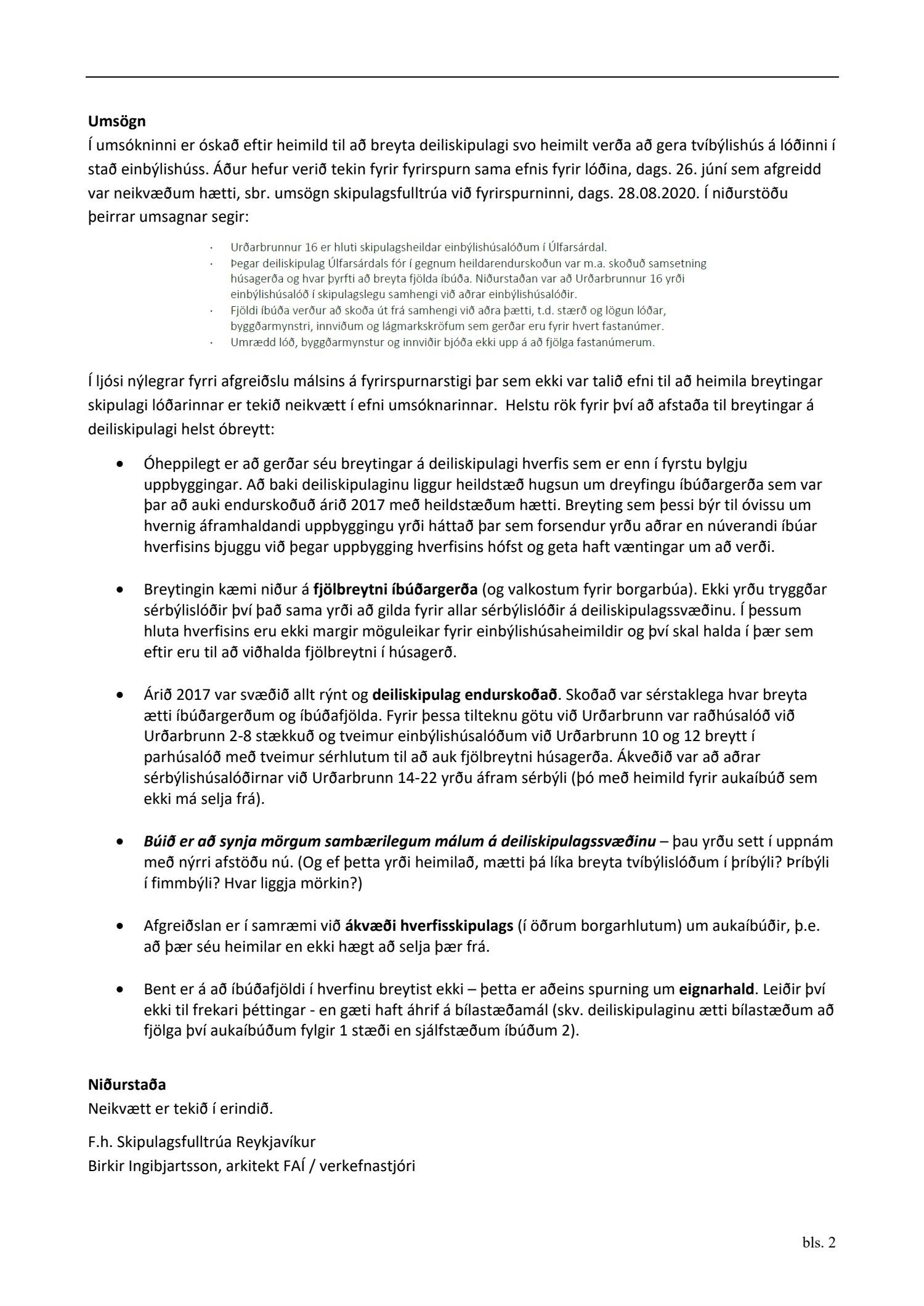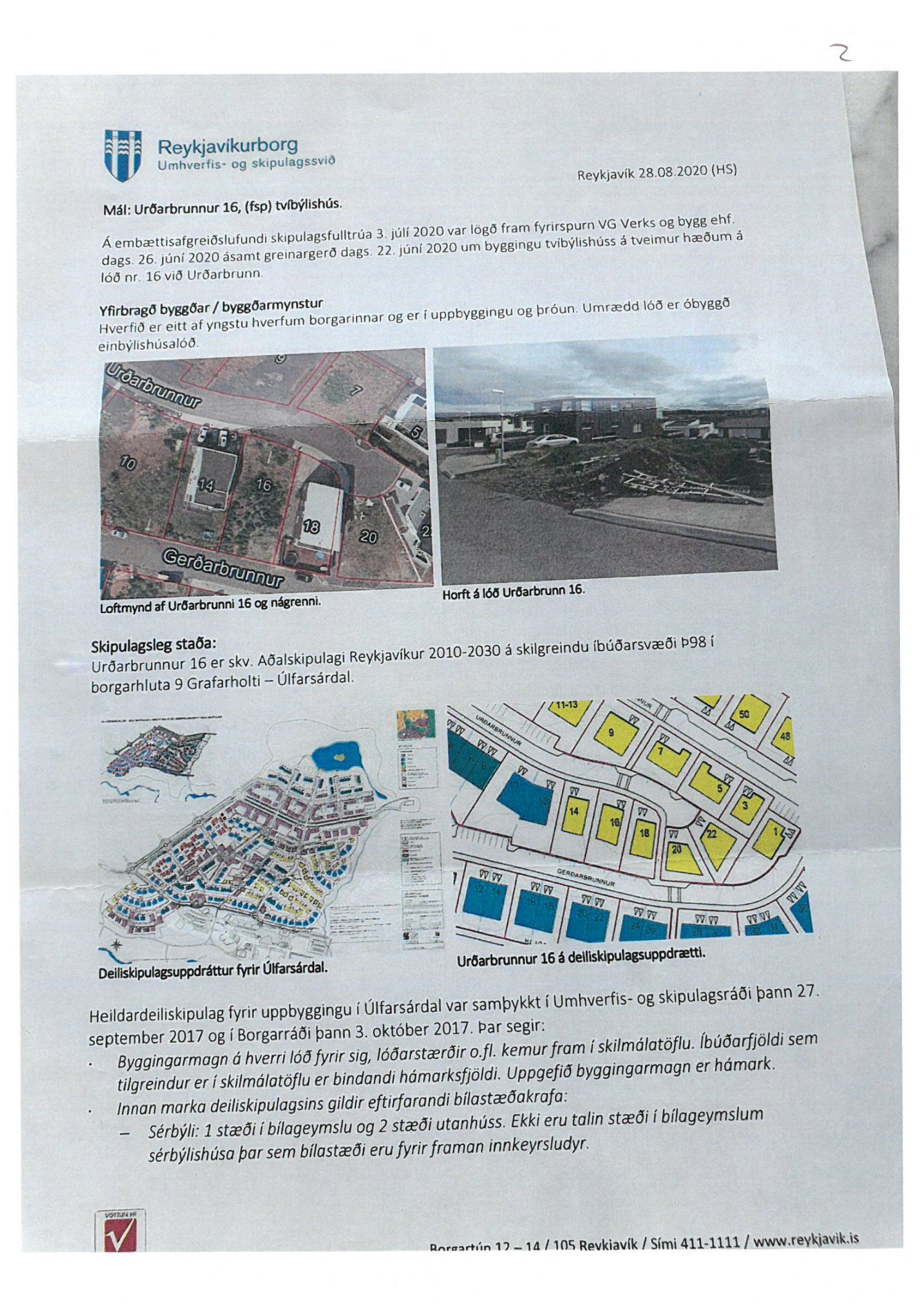 Lögð fram umsókn VG verk og bygg ehf. dags. 15. desember 2020 ásamt bréfi dags. 22. júní 2020 varðandi breytingu á deiliskipulagi Úlfarsárdals vegna lóðarinnar nr. 16 við Urðarbrunn. Í breytingunni felst að heimilt verði að gera tvíbýlishús í stað einbýlishúss á lóð ásamt því að fjölga bílastæðum úr tveimur stæðum í fjögur stæði. Einnig er lagður fram uppdráttur