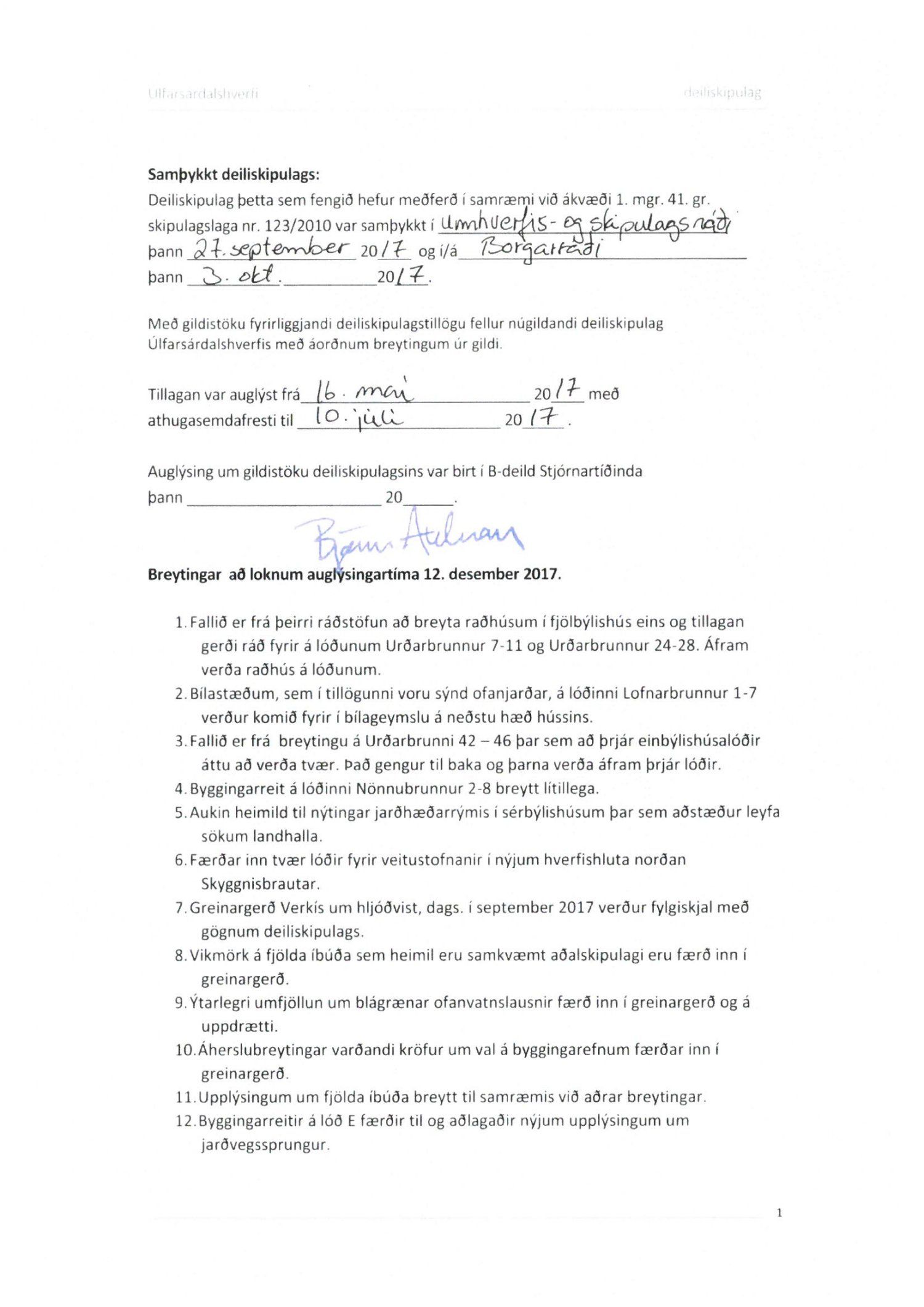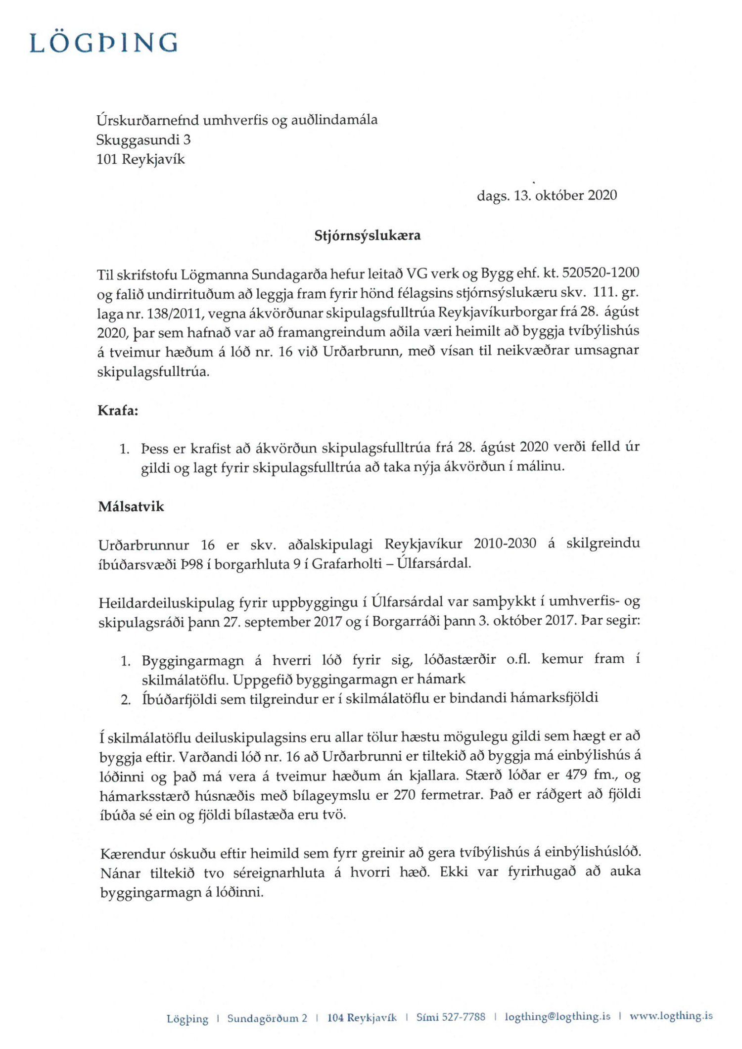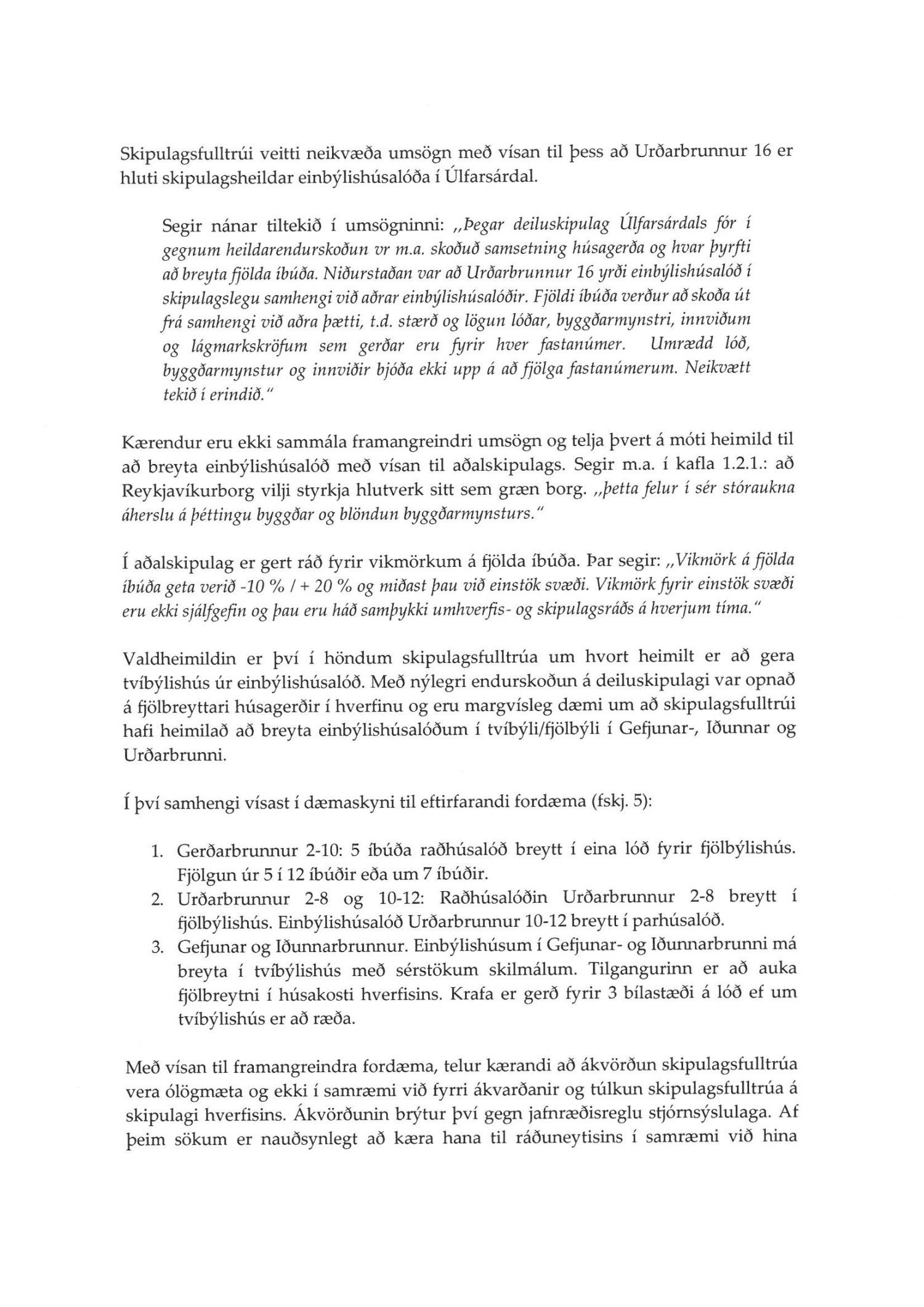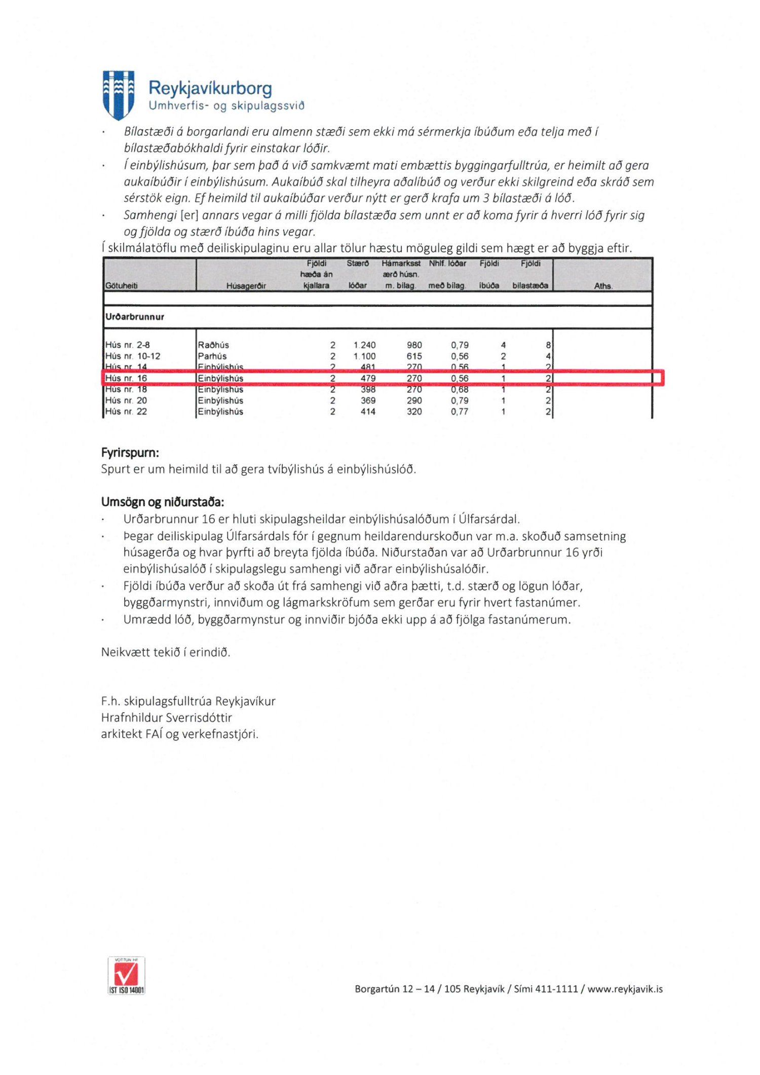Lögð fram umsókn VG verk og bygg ehf. dags. 15. desember 2020 ásamt bréfi dags. 22. júní 2020 varðandi breytingu á deiliskipulagi Úlfarsárdals vegna lóðarinnar nr. 16 við Urðarbrunn. Í breytingunni felst að heimilt verði að gera tvíbýlishús í stað einbýlishúss á lóð ásamt því að fjölga bílastæðum úr tveimur stæðum í fjögur stæði. Einnig er lagður fram uppdráttur