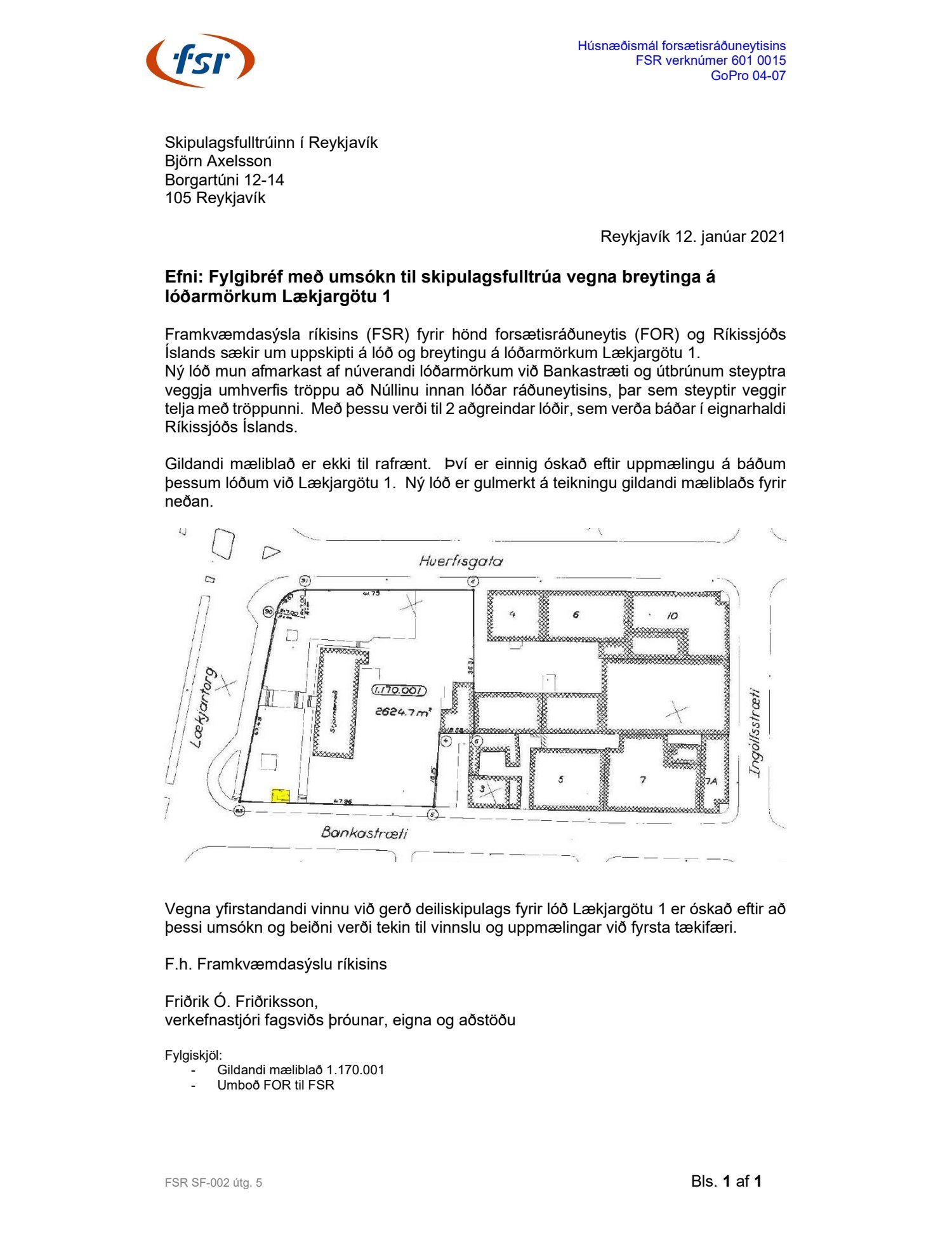 Lögð fram umsókn Framkvæmdasýslu ríkisins dags. 12. janúar 2021 ásamt bréfi dags. 12. janúar 2021 um breytingu á lóðarmörkum lóðarinnar nr. 1 við Lækjargötu. Einnig er lagt fram umboð Framkvæmdasýslu ríkisins dags. 14. október 2020.