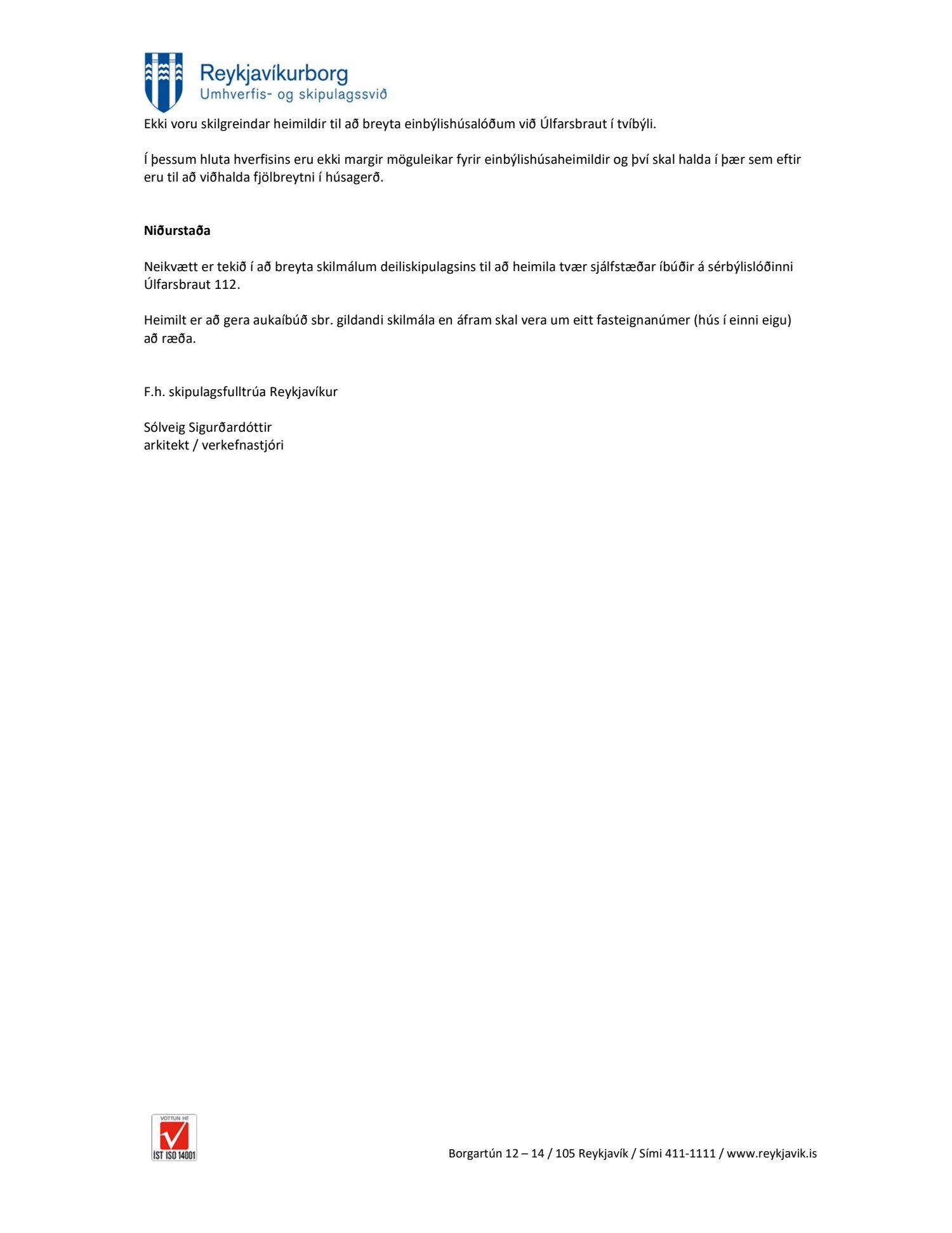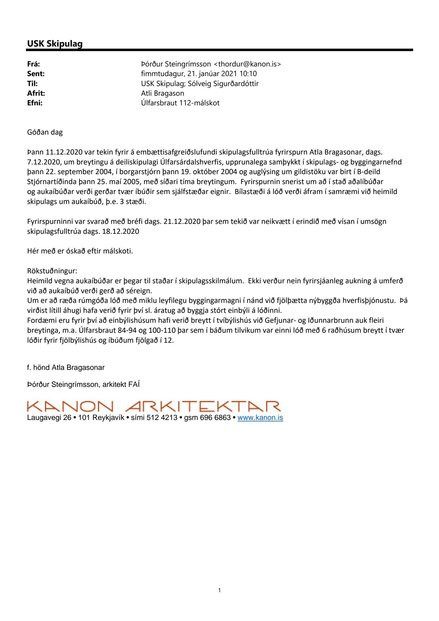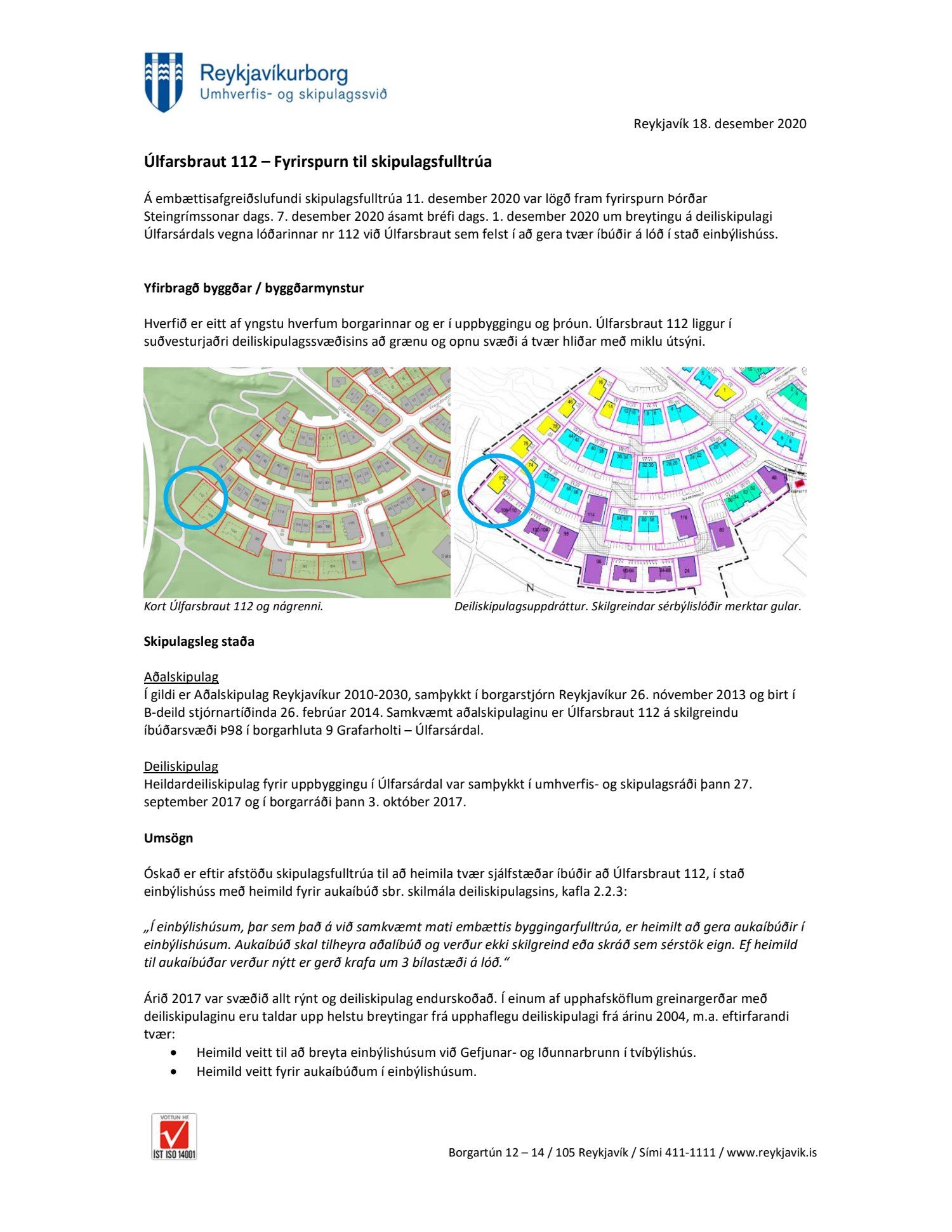 Lagt fram málskot Þórðar Steingrímssonar f.h. Atla Bragasonar dags. 21. janúar 2021 vegna neikvæðrar afgreiðslu skipulagsfulltrúa frá 18. desember 2020 um breytingu á deiliskipulagi Úlfarsárdals vegna lóðarinnar nr. 112 við Úlfarsbraut sem felst í að gera tvær íbúðir á lóð í stað einbýlishús. Einnig er lögð fram umsögn skipulagsfulltrúa dags. 18. desember 2020.